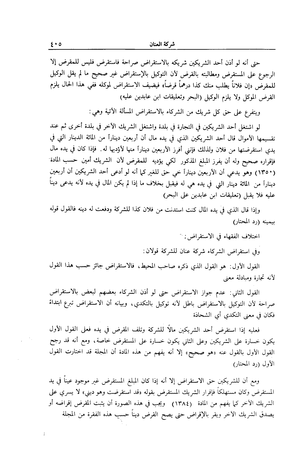 حَتَّى أَنَّهُ لَوْ أَذِنَ أَحَدُ الشَّرِيكَيْنِ شَرِيكَهُ بِالِاسْتِقْرَاضِ صَرَاحَةً فَاسْتَقْرَضَ فَلَيْسَ لِلْمُقْرِضِ إلَّا الرُّجُوعُ عَلَى الْمُسْتَقْرِضِ وَمُطَالَبَتُهُ بِالْقَرْضِ لِأَنَّ التَّوْكِيلَ بِالِاسْتِقْرَاضِ غَيْرُ صَحِيحٍ مَا لَمْ يَقُلْ الْوَكِيلُ لِلْمُقْرِضِ " إنَّ فُلَانًا يَطْلُبُ مِنْك كَذَا دِرْهَمًا قَرْضًا "، فَيُضِيفُ الِاسْتِقْرَاضَ لِمُوَكِّلِهِ فَفِي هَذَا الْحَالِ يَلْزَمُ الْقَرْضُ الْمُوَكِّلَ وَلَا يَلْزَمُ الْوَكِيلَ (الْبَحْرُ وَتَعْلِيقَاتُ ابْنِ عَابِدِينَ عَلَيْهِ) وَيَتَفَرَّعُ عَلَى حَقِّ كُلِّ شَرِيكٍ مِنْ الشُّرَكَاءِ بِالِاسْتِقْرَاضِ الْمَسْأَلَةُ الْآتِيَةُ وَهِيَ: