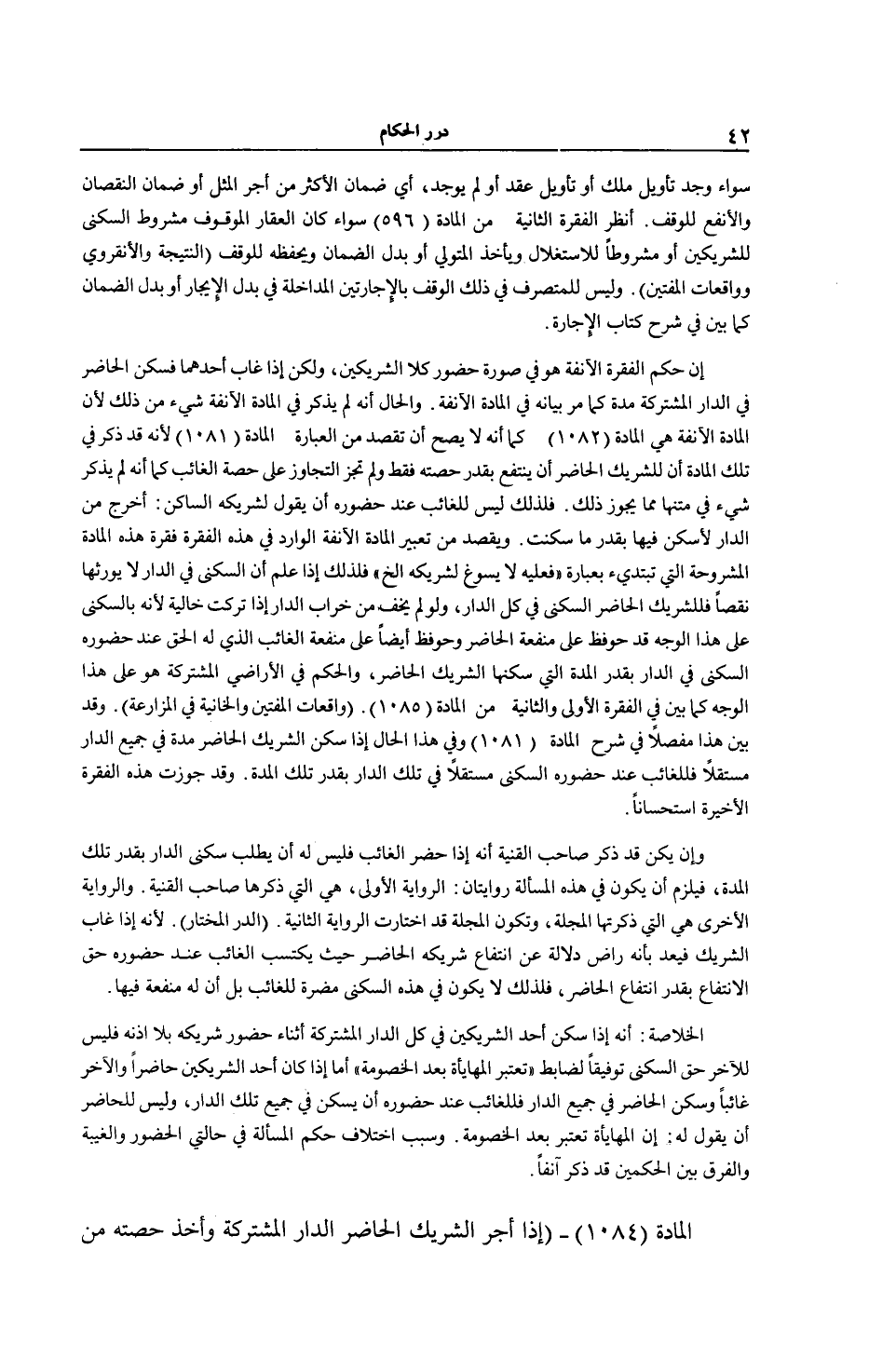 وَالْحَالُ أَنَّهُ لَمْ يُذْكَرْ فِي الْمَادَّةِ الْآنِفَةِ شَيْءٌ مِنْ ذَلِكَ لِأَنَّ الْمَادَّةَ الْآنِفَةَ هِيَ الْمَادَّةُ (82 1) كَمَا أَنَّهُ لَا يَصِحُّ أَنْ تَقْصِدَ مِنْ الْعِبَارَةِ الْمَادَّةِ (1081) لِأَنَّهُ قَدْ ذَكَرَ فِي تِلْكَ الْمَادَّةِ أَنَّ لِلشَّرِيكِ الْحَاضِرِ أَنْ يَنْتَفِعَ بِقَدْرِ حِصَّتِهِ فَقَطْ وَلَمْ تُجِزْ التَّجَاوُزَ عَلَى حِصَّةِ الْغَائِبِ كَمَا أَنَّهُ لَمْ يُذْكَرْ شَيْءٌ فِي مَتْنِهَا مِمَّا يُجَوِّزُ ذَلِكَ فَلِذَلِكَ لَيْسَ لِلْغَائِبِ عِنْدَ حُضُورِهِ أَنْ يَقُولَ لِشَرِيكِهِ: اُخْرُجْ مِنْ الدَّارِ لِأَسْكُنَ فِيهَا بِقَدْرِ مَا سَكَنْتَ. وَيُقْصَدُ مِنْ تَعْبِيرِ الْمَادَّةِ الْآنِفَةِ الْوَارِدَ فِي هَذِهِ الْفِقْرَةِ فِقْرَةُ هَذِهِ الْمَادَّةِ الْمَشْرُوحَةِ الَّتِي تَبْتَدِئُ بِعِبَارَةِ ((فَعَلَيْهِ لَا يَسُوغُ لِشَرِيكِهِ إلَخْ) فَلِذَلِكَ إذَا عَلِمَ أَنَّ السُّكْنَى فِي الدَّارِ لَا يُورَثُهَا نَقْصًا فَلِلشَّرِيكِ الْحَاضِرِ السُّكْنَى فِي كُلِّ الدَّارِ، وَلَوْ لَمْ يَخَفْ مِنْ خَرَابِ الدَّارِ إذَا تُرِكَتْ خَالِيَةً لِأَنَّهُ بِالسُّكْنَى عَلَى هَذَا الْوَجْهِ قَدْ حُوفِظَ عَلَى مَنْفَعَةِ الْحَاضِرِ وَحُوفِظَ أَيْضًا عَلَى مَنْفَعَةِ الْغَائِبِ الَّذِي لَهُ الْحَقُّ عِنْدَ حُضُورِهِ السُّكْنَى فِي الدَّارِ بِقَدْرِ الْمُدَّةِ الَّتِي سَكَنَهَا الشَّرِيكُ الْحَاضِرُ، وَالْحُكْمُ فِي الْأَرَاضِي الْمُشْتَرَكَةِ هُوَ عَلَى هَذَا الْوَجْهِ كَمَا بَيَّنَ فِي الْفِقْرَةِ الْأُولَى وَالثَّانِيَةِ مِنْ الْمَادَّةِ (85 0 1) (وَاقِعَاتُ الْمُفْتِينَ وَالْخَانِيَّةُ فِي الْمُزَارَعَةِ) وَقَدْ بُيِّنَ هَذَا مُفَصَّلًا فِي شَرْحِ الْمَادَّةِ (81 0 1) وَفِي هَذَا الْحَالِ إذَا سَكَنَ الشَّرِيكُ الْحَاضِرُ مُدَّةً فِي جَمِيعِ الدَّارِ مُسْتَقِلًّا فَلِلْغَائِبِ عِنْدَ حُضُورِهِ السُّكْنَى مُسْتَقِلًّا فِي تِلْكَ الدَّارِ بِقَدْرِ تِلْكَ الْمُدَّةِ وَقَدْ جَوَّزَتْ هَذِهِ الْفِقْرَةُ الْأَخِيرَةُ اسْتِحْسَانًا وَإِنْ يَكُنْ قَدْ ذَكَرَ صَاحِبُ الْقُنْيَةِ أَنَّهُ إذَا حَضَرَ الْغَائِبُ فَلَيْسَ لَهُ أَنْ يَطْلُبَ سُكْنَى الدَّارِ بِقَدْرِ تِلْكَ الْمُدَّةِ، فَيَلْزَمُ أَنْ يَكُونَ فِي هَذِهِ الْمَسْأَلَةِ رِوَايَتَانِ: الرِّوَايَةُ الْأُولَى، هِيَ الَّتِي ذَكَرَهَا صَاحِبُ الْقُنْيَةِ وَالرِّوَايَةُ الْأُخْرَى هِيَ الَّتِي ذَكَرَتْهَا الْمَجَلَّةُ، وَتَكُونُ الْمَجَلَّةُ قَدْ اخْتَارَتْ الرِّوَايَةَ الثَّانِيَةَ (الدُّرُّ الْمُخْتَارُ) لِأَنَّهُ إذَا غَابَ الشَّرِيكُ فَيُعَدُّ بِأَنَّهُ رَاضٍ دَلَالَةً عَنْ انْتِفَاعِ شَرِيكِهِ الْحَاضِرِ حَيْثُ يَكْتَسِبُ الْغَائِبُ عِنْدَ حُضُورِهِ حَقَّ الِانْتِفَاعِ بِقَدْرِ انْتِفَاعِ الْحَاضِرِ، فَلِذَلِكَ لَا يَكُونُ فِي هَذِهِ السُّكْنَى مَضَرَّةٌ لِلْغَائِبِ بَلْ إنَّ لَهُ مَنْفَعَةً فِيهَا.
