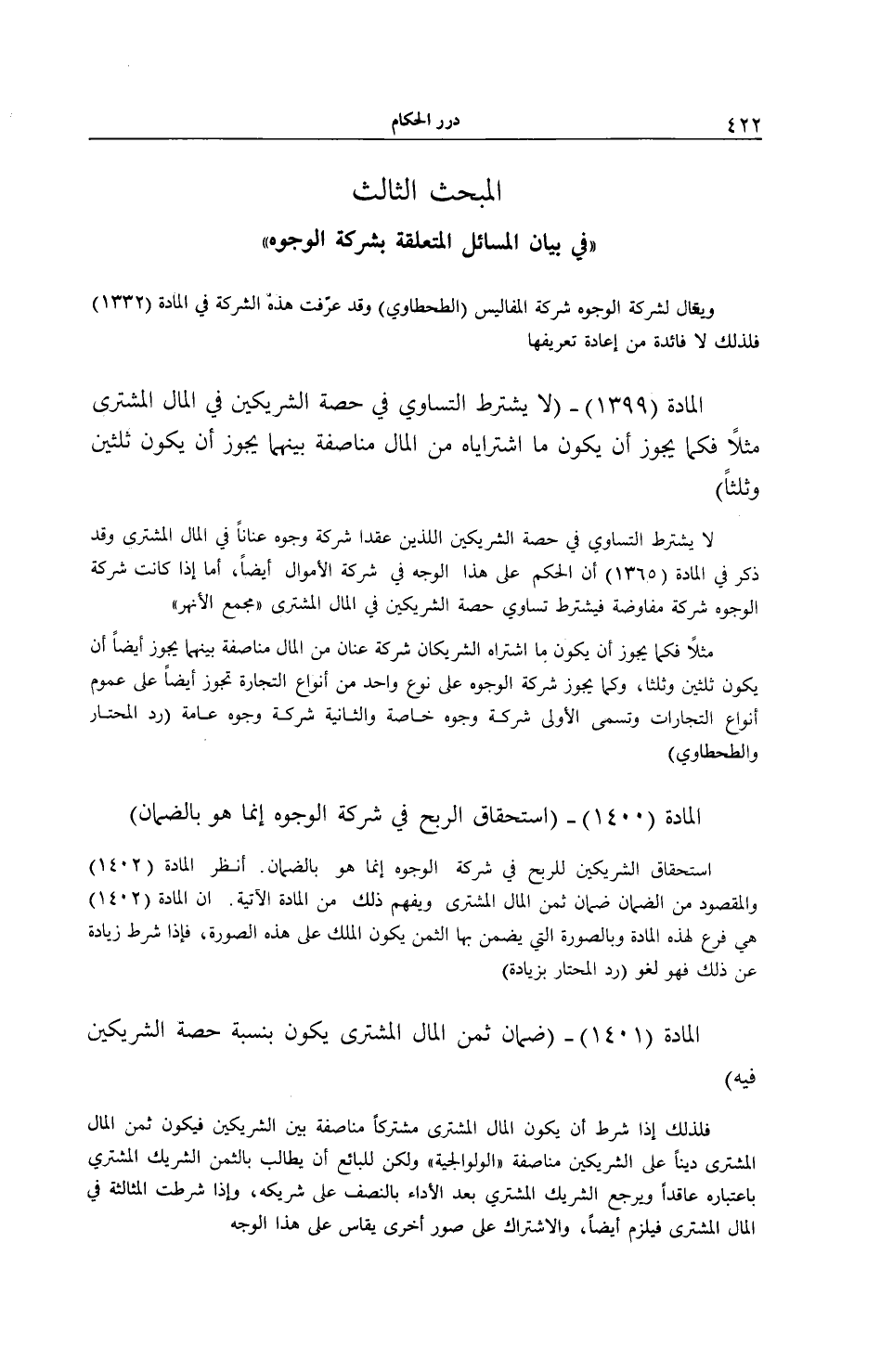 اسْتِحْقَاقُ الشَّرِيكَيْنِ لِلرِّبْحِ فِي شَرِكَةِ الْوُجُوهِ إنَّمَا هُوَ بِالضَّمَانِ. اُنْظُرْ الْمَادَّةَ (1402) وَالْمَقْصُودُ مِنْ الضَّمَانِ ضَمَانُ ثَمَنِ الْمَالِ الْمُشْتَرَى وَيُفْهَمُ ذَلِكَ مِنْ الْمَادَّةِ الْآتِيَةِ. إنَّ الْمَادَّةَ (1402) هِيَ فَرْعٌ لِهَذِهِ الْمَادَّةِ وَبِالصُّورَةِ الَّتِي يُضْمَنُ بِهَا الثَّمَنُ يَكُونُ الْمِلْكُ عَلَى هَذِهِ الصُّورَةِ، فَإِذَا شُرِطَ زِيَادَةٌ عَنْ ذَلِكَ فَهُوَ لَغْوٌ (رَدُّ الْمُحْتَارِ بِزِيَادَةٍ)