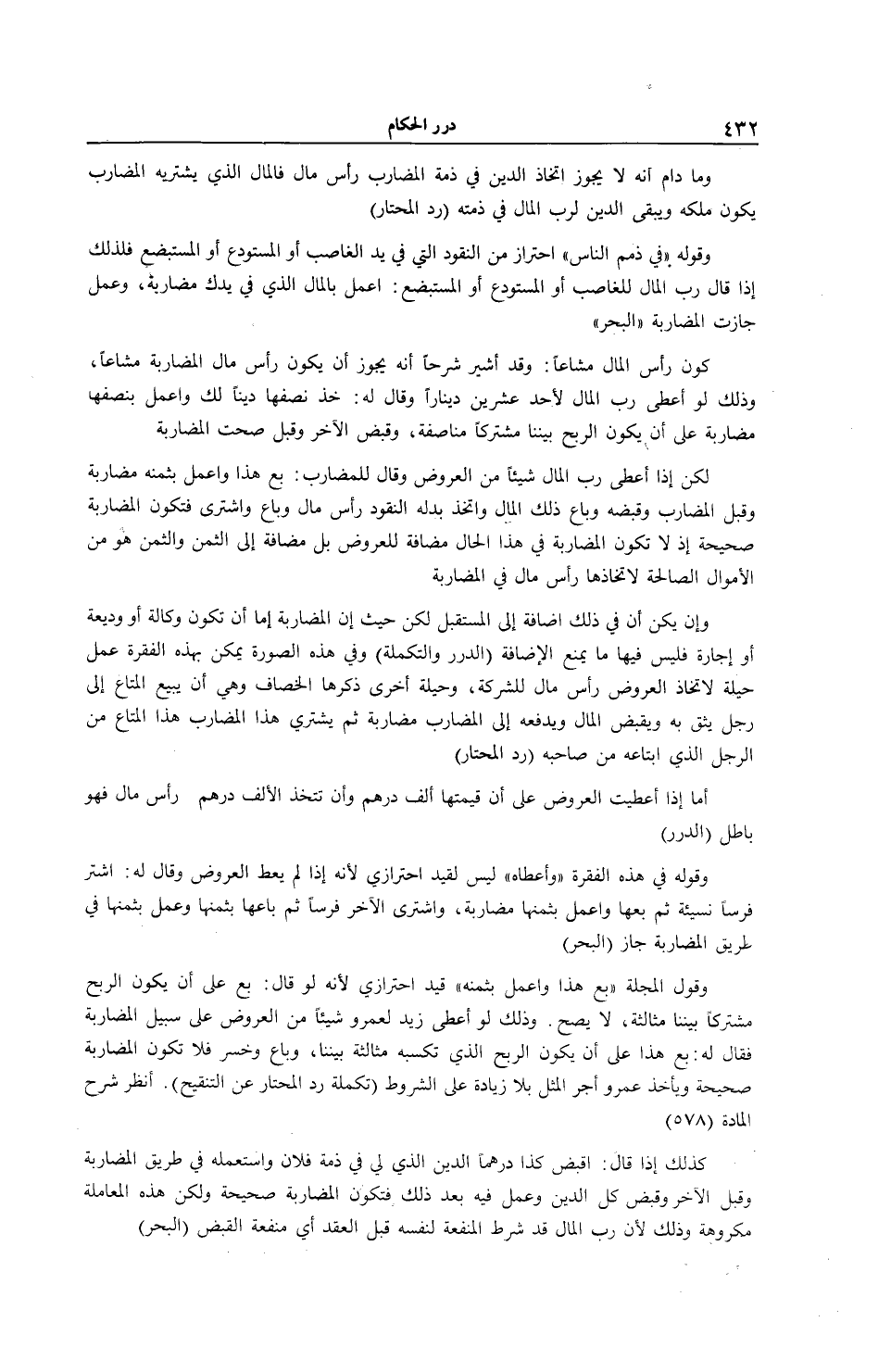 وَمَا دَامَ أَنَّهُ لَا يَجُوزُ اتِّخَاذُ الدَّيْنِ فِي ذِمَّةِ الْمُضَارِبِ رَأْسَ مَالٍ فَالْمَالُ الَّذِي يَشْتَرِيهِ الْمُضَارِبُ يَكُونُ مِلْكُهُ وَيَبْقَى الدَّيْنُ لِرَبِّ الْمَالِ فِي ذِمَّتِهِ (رَدُّ الْمُحْتَارِ) وَقَوْلُهُ (فِي ذِمَمِ النَّاسِ) احْتِرَازٌ مِنْ النُّقُودِ الَّتِي فِي يَدِ الْغَاصِبِ أَوْ الْمُسْتَوْدَعِ أَوْ الْمُسْتَبْضِعِ فَلِذَلِكَ إذَا قَالَ رَبُّ الْمَالِ لِلْغَاصِبِ أَوْ الْمُسْتَوْدَعِ أَوْ الْمُسْتَبْضِعِ: اعْمَلْ بِالْمَالِ الَّذِي فِي يَدِكَ مُضَارَبَةً، وَعَمِلَ جَازَتْ الْمُضَارَبَةُ (الْبَحْرُ) كَوْنُ رَأْسِ الْمَالِ مُشَاعًا: وَقَدْ أُشِيرَ شَرْحًا أَنَّهُ يَجُوزُ أَنْ يَكُونَ رَأْسُ مَالِ الْمُضَارَبَةِ مُشَاعًا، وَذَلِكَ لَوْ أَعْطَى رَبُّ الْمَالِ لِأَحَدٍ عِشْرِينَ دِينَارًا وَقَالَ لَهُ: خُذْ نِصْفَهَا دَيْنًا لَك وَاعْمَلْ بِنِصْفِهَا مُضَارَبَةً عَلَى أَنْ يَكُونَ الرِّبْحُ بَيْنَنَا مُشْتَرَكًا مُنَاصَفَةً، وَقَبَضَ الْآخَرُ وَقَبِلَ صَحَّتْ الْمُضَارَبَةُ لَكِنْ إذَا أَعْطَى رَبُّ الْمَالِ شَيْئًا مِنْ الْعُرُوضِ وَقَالَ لِلْمُضَارِبِ: بِعْ هَذَا وَاعْمَلْ بِثَمَنِهِ مُضَارَبَةً وَقَبِلَ الْمُضَارِبُ وَقَبَضَهُ وَبَاعَ ذَلِكَ الْمَالَ وَاِتَّخَذَ بَدَلَ النُّقُودِ رَأْسَ مَالٍ وَبَاعَ وَاشْتَرَى فَتَكُونُ الْمُضَارَبَةُ صَحِيحَةً إذْ لَا تَكُونُ الْمُضَارَبَةُ فِي هَذَا الْحَالِ مُضَافَةً لِلْعُرُوضِ بَلْ مُضَافَةً إلَى الثَّمَنِ وَالثَّمَنُ هُوَ مِنْ الْأَمْوَالِ الصَّالِحَةِ لِاِتِّخَاذِهَا رَأْسَ مَالٍ فِي الْمُضَارَبَةِ وَإِنْ يَكُنْ أَنَّ فِي ذَلِكَ إضَافَةً إلَى الْمُسْتَقْبَلِ لَكِنْ حَيْثُ إنَّ الْمُضَارَبَةَ إمَّا أَنْ تَكُونَ وَكَالَةً أَوْ وَدِيعَةً أَوْ إجَارَةً فَلَيْسَ فِيهَا مَا يَمْنَعُ الْإِضَافَةَ (الدُّرَرُ وَالتَّكْمِلَةُ) وَفِي هَذِهِ الصُّورَةِ يُمْكِنُ بِهَذِهِ الْفِقْرَةِ عَمَلُ حِيلَةٍ لِاِتِّخَاذِ الْعُرُوضِ رَأْسَ مَالٍ لِلشَّرِكَةِ، وَحِيلَةٌ أُخْرَى ذَكَرَهَا الْخَصَّافُ وَهِيَ أَنْ يَبِيعَ الْمَتَاعَ إلَى رَجُلٍ يَثِقُ بِهِ وَيَقْبِضَ الْمَالَ وَيَدْفَعَهُ إلَى الْمُضَارِبِ مُضَارَبَةً