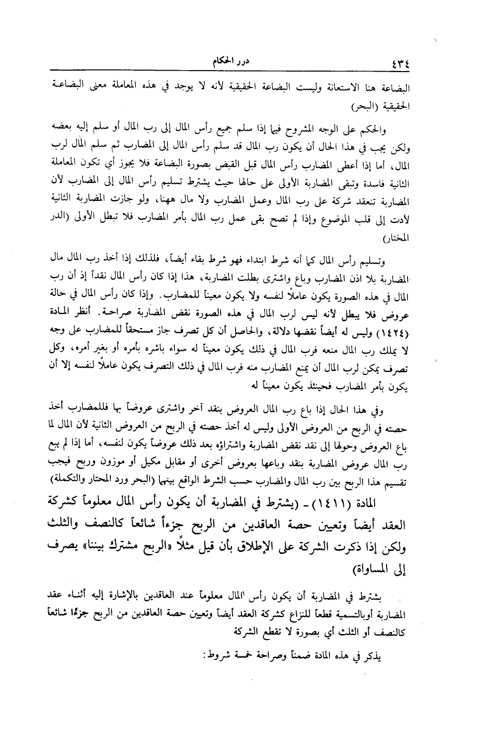 الْمَادَّةُ (1411) - (يُشْتَرَطُ فِي الْمُضَارَبَةِ أَنْ يَكُونَ رَأْسُ الْمَالِ مَعْلُومًا كَشَرِكَةِ الْعَقْدِ أَيْضًا وَتَعْيِينُ حِصَّةِ الْعَاقِدَيْنِ مِنْ الرِّبْحِ جُزْءًا شَائِعًا كَالنِّصْفِ وَالثُّلُثِ وَلَكِنْ إذَا ذُكِرَتْ الشَّرِكَةُ عَلَى الْإِطْلَاقِ بِأَنْ قِيلَ مَثَلًا " الرِّبْحُ مُشْتَرَكٌ بَيْنَنَا " يُصْرَفُ إلَى الْمُسَاوَاةِ) يُشْتَرَطُ فِي الْمُضَارَبَةِ أَنْ يَكُونَ رَأْسُ الْمَالِ مَعْلُومًا عِنْدَ الْعَاقِدَيْنِ بِالْإِشَارَةِ إلَيْهِ أَثْنَاءَ عَقْدِ الْمُضَارَبَةِ أَوْ بِالتَّسْمِيَةِ قَطْعًا لِلنِّزَاعِ كَشَرِكَةِ الْعَقْدِ أَيْضًا وَتَعْيِينُ حِصَّةِ الْعَاقِدَيْنِ مِنْ الرِّبْحِ جُزْءًا شَائِعًا كَالنِّصْفِ أَوْ الثُّلُثِ أَيْ بِصُورَةٍ لَا تَقْطَعُ الشَّرِكَةَ يُذْكَرُ فِي هَذِهِ الْمَادَّةِ ضِمْنًا وَصَرَاحَةً خَمْسَةُ شُرُوطٍ: