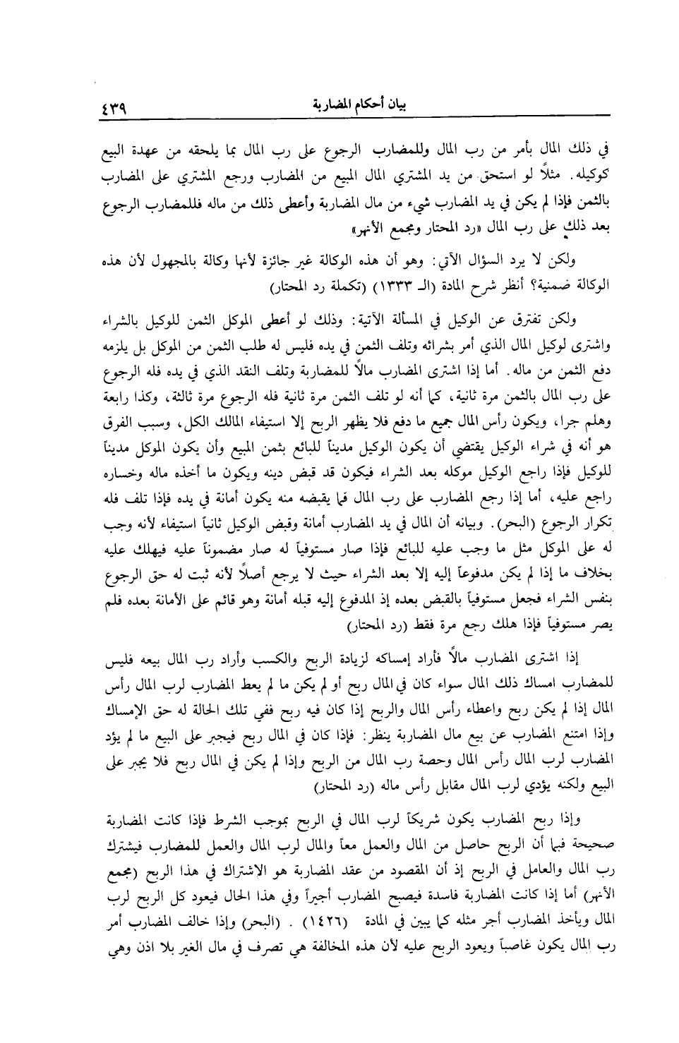 فِي ذَلِكَ الْمَالِ بِأَمْرٍ مِنْ رَبِّ الْمَالِ وَلِلْمُضَارِبِ الرُّجُوعُ عَلَى رَبِّ الْمَالِ بِمَا يَلْحَقُهُ مِنْ عُهْدَةِ الْبَيْعِ كَوَكِيلِهِ. مَثَلًا لَوْ اسْتَحَقَّ مِنْ يَدِ الْمُشْتَرِي الْمَالَ الْمَبِيعَ مِنْ الْمُضَارِبِ وَرَجَعَ الْمُشْتَرِي عَلَى الْمُضَارِبِ بِالثَّمَنِ فَإِذَا لَمْ يَكُنْ فِي يَدِ الْمُضَارِبِ شَيْءٌ مِنْ مَالِ الْمُضَارَبَةِ وَأَعْطَى ذَلِكَ مِنْ مَالِهِ فَلِلْمُضَارِبِ الرُّجُوعُ بَعْدَ ذَلِكَ عَلَى رَبِّ الْمَالِ (رَدُّ الْمُحْتَارِ وَمَجْمَعُ الْأَنْهُرِ) وَلَكِنْ لَا يَرِدُ السُّؤَالُ الْآتِي: وَهُوَ أَنَّ هَذِهِ الْوَكَالَةَ غَيْرُ جَائِزَةٍ؛ لِأَنَّهَا وَكَالَةٌ بِالْمَجْهُولِ؛ لِأَنَّ هَذِهِ الْوَكَالَةَ ضِمْنِيَّةٌ؟ اُنْظُرْ شَرْحَ الْمَادَّةِ (الْ 1333) (تَكْمِلَةُ رَدِّ الْمُحْتَارِ) وَلَكِنْ تَفْتَرِقُ عَنْ الْوَكِيلِ فِي الْمَسْأَلَةِ الْآتِيَةِ: وَذَلِكَ لَوْ أَعْطَى الْمُوَكِّلُ الثَّمَنَ لِلْوَكِيلِ بِالشِّرَاءِ وَاشْتَرَى الْوَكِيلُ الْمَالَ الَّذِي أُمِرَ بِشِرَائِهِ وَتَلِفَ الثَّمَنُ فِي يَدِهِ فَلَيْسَ لَهُ طَلَبُ الثَّمَنِ مِنْ الْمُوَكِّلِ بَلْ يَلْزَمُهُ دَفْعُ الثَّمَنِ مِنْ مَالِهِ.