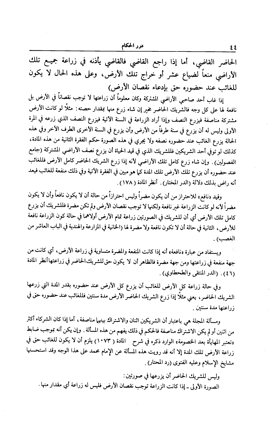 الْحَاضِرِ الْقَاضِيَ، أَمَّا إذَا رَاجَعَ الْقَاضِيَ فَالْقَاضِي يُؤْذِنُهُ فِي زِرَاعَةِ جَمِيعِ تِلْكَ الْأَرَاضِيِ مَنْعًا لِضَيَاعِ عُشْرِ أَوْ خَرَاجِ تِلْكَ الْأَرْضِ، وَعَلَى هَذِهِ الْحَالِ لَا يَكُونُ لِلْغَائِبِ عِنْدَ حُضُورِهِ حَقٌّ بِادِّعَاءِ نُقْصَانِ الْأَرْضِ) إذَا غَابَ أَحَدُ صَاحِبَيْ الْأَرَاضِيِ الْمُشْتَرَكَةِ وَكَانَ مَعْلُومًا أَنَّ زِرَاعَتَهَا لَا تُوجِبُ نُقْصَانًا فِي الْأَرْضِ بَلْ نَافِعَةٌ لَهَا عَلَى كُلِّ وَجْهٍ فَالشَّرِيكُ الْحَاضِرُ مُخَيَّرٌ إنْ شَاءَ زَرَعَ مِنْهَا بِمِقْدَارِ حِصَّتِهِ: مَثَلًا لَوْ كَانَتْ الْأَرْضُ مُشْتَرَكَةً مُنَاصَفَةً فَيَزْرَعُ النِّصْفَ وَإِذَا أَرَادَ الزِّرَاعَةَ فِي السَّنَةِ الْآتِيَةِ فَيَزْرَعُ النِّصْفَ الَّذِي زَرَعَهُ فِي الْمَرَّةَ الْأُولَى وَلَيْسَ لَهُ أَنْ يَزْرَعَ فِي سَنَةٍ طَرَفًا مِنْ الْأَرْضِ وَأَنْ يَزْرَعَ فِي السَّنَةِ الْأُخْرَى الطَّرَفَ الْآخَرَ وَفِي هَذِهِ الْحَالَةِ يَزْرَعُ الْغَائِبُ عِنْدَ حُضُورِهِ نِصْفَهُ وَلَا يَجْرِي فِي هَذِهِ الصُّورَةِ حُكْمُ الْفِقْرَةِ الثَّانِيَةِ مِنْ هَذِهِ الْمَادَّةِ، كَذَلِكَ لَوْ تُوُفِّيَ أَحَدُ الشَّرِيكَيْنِ فَلِلشَّرِيكِ الَّذِي فِي قَيْدِ الْحَيَاةِ أَنْ يَزْرَعَ نِصْفَ الْأَرَاضِي الْمُشْتَرَكَةِ (جَامِعُ الْفُصُولَيْنِ) وَإِنْ شَاءَ زَرَعَ كَامِلَ تِلْكَ الْأَرَاضِي لِأَنَّهُ إذَا زَرَعَ الشَّرِيكُ الْحَاضِرُ كَامِلَ الْأَرْضِ فَلِلْغَائِبِ عِنْدَ حُضُورِهِ أَنْ يَزْرَعَ تِلْكَ الْأَرْضِ تِلْكَ الْمُدَّةِ كَمَا هُوَ مُبَيَّنٌ فِي الْفِقْرَةِ الْآتِيَةِ وَفِي ذَلِكَ مَنْفَعَةٌ لِلْغَائِبِ فَيُعَدُّ أَنَّهُ رَاضٍ بِذَلِكَ دَلَالَةً (الدُّرُّ الْمُخْتَارُ) . اُنْظُرْ الْمَادَّةَ (78 1) .