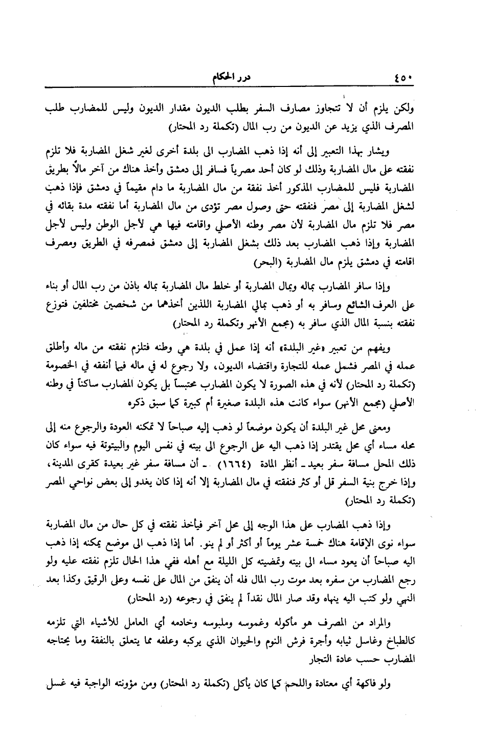وَلَكِنْ يَلْزَمُ أَنْ لَا تَتَجَاوَزَ مَصَارِفُ السَّفَرِ بِطَلَبِ الدُّيُونِ مِقْدَارَ الدُّيُونِ وَلَيْسَ لِلْمُضَارِبِ طَلَبُ الْمُصْرَفِ الَّذِي يَزِيدُ عَنْ الدُّيُونِ مِنْ رَبِّ الْمَالِ (تَكْمِلَةُ رَدِّ الْمُحْتَارِ) وَيُشَارُ بِهَذَا التَّعْبِيرِ إلَى أَنَّهُ إذَا ذَهَبَ الْمُضَارِبُ إلَى بَلْدَةٍ أُخْرَى لِغَيْرِ شُغْلِ الْمُضَارَبَةِ فَلَا تَلْزَمُ نَفَقَتُهُ عَلَى مَالِ الْمُضَارَبَةِ وَذَلِكَ لَوْ كَانَ أَحَدٌ مِصْرِيًّا فَسَافَرَ إلَى دِمِشْقَ وَأَخَذَ هُنَاكَ مِنْ آخَرَ مَالًا بِطَرِيقِ الْمُضَارَبَةِ فَلَيْسَ لِلْمُضَارِبِ الْمَذْكُورِ أَخْذُ نَفَقَةٍ مِنْ مَالِ الْمُضَارَبَةِ مَا دَامَ مُقِيمًا فِي دِمِشْقَ فَإِذَا ذَهَبَ لِشُغْلِ الْمُضَارَبَةِ إلَى مِصْرَ فَنَفَقَتُهُ حَتَّى وُصُولِ مِصْرَ تُؤَدَّى مِنْ مَالِ الْمُضَارَبَةِ أَمَّا نَفَقَتُهُ مُدَّةَ بَقَائِهِ فِي مِصْرَ فَلَا تَلْزَمُ مَالَ الْمُضَارَبَةِ؛ لِأَنَّ مِصْرَ وَطَنُهُ الْأَصْلِيُّ وَإِقَامَتُهُ فِيهَا هِيَ لِأَجْلِ الْوَطَنِ وَلَيْسَ لِأَجْلِ الْمُضَارَبَةِ وَإِذَا ذَهَبَ الْمُضَارِبُ بَعْدَ ذَلِكَ بِشُغْلِ الْمُضَارَبَةِ إلَى دِمِشْقَ فَمَصْرِفُهُ فِي الطَّرِيقِ وَمَصْرِفُ إقَامَتِهِ فِي دِمِشْقَ يَلْزَمُ مَالَ الْمُضَارَبَةِ (الْبَحْرُ) .