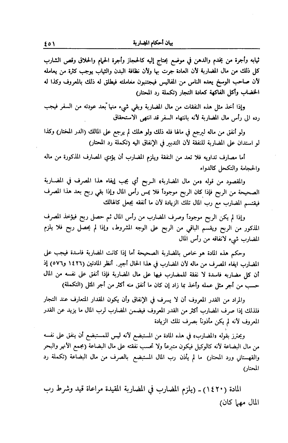 وَإِذَا بَقِيَ رِبْحٌ بَعْدَ هَذَا الْمُصْرَفِ فَيَقْتَسِمُ الْمُضَارِبُ مَعَ رَبِّ الْمَالِ تِلْكَ الزِّيَادَةَ؛ لِأَنَّ مَا أَنْفَقَهُ يُجْعَلُ كَالْهَالِكِ وَإِذَا لَمْ يَكُنْ الرِّبْحُ مَوْجُودًا وَصَرَفَ الْمُضَارِبُ مِنْ رَأْسِ الْمَالِ ثُمَّ حَصَلَ رِبْحٌ فَيُؤْخَذُ الْمُصْرَفُ الْمَذْكُورُ مِنْ الرِّبْحِ وَمُقَسَّمُ الْبَاقِي مِنْ الرِّبْحِ عَلَى الْوَجْهِ الْمَشْرُوطِ، وَإِذَا لَمْ يَحْصُلْ رِبْحٌ فَلَا يَلْزَمُ الْمُضَارِبَ شَيْءٌ لِإِنْفَاقِهِ مِنْ رَأْسِ الْمَالِ وَحُكْمُ هَذِهِ الْمَادَّةِ هُوَ خَاصٌّ بِالْمُضَارَبَةِ الصَّحِيحَةِ أَمَّا إذَا كَانَتْ الْمُضَارَبَةُ فَاسِدَةً فَيَجِبُ عَلَى الْمُضَارِبِ إيفَاءُ الْمُصْرَفِ مِنْ مَالِهِ؛ لِأَنَّ الْمُضَارِبَ فِي هَذَا الْحَالِ أَجِيرٌ. اُنْظُرْ الْمَادَّتَيْنِ (1426 و 576) إذْ أَنَّ كُلَّ مُضَارَبَةٍ فَاسِدَةٍ لَا نَفَقَةَ لِلْمُضَارِبِ فِيهَا عَلَى مَالِ الْمُضَارَبَةِ فَإِذَا أَنْفَقَ عَلَى نَفْسِهِ مِنْ الْمَالِ حُسِبَ مِنْ أَجْرِ مِثْلِ عَمَلِهِ وَأُخِذَ بِمَا زَادَ إنْ كَانَ مَا أَنْفَقَ مِنْهُ أَكْثَرَ مِنْ أَجْرِ الْمِثْلِ (التَّكْمِلَةُ) وَالْمُرَادُ مِنْ الْقَدْرِ الْمَعْرُوفِ أَنْ لَا يُسْرِفَ فِي الْإِنْفَاقِ وَأَنْ يَكُونَ الْمِقْدَارُ الْمُتَعَارَفُ عِنْدَ التُّجَّارِ فَلِذَلِكَ إذَا صَرَفَ الْمُضَارِبُ أَكْثَرَ مِنْ الْقَدْرِ الْمَعْرُوفِ فَيَضْمَنُ الْمُضَارِبُ لِرَبِّ الْمَالِ مَا يَزِيدُ عَنْ الْقَدْرِ الْمَعْرُوفِ؛ لِأَنَّهُ لَمْ يَكُنْ مَأْذُونًا بِصَرْفِ تِلْكَ الزِّيَادَةِ وَيُحْتَرَزُ بِقَوْلِهِ (الْمُضَارِبُ) فِي هَذِهِ الْمَادَّةِ مِنْ الْمُسْتَبْضِعِ؛ لِأَنَّهُ لَيْسَ لِلْمُسْتَبْضِعِ أَنْ يُنْفِقَ عَلَى نَفْسِهِ مِنْ مَالِ الْبِضَاعَةِ؛ لِأَنَّهُ كَالْوَكِيلِ فَيَكُونُ مُتَبَرِّعًا وَلَا تُحْسَبُ نَفَقَتُهُ عَلَى مَالِ الْبِضَاعَةِ (مَجْمَعُ الْأَنْهُرِ وَالْبَحْرُ وَالْقُهُسْتَانِيُّ وَرَدُّ الْمُحْتَارِ) مَا لَمْ يَأْذَنْ رَبُّ الْمَالِ الْمُسْتَبْضِعَ بِالصَّرْفِ مِنْ مَالِ الْبِضَاعَةِ (تَكْمِلَةُ رَدِّ الْمُحْتَارِ)
