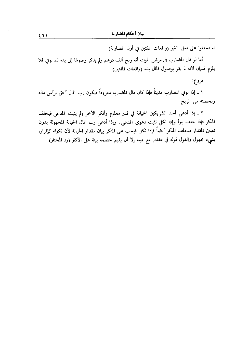 1 - إذَا تُوُفِّيَ الْمُضَارِبُ مَدِينًا فَإِذَا كَانَ مَالُ الْمُضَارَبَةِ مَعْرُوفًا فَيَكُونُ رَبُّ الْمَالِ أَحَقَّ بِرَأْسِ مَالِهِ وَبِحِصَّتِهِ مِنْ الرِّبْحِ 2 - إذَا ادَّعَى أَحَدُ الشَّرِيكَيْنِ الْخِيَانَةَ فِي قَدْرٍ مَعْلُومٍ وَأَنْكَرَ الْآخَرَ وَلَمْ يُثْبِتْ الْمُدَّعِي فَيَحْلِفُ الْمُنْكِرُ فَإِذَا حَلَفَ يَبْرَأُ وَإِذَا نَكَلَ تَثْبُتُ دَعْوَى الْمُدَّعِي. وَإِذَا ادَّعَى رَبُّ الْمَالِ الْخِيَانَةَ الْمَجْهُولَةَ بِدُونِ تَعْيِينِ الْمِقْدَارِ فَيَحْلِفُ الْمُنْكِرُ أَيْضًا فَإِذَا نَكَلَ فَيَجِبُ عَلَى الْمُنْكِرِ بَيَانُ مِقْدَارِ الْخِيَانَةِ؛ لِأَنَّ نُكُولَهُ كَإِقْرَارِهِ بِشَيْءٍ مَجْهُولٍ وَالْقَوْلُ قَوْلُهُ فِي مِقْدَارٍ مَعَ يَمِينِهِ إلَّا أَنْ يُقِيمَ خَصْمُهُ بَيِّنَةً عَلَى الْأَكْثَرِ (رَدُّ الْمُحْتَارِ)