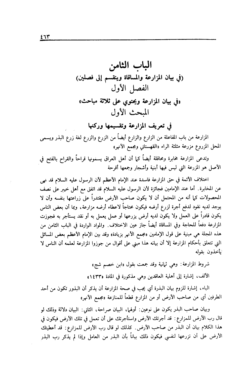 الْفَصْلُ الْأَوَّلُ " فِي بَيَانِ الْمُزَارَعَةِ وَيَحْتَوِي عَلَى ثَلَاثَةِ مَبَاحِثَ " الْمَبْحَثُ الْأَوَّلُ فِي تَعْرِيفِ الْمُزَارَعَةِ وَتَقْسِيمِهَا وَرُكْنِهَا الْمُزَارَعَةُ مِنْ بَابِ الْمُفَاعَلَةِ مِنْ الزَّارِعُ، وَالزَّارِعُ أَيْضًا مِنْ الزَّرْعِ، وَالزَّرْعُ لُغَةً زَرْعُ الْبَذْرِ وَيُسَمَّى الْمَحَلُّ الْمَزْرُوعُ مَزْرَعَةً مُثَلَّثَةَ الرَّاءِ (الْقُهُسْتَانِيُّ وَمَجْمَعُ الْأَنْهُرِ) وَتُدْعَى الْمُزَارَعَةُ مُخَابَرَةً وَعَاقِلَةً أَيْضًا كَمَا أَنَّ أَهْلَ الْعِرَاقُ يُسَمُّونَهَا قَرَاحًا وَالْقَرَاحُ بِالْفَتْحِ فِي الْأَصْلِ هُوَ الْمَزْرَعَةُ الَّتِي لَيْسَ فِيهَا أَبْنِيَةٌ وَأَشْجَارٌ وَجَمْعُهَا أَقْرِحَةٌ اخْتِلَافُ الْأَئِمَّةِ فِي حَقِّ الْمُزَارَعَةِ فَاسِدَةٌ عِنْدَ الْإِمَامِ الْأَعْظَمِ؛ لِأَنَّ الرَّسُولَ - عَلَيْهِ السَّلَامُ - قَدْ نَهَى عَنْ الْمُخَابَرَةِ. أَمَّا عِنْدَ الْإِمَامَيْنِ فَجَائِزَةٌ؛ لِأَنَّ الرَّسُولَ - عَلَيْهِ السَّلَامُ - قَدْ اتَّفَقَ مَعَ أَهْلِ خَيْبَرَ عَلَى نِصْفِ الْمَحْصُولَاتِ كَمَا أَنَّهُ مِنْ الْمُحْتَمَلِ أَنْ لَا يَكُونَ صَاحِبُ الْأَرْضِ مُقْتَدِرًا عَلَى زِرَاعَتِهَا بِنَفْسِهِ وَأَنْ لَا يُوجَدَ لَدَيْهِ نُقُودٌ لِدَفْعِ أُجْرَةٍ لِزَرْعِ أَرْضِهِ فَيَكُونُ مُحْتَاجًا لِإِعْطَاءِ أَرْضِهِ مُزَارَعَةً، وَبِمَا أَنَّ بَعْضَ النَّاسِ يَكُونُ قَادِرًا عَلَى الْعَمَلِ وَلَا يَكُونُ لَدَيْهِ أَرْضٌ يَزْرَعُهَا أَوْ عَمَلٌ يَعْمَلُ بِهِ أَوْ نَقْدٌ يَسْتَأْجِرُ بِهِ فَجُوِّزَتْ الْمُزَارَعَةُ دَفْعًا لِلْحَاجَةِ وَفِي الْمُسَاقَاةِ أَيْضًا جَازَ عَيْنُ الِاخْتِلَافِ. وَالْمَوَادُّ الْوَارِدَةُ فِي الْبَابِ الثَّامِنِ مِنْ هَذِهِ الْمَجَلَّةُ هِيَ مَبْنِيَّةٌ عَلَى قَوْلِ الْإِمَامَيْنِ (مَجْمَعُ الْأَنْهُرِ بِزِيَادَةٍ) وَقَدْ بَيَّنَ الْإِمَامُ الْأَعْظَمُ بَعْضَ الْمَسَائِلِ الَّتِي تَتَعَلَّقُ بِأَحْكَامِ الْمُزَارَعَةِ إلَّا أَنَّ بَيَانَهُ هَذَا مَبْنِيٌّ عَلَى أَقْوَالِ مَنْ جَوَّزُوا الْمُزَارَعَةَ لِعِلْمِهِ أَنَّ النَّاسَ لَا يَأْخُذُونَ بِقَوْلِهِ. شُرُوطُ الْمُزَارَعَةِ: وَهِيَ ثَمَانِيَةٌ وَقَدْ جُمِعَتْ بِقَوْلِ (ابْنُ خَصْمِ شَجَّ) الْأَلِفُ، إشَارَةٌ إلَى أَهْلِيَّةِ الْعَاقِدَيْنِ وَهِيَ مَذْكُورَةٌ فِي الْمَادَّةِ (1433) الْبَاءُ، إشَارَةٌ لِلُزُومِ بَيَانِ الْبَذْرَةِ أَيْ يَجِبُ فِي صِحَّةِ الْمُزَارَعَةِ أَنْ يُذْكَرَ أَنَّ الْبُذُورَ تَكُونُ مِنْ أَحَدِ الطَّرَفَيْنِ أَيْ مِنْ صَاحِبِ الْأَرْضِ أَوْ مِنْ الْمُزَارِعِ قَطْعًا لِلْمُنَازَعَةِ (مَجْمَعُ الْأَنْهُرِ) وَبَيَانُ صَاحِبِ الْبَذْرِ يَكُونُ عَلَى نَوْعَيْنِ: أَوَّلُهُمَا، الْبَيَانُ صَرَاحَةً، الثَّانِي: الْبَيَانُ دَلَالَةً وَذَلِكَ لَوْ قَالَ رَبُّ الْأَرْضِ لِلْمُزَارِعِ: قَدْ آجَرْتُكَ الْأَرْضَ وَاسْتَأْجَرْتُكَ عَلَى أَنْ تَعْمَلَ فِي تِلْكَ الْأَرْضِ فَيَكُونُ فِي هَذَا الْكَلَامِ بَيَانُ أَنَّ الْبَذْرَ مِنْ صَاحِبِ الْأَرْضِ.
