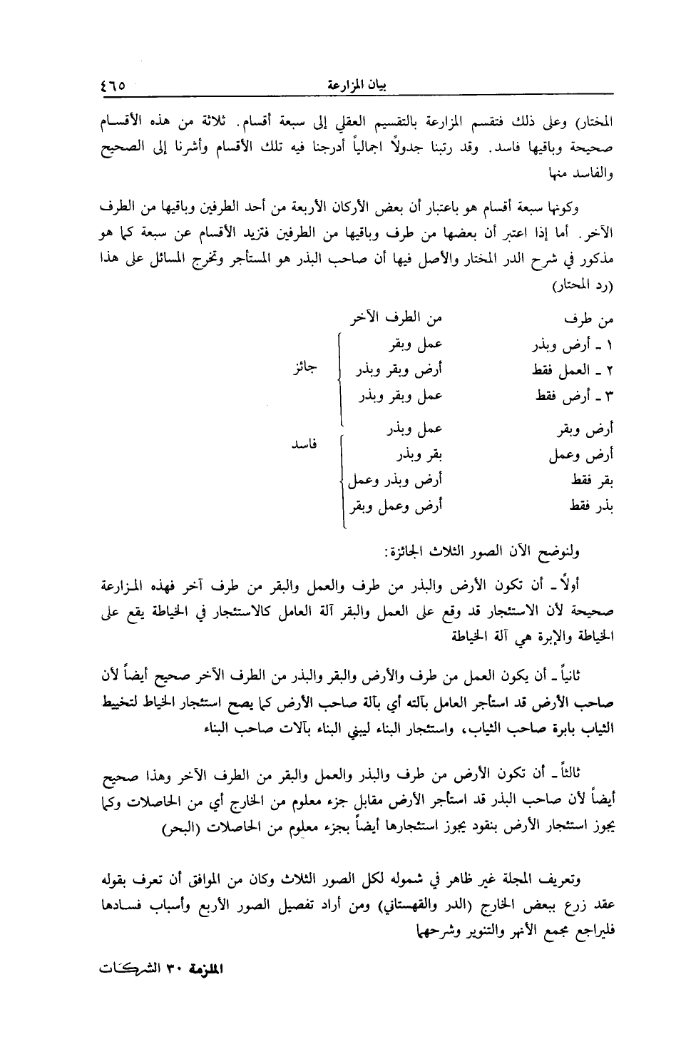الدُّرُّ الْمُخْتَارُ) وَعَلَى ذَلِكَ فَتُقَسَّمُ الْمُزَارَعَةُ بِالتَّقْسِيمِ الْعَقْلِيِّ إلَى سَبْعَةِ أَقْسَامٍ. ثَلَاثَةٌ مِنْ هَذِهِ الْأَقْسَامِ صَحِيحَةٌ وَبَاقِيهَا فَاسِدٌ. وَقَدْ رَتَّبْنَا جَدْوَلًا إجْمَالِيًّا أَدْرَجْنَا فِيهِ تِلْكَ الْأَقْسَامَ وَأَشَرْنَا إلَى الصَّحِيحِ وَالْفَاسِدِ مِنْهَا، وَكَوْنُهَا سَبْعَةَ أَقْسَامٍ هُوَ بِاعْتِبَارِ أَنَّ بَعْضَ الْأَرْكَانِ الْأَرْبَعَةِ مِنْ أَحَدِ الطَّرَفَيْنِ وَبَاقِيهَا مِنْ الطَّرَفِ الْآخَرِ أَمَّا إذَا اُعْتُبِرَ أَنَّ بَعْضَهَا مِنْ طَرَفٍ وَبَاقِيَهَا مِنْ الطَّرَفَيْنِ فَتَزِيدُ الْأَقْسَامُ عَنْ سَبْعَةٍ كَمَا هُوَ مَذْكُورٌ فِي شَرْحِ الدُّرِّ الْمُخْتَارِ وَالْأَصْلُ فِيهَا أَنَّ صَاحِبَ الْبَذْرِ هُوَ الْمُسْتَأْجِرُ وَتُخَرَّجُ الْمَسَائِلُ عَلَى هَذَا (رَدُّ الْمُحْتَارِ) مِنْ طَرَفٍ مِنْ الطَّرَفِ الْآخَرِ 1 - أَرْضٌ وَبَذْرٌ عَمَلٌ وَبَقَرٌ 2 - الْعَمَلُ فَقَطْ أَرْضٌ وَبَقَرٌ وَبَذْرٌ جَائِزٌ 3 - أَرْضٌ فَقَطْ عَمَلٌ وَبَقَرٌ وَبَذْرٌ (أَرْضٌ وَبَقَرٌ عَمَلٌ وَبَذْرٌ) (أَرْضٌ وَعَمَلٌ بَقَرٌ وَبَذْرٌ) فَاسِدٌ، بَقَرٌ فَقَطْ أَرْضٌ وَبَذْرٌ وَعَمَلٌ، بَذْرٌ فَقَطْ أَرْضٌ وَعَمَلٌ وَبَقَرٌ. وَلْنُوضِحْ الْآنَ الصُّوَرَ الثَّلَاثَ الْجَائِزَةَ: أَوَّلًا - أَنْ تَكُونَ الْأَرْضُ وَالْبَذْرُ مِنْ طَرَفٍ وَالْعَمَلُ وَالْبَقَرُ مِنْ طَرَفٍ آخَرَ فَهَذِهِ الْمُزَارَعَةُ صَحِيحَةٌ؛ لِأَنَّ الِاسْتِئْجَارَ قَدْ وَقَعَ عَلَى الْعَمَلِ وَالْبَقَرُ آلَةُ الْعَامِلِ كَالِاسْتِئْجَارِ فِي الْخِيَاطَةِ يَقَعُ عَلَى الْخِيَاطَةِ وَالْإِبْرَةُ هِيَ آلَةُ الْخِيَاطَةِ ثَانِيًا - أَنْ يَكُونَ الْعَمَلُ مِنْ طَرَفٍ وَالْأَرْضُ وَالْبَقَرُ وَالْبَذْرُ مِنْ الطَّرَفِ الْآخَرِ صَحِيحٌ أَيْضًا؛ لِأَنَّ صَاحِبَ الْأَرْضِ قَدْ اسْتَأْجَرَ الْعَامِلَ بِآلَتِهِ أَيْ بِآلَةِ صَاحِبِ الْأَرْضِ كَمَا يَصِحُّ اسْتِئْجَارُ الْخَيَّاطِ لِتَخْيِيطِ الثِّيَابِ بِإِبْرَةِ صَاحِبِ الثِّيَابِ، وَاسْتِئْجَارُ الْبَنَّاءِ لِيَبْنِيَ الْبِنَاءَ بِآلَاتِ صَاحِبِ الْبِنَاءِ ثَالِثًا - أَنْ تَكُونَ الْأَرْضُ مِنْ طَرَفٍ وَالْبَذْرُ وَالْعَمَلُ وَالْبَقَرُ مِنْ الطَّرَفِ الْآخَرِ وَهَذَا صَحِيحٌ أَيْضًا؛ لِأَنَّ صَاحِبَ الْبَذْرِ قَدْ اسْتَأْجَرَ الْأَرْضَ مُقَابِلَ جُزْءٍ مَعْلُومٍ مِنْ الْخَارِجِ أَيْ مِنْ الْحَاصِلَاتِ وَكَمَا يَجُوزُ اسْتِئْجَارُ الْأَرْضِ بِنُقُودٍ يَجُوزُ اسْتِئْجَارُهَا أَيْضًا بِجُزْءٍ مَعْلُومٍ مِنْ الْحَاصِلَاتِ (الْبَحْرُ) وَتَعْرِيفُ الْمَجَلَّةِ غَيْرُ ظَاهِرٍ فِي شُمُولِهِ لِكُلِّ الصُّوَرِ الثَّلَاثِ وَكَانَ مِنْ الْمُوَافِقِ أَنْ تُعَرَّفَ بِقَوْلِهِ عَقْدُ زَرْعٍ بِبَعْضِ الْخَارِجِ (الدُّرُّ وَالْقُهُسْتَانِيُّ) .