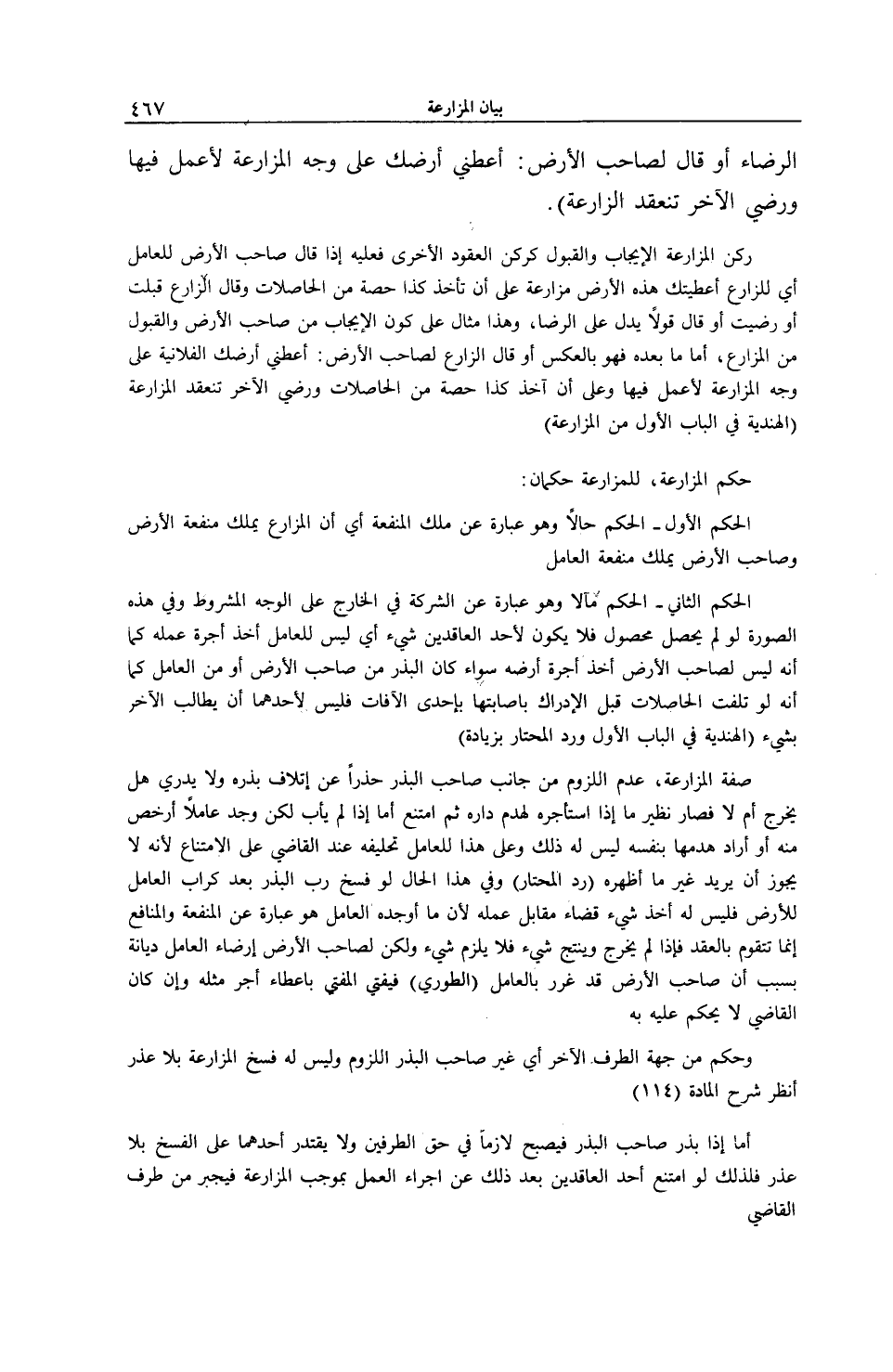 الرِّضَاءِ أَوْ قَالَ لِصَاحِبِ الْأَرْضِ: أَعْطِنِي أَرْضَكَ عَلَى وَجْهِ الْمُزَارَعَةِ لِأَعْمَلَ فِيهَا وَرَضِيَ الْآخَرُ تَنْعَقِدُ الْمُزَارَعَةُ) . رُكْنُ الْمُزَارَعَةِ الْإِيجَابُ وَالْقَبُولُ كَرُكْنِ الْعُقُودِ الْأُخْرَى فَعَلَيْهِ إذَا قَالَ صَاحِبُ الْأَرْضِ لِلْعَامِلِ أَيْ لِلزَّارِعِ: أَعْطَيْتُكَ هَذِهِ الْأَرْضَ مُزَارَعَةً عَلَى أَنْ تَأْخُذَ كَذَا حِصَّةً مِنْ الْحَاصِلَاتِ وَقَالَ الزَّارِعُ: قَبِلْتُ أَوْ رَضِيتُ أَوْ قَالَ قَوْلًا يَدُلُّ عَلَى الرِّضَا، وَهَذَا مِثَالٌ عَلَى كَوْنِ الْإِيجَابِ مِنْ صَاحِبِ الْأَرْضِ وَالْقَبُولِ مِنْ الْمُزَارِعِ، أَمَّا مَا بَعْدَهُ فَهُوَ بِالْعَكْسِ أَوْ قَالَ الزَّارِعُ لِصَاحِبِ الْأَرْضِ: أَعْطِنِي أَرْضَكَ الْفُلَانِيَّةَ عَلَى وَجْهِ الْمُزَارَعَةِ لِأَعْمَلَ فِيهَا وَعَلَى أَنْ آخُذَ كَذَا حِصَّةً مِنْ الْحَاصِلَاتِ وَرَضِيَ الْآخَرُ تَنْعَقِدُ الْمُزَارَعَةُ (الْهِنْدِيَّةُ فِي الْبَابِ الْأَوَّلِ مِنْ الْمُزَارَعَةِ) حُكْمُ الْمُزَارَعَةِ، لِلْمُزَارَعَةِ حُكْمَانِ: الْحُكْمُ الْأَوَّلُ - الْحُكْمُ حَالًا وَهُوَ عِبَارَةٌ عَنْ مِلْكِ الْمَنْفَعَةِ أَيْ أَنَّ الْمُزَارِعَ يَمْلِكُ مَنْفَعَةَ الْأَرْضِ وَصَاحِبُ الْأَرْضِ يَمْلِكُ مَنْفَعَةَ الْعَامِلِ.