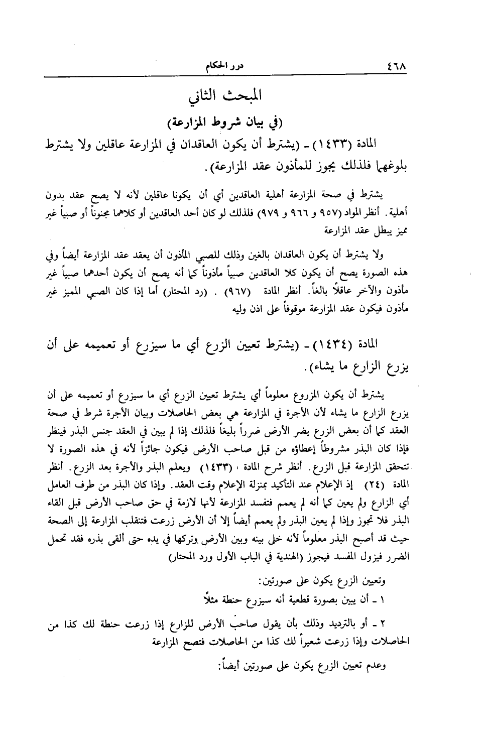 [ (الْمَبْحَثُ الثَّانِي) فِي بَيَانِ شُرُوطِ الْمُزَارَعَةِ] [ (الْمَادَّةُ 1433) يُشْتَرَطُ أَنْ يَكُونَ الْعَاقِدَانِ فِي الْمُزَارَعَةِ عَاقِلَيْنِ]