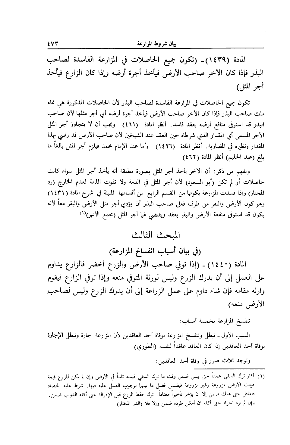 (الْمَادَّةُ 1440) - (إذَا تُوُفِّيَ صَاحِبُ الْأَرْضِ وَالزَّرْعُ أَخْضَرُ فَالزَّارِعُ يُدَاوِمُ عَلَى الْعَمَلِ إلَى أَنْ يُدْرِكَ الزَّرْعَ وَلَيْسَ لِوَرَثَةِ الْمُتَوَفَّى مَنْعُهُ وَإِذَا تُوُفِّيَ الزَّارِعُ فَيَقُومُ وَارِثُهُ مَقَامَهُ فَإِنْ شَاءَ دَاوَمَ عَلَى عَمَلِ الزِّرَاعَةِ إلَى أَنْ يُدْرِكَ الزَّرْعَ وَلَيْسَ لِصَاحِبِ الْأَرْضِ مَنْعُهُ) تَنْفَسِخُ الْمُزَارَعَةُ بِخَمْسَةِ أَسْبَابٍ: السَّبَبُ الْأَوَّلُ - تَبْطُلُ وَتَنْفَسِخُ الْمُزَارَعَةُ بِوَفَاةِ أَحَدِ الْعَاقِدَيْنِ؛ لِأَنَّ الْمُزَارَعَةَ إجَارَةٌ وَتَبْطُلُ الْإِجَارَةُ بِوَفَاةِ أَحَدِ الْعَاقِدَيْنِ إذَا كَانَ الْعَاقِدُ عَاقِدًا لِنَفْسِهِ (الطُّورِيُّ) وَتُوجَدُ ثَلَاثُ صُوَرٍ فِي وَفَاةِ أَحَدِ الْعَاقِدَيْنِ: