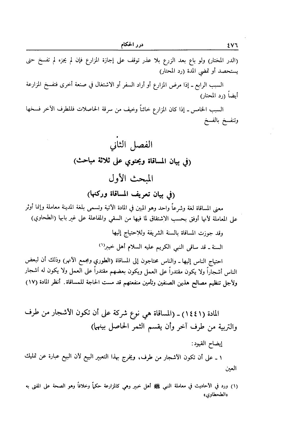 1 - عَلَى أَنْ تَكُونَ الْأَشْجَارُ مِنْ طَرَفٍ، وَيَخْرُجُ بِهَذَا التَّعْبِيرِ الْبَيْعُ؛ لِأَنَّ الْبَيْعَ عِبَارَةٌ عَنْ تَمْلِيكِ الْعَيْنِ (1) وَرَدَ فِي الْأَحَادِيثِ فِي مُعَامَلَةِ النَّبِيِّ - صَلَّى اللَّهُ عَلَيْهِ وَسَلَّمَ - أَهْلَ خَيْبَرَ وَهِيَ كَالْمُزَارَعَةِ حُكْمًا وَخِلَافًا وَهُوَ الصِّحَّةُ عَلَى الْمُفْتَى بِهِ " الطَّحْطَاوِيُّ "