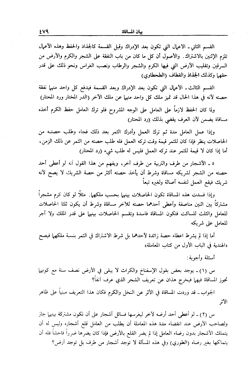وَإِذَا فَسَدَتْ هَذِهِ الْمُسَاقَاةُ تَكُونُ الْحَاصِلَاتُ بَيْنَهُمَا بِحَسَبِ مِلْكِهِمَا مَثَلًا لَوْ كَانَ كَرْمٌ مُشْجِرًا مُشْتَرَكًا بَيْنَ اثْنَيْنِ مُنَاصَفَةً وَأَعْطَى أَحَدُهُمَا حِصَّتَهُ لِلْآخَرِ مُسَاقَاةً وَشَرَطَ أَنْ يَكُونَ ثُلُثَا الْحَاصِلَاتِ لِلْعَامِلِ وَالثُّلُثُ لِلسَّاكِتِ فَتَكُونُ الْمُسَاقَاةُ فَاسِدَةً وَتُقْسَمُ الْحَاصِلَاتُ بَيْنَهُمَا عَلَى قَدْرِ الْمِلْكِ وَلَا أَجْرَ لِلْعَامِلِ عَلَى شَرِيكِهِ أَمَّا إذَا لَمْ يُشْرَطْ إعْطَاءُ حِصَّةٍ زَائِدَةٍ لِأَحَدِهِمَا بَلْ شُرِطَ الِاشْتِرَاكُ فِي الثَّمَرِ بِنِسْبَةِ مِلْكِهِمَا فَيَصِحُّ (الْهِنْدِيَّةُ فِي الْبَابِ الْأَوَّلِ مِنْ كِتَابِ الْمُعَامَلَةِ) أَسْئِلَةٌ وَأَجْوِبَةٌ: س (1) - يُوجَدُ بَعْضٌ يَقُولُ: الْإِسْفِنَاخُ وَالْكُرَّاثُ لَا يَبْقَى فِي الْأَرْضِ نِصْفَ سَنَةٍ مَعَ كَوْنِهِمَا تَجُوزُ الْمُسَاقَاةُ فِيهِمَا فَيَخْرُجُ هَذَانِ عَنْ تَعْرِيفِ الشَّجَرِ الَّذِي عُرِّفَ آنِفًا؟ الْجَوَابُ - قَدْ وَرَدَتْ الْمُسَاقَاةُ فِي الْأَثَرِ عَنْ النَّخْلِ وَالْكَرْمِ فَكَانَ هَذَا التَّعْرِيفُ مَبْنِيًّا عَلَى ظَاهِرِ الْأَثَرِ س (2) - لَوْ أَعْطَى أَحَدٌ أَرْضَهُ لِآخَرَ لِيَغْرِسَهَا فَسَائِلَ أَشْجَارٍ عَلَى أَنْ تَكُونَ مُشْتَرَكَةً بَيْنَهُمَا جَازَ وَلِصَاحِبِ الْأَرْضِ عِنْدَ انْقِضَاءِ مُدَّةِ هَذِهِ الْمُعَامَلَةِ أَنْ يَطْلُبَ مِنْ الْعَامِلِ قَلْعَ أَشْجَارِهِ وَلَيْسَ لَهُ أَنْ يَتَمَلَّكَ الْأَشْجَارَ بِدُونِ رِضَا الْعَامِلِ إذَا لَمْ يَضُرَّ الْقَلْعُ بِالْأَرْضِ فَإِذَا كَانَ يَضُرُّهَا ضَرَرًا فَاحِشًا فَلَهُ أَنْ يَتَمَلَّكَهَا بِغَيْرِ رِضَاهُ (الطُّورِيُّ) وَفِي هَذِهِ الْمَسْأَلَةِ لَا تُوجَدُ أَشْجَارٌ مِنْ طَرَفٍ بَلْ تُوجَدُ أَرْضٌ؟