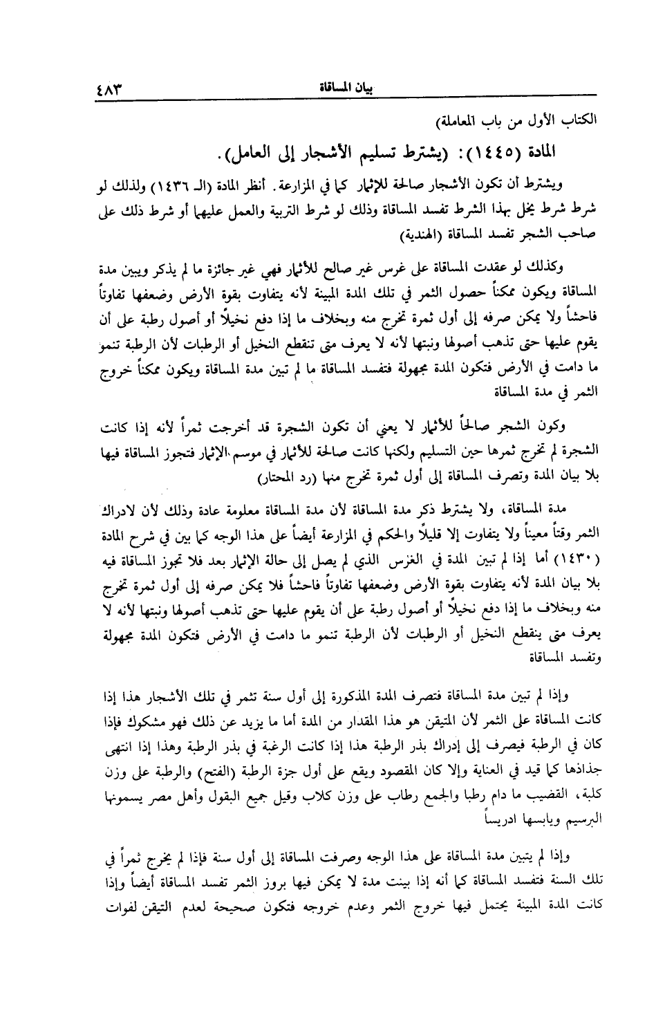 الْمَادَّةُ (1445) : (يُشْتَرَطُ تَسْلِيمُ الْأَشْجَارِ إلَى الْعَامِلِ) . وَيُشْتَرَطُ أَنْ تَكُونَ الْأَشْجَارُ صَالِحَةً لِلْإِثْمَارِ كَمَا فِي الْمُزَارَعَةِ. اُنْظُرْ الْمَادَّةُ (الـ 436 1) وَلِذَلِكَ لَوْ شُرِطَ شَرْطٌ يُخِلُّ بِهَذَا الشَّرْطِ تَفْسُدُ الْمُسَاقَاةُ وَذَلِكَ لَوْ شُرِطَ التَّرْبِيَةُ وَالْعَمَلُ عَلَيْهِمَا أَوْ شُرِطَ ذَلِكَ عَلَى صَاحِبِ الشَّجَرِ تَفْسُدُ الْمُسَاقَاةُ (الْهِنْدِيَّةُ) وَكَذَلِكَ لَوْ عُقِدَتْ الْمُسَاقَاةُ عَلَى غَرْسٍ غَيْرِ صَالِحٍ لِلْإِثْمَارِ فَهِيَ غَيْرُ جَائِزَةٍ مَا لَمْ يُذْكَرْ وَيُبَيَّنْ مُدَّةُ الْمُسَاقَاةِ وَيَكُونُ مُمْكِنًا حُصُولُ الثَّمَرِ فِي تِلْكَ الْمُدَّةِ الْمُبَيَّنَةِ؛ لِأَنَّهُ يَتَفَاوَتُ بِقُوَّةِ الْأَرْضِ وَضَعْفِهَا تَفَاوُتًا فَاحِشًا وَلَا يُمْكِنُ صَرْفُهُ إلَى أَوَّلِ ثَمَرَةٍ تَخْرُجُ مِنْهُ وَبِخِلَافِ مَا إذَا دَفَعَ نَخِيلًا أَوْ أُصُولَ رُطَبَةٍ عَلَى أَنْ يَقُومَ عَلَيْهَا حَتَّى تَذْهَبَ أُصُولُهَا وَنَبْتُهَا؛ لِأَنَّهُ لَا يُعْرَفُ مَتَى تَنْقَطِعُ النَّخِيلُ أَوْ الرَّطْبَاتُ؛ لِأَنَّ الرَّطْبَةَ تَنْمُو مَا دَامَتْ فِي الْأَرْضِ فَتَكُونُ الْمُدَّةُ مَجْهُولَةً فَتَفْسُدُ الْمُسَاقَاةُ مَا لَمْ تُبَيَّنْ مُدَّةُ الْمُسَاقَاةِ وَيَكُونُ مُمْكِنًا خُرُوجُ الثَّمَرِ فِي مُدَّةِ الْمُسَاقَاةِ وَكَوْنُ الشَّجَرِ صَالِحًا لِلْإِثْمَارِ لَا يَعْنِي أَنْ تَكُونَ الشَّجَرَةُ قَدْ أَخْرَجَتْ ثَمَرًا؛ لِأَنَّهُ إذَا كَانَتْ الشَّجَرَةُ لَمْ تُخْرِجْ ثَمَرَهَا حِينَ التَّسْلِيمِ وَلَكِنَّهَا كَانَتْ صَالِحَةً لِلْإِثْمَارِ فِي مَوْسِمِ الْإِثْمَارِ فَتَجُوزُ الْمُسَاقَاةُ فِيهَا بِلَا بَيَانِ الْمُدَّةِ وَتُصْرَفُ الْمُسَاقَاةُ إلَى أَوَّلِ ثَمَرَةٍ تَخْرُجُ مِنْهَا (رَدُّ الْمُحْتَارِ) مُدَّةُ الْمُسَاقَاةِ، وَلَا يُشْتَرَطُ ذِكْرُ مُدَّةِ الْمُسَاقَاةِ؛ لِأَنَّ مُدَّةَ الْمُسَاقَاةِ مَعْلُومَةٌ عَادَةً وَذَلِكَ؛ لِأَنَّ لِإِدْرَاكِ الثَّمَرِ وَقْتًا مُعَيَّنًا وَلَا يَتَفَاوَتُ إلَّا قَلِيلًا وَالْحُكْمُ فِي الْمُزَارَعَةِ أَيْضًا عَلَى هَذَا الْوَجْهِ كَمَا بُيِّنَ فِي شَرْحِ الْمَادَّةِ (430 1) أَمَّا إذَا لَمْ تُبَيَّنْ الْمَادَّةُ فِي الْغَرْسِ الَّذِي لَمْ يَصِلْ إلَى حَالَةِ الْإِثْمَارِ بَعْدُ فَلَا يَجُوزُ الْمُسَاقَاةُ فِيهِ بِلَا بَيَانِ الْمُدَّةِ؛ لِأَنَّهُ يَتَفَاوَتُ بِقُوَّةِ الْأَرْضِ وَضَعْفِهَا تَفَاوُتًا فَاحِشًا فَلَا يُمْكِنُ صَرْفُهُ إلَى أَوَّلِ ثَمَرَةٍ تَخْرُجُ مِنْهُ وَبِخِلَافِ مَا إذَا دَفَعَ نَخِيلًا أَوْ أُصُولَ رُطَبَةٍ عَلَى أَنْ يَقُومَ عَلَيْهَا حَتَّى تَذْهَبَ أُصُولُهَا وَنَبْتُهَا؛ لِأَنَّهُ لَا يُعْرَفُ مَتَى يَنْقَطِعُ النَّخِيلُ أَوْ الرَّطْبَاتُ؛ لِأَنَّ الرَّطْبَةَ تَنْمُو مَا دَامَتْ فِي الْأَرْضِ فَتَكُونُ الْمُدَّةُ مَجْهُولَةً وَتَفْسُدُ الْمُسَاقَاةُ.