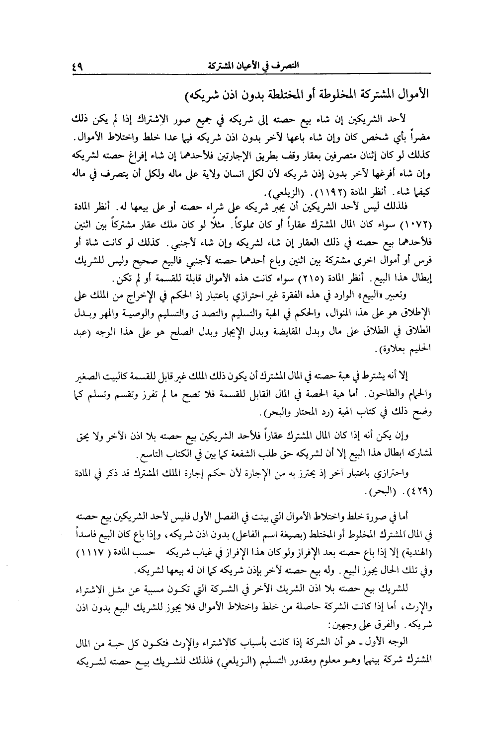 وَإِنْ يَكُنْ أَنَّهُ إذَا كَانَ الْمَالُ الْمُشْتَرَكُ عَقَارًا فَلِأَحَدِ الشَّرِيكَيْنِ بَيْعُ حِصَّتِهِ بِلَا إذْنِ الْآخَرِ وَلَا يَحِقُّ لِمُشَارِكِهِ إبْطَالُ هَذَا الْبَيْعِ إلَّا أَنَّ لِشَرِيكِهِ حَقَّ طَلَبِ الشُّفْعَةِ كَمَا بَيَّنَ فِي الْكِتَابِ التَّاسِعِ. وَاحْتِرَازِيٌّ بِاعْتِبَارٍ آخَرَ إمَّا يُحْتَرَزُ بِهِ مِنْ الْإِجَارَةِ لِأَنَّ حُكْمَ إجَارَةِ الْمِلْكِ الْمُشْتَرَكِ قَدْ ذُكِرَ فِي الْمَادَّةِ (29 4) . (الْبَحْرُ) . أَمَّا فِي صُورَةِ خَلْطِ وَاخْتِلَاطِ الْأَمْوَالِ الَّتِي بُيِّنَتْ فِي الْفَصْلِ الْأَوَّلِ فَلَيْسَ لِأَحَدِ الشَّرِيكَيْنِ بَيْعُ حِصَّتِهِ فِي الْمَالِ الْمُشْتَرَكِ الْمَخْلُوطِ أَوْ الْمُخْتَلِطِ (بِصِيغَةِ اسْمِ الْفَاعِلِ) بِدُونِ إذْنِ شَرِيكِهِ. وَإِذَا بَاعَ كَانَ الْبَيْعُ فَاسِدًا (الْهِنْدِيَّةُ) إلَّا إذَا بَاعَ حِصَّتَهُ بَعْدَ الْإِفْرَازِ وَلَوْ كَانَ هَذَا الْإِفْرَازُ فِي غِيَابِ شَرِيكِهِ حَسَبِ الْمَادَّةِ (17 1 1) وَفِي تِلْكَ الْحَالِ يَجُوزُ الْبَيْعُ. وَلَهُ بَيْعُ حِصَّتِهِ لِآخَرَ بِإِذْنِ شَرِيكِهِ كَمَا أَنَّ لَهُ بَيْعَهَا لِشَرِيكِهِ، لِلشَّرِيكِ بَيْعُ حِصَّتِهِ بِلَا إذْنِ الشَّرِيكِ الْآخَرِ فِي الشَّرِكَةِ الَّتِي تَكُونُ مُسَبَّبَةً عَنْ مِثْلِ الِاشْتِرَاءِ وَالْإِرْثِ، أَمَّا إذَا كَانَتْ الشَّرِكَةُ حَاصِلَةً مِنْ خَلْطِ وَاخْتِلَاطِ الْأَمْوَالِ فَلَا يَجُوزُ لِلشَّرِيكِ الْبَيْعُ بِدُونِ إذْنِ شَرِيكِهِ. وَالْفَرْقُ عَلَى وَجْهَيْنِ: