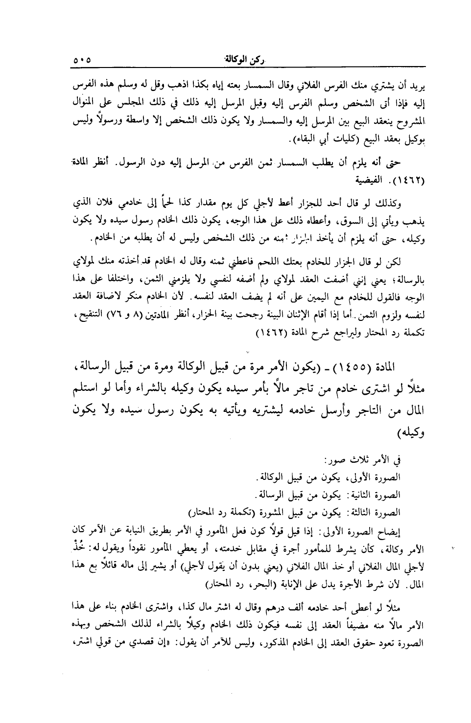 [ (الْمَادَّةُ 1455) يَكُونُ الْأَمْرُ مَرَّةً مِنْ قَبِيلِ الْوَكَالَةِ وَمَرَّةً مِنْ قَبِيلِ الرِّسَالَةِ]