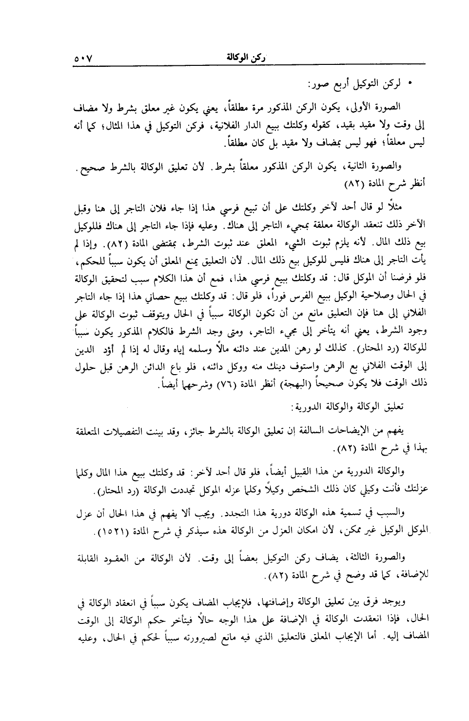 لِرُكْنِ التَّوْكِيلِ أَرْبَعُ صُوَرٍ: الصُّورَةُ الْأُولَى، يَكُونُ الرُّكْنُ الْمَذْكُورُ مَرَّةً مُطْلَقًا، يَعْنِي يَكُونُ غَيْرَ مُعَلَّقٍ بِشَرْطٍ وَلَا مُضَافٍ إلَى وَقْتٍ وَلَا مُقَيَّدٍ بِقَيْدٍ، كَقَوْلِهِ وَكَّلْتُكَ بِبَيْعِ الدَّارِ الْفُلَانِيَّةِ، فَرُكْنُ التَّوْكِيلِ فِي هَذَا الْمِثَالِ كَمَا أَنَّهُ لَيْسَ مُعَلَّقًا فَهُوَ لَيْسَ بِمُضَافٍ وَلَا مُقَيَّدٍ بَلْ كَانَ مُطْلَقًا. وَالصُّورَةُ الثَّانِيَةُ، يَكُونُ الرُّكْنُ الْمَذْكُورُ مُعَلَّقًا بِشَرْطٍ؛ لِأَنَّ تَعْلِيقَ الْوَكَالَةِ بِالشَّرْطِ صَحِيحٌ. اُنْظُرْ شَرْحَ الْمَادَّةِ (82) مَثَلًا لَوْ قَالَ أَحَدٌ لِآخَرَ: وَكَّلْتُكَ عَلَى أَنْ تَبِيعَ فَرَسِي هَذَا إذَا جَاءَ فُلَانٌ التَّاجِرُ إلَى هُنَا وَقَبِلَ الْآخَرُ ذَلِكَ تَنْعَقِدُ الْوَكَالَةُ مُعَلَّقَةً بِمَجِيءِ التَّاجِرِ إلَى هُنَاكَ. وَعَلَيْهِ فَإِذَا جَاءَ التَّاجِرُ إلَى هُنَاكَ فَلِلْوَكِيلِ بَيْعُ ذَلِكَ الْمَالِ؛ لِأَنَّهُ يَلْزَمُ ثُبُوتُ الشَّيْءِ الْمُعَلَّقِ عِنْدَ ثُبُوتِ الشَّرْطِ بِمُقْتَضَى الْمَادَّةِ (82) .