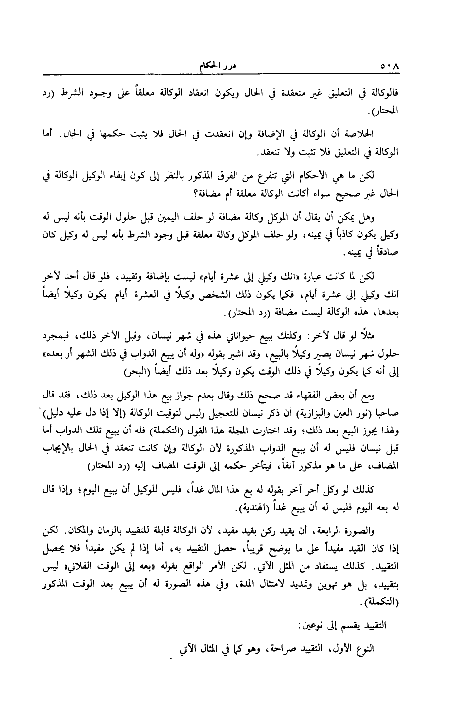 وَالصُّورَةُ الرَّابِعَةُ، أَنْ يُقَيَّدَ رُكْنٌ بِقَيْدٍ مُفِيدٍ؛ لِأَنَّ الْوَكَالَةَ قَابِلَةٌ لِلتَّقْيِيدِ بِالزَّمَانِ وَالْمَكَانِ. لَكِنْ إذَا كَانَ الْقَيْدُ مُفِيدًا عَلَى مَا يُوَضَّحُ قَرِيبًا، حَصَلَ التَّقْيِيدُ بِهِ، أَمَّا إذَا لَمْ يَكُنْ مُفِيدًا فَلَا يَحْصُلُ التَّقْيِيدُ كَذَلِكَ يُسْتَفَادُ مِنْ الْمَثَلِ الْآتِي. لَكِنَّ الْأَمْرَ الْوَاقِعَ بِقَوْلِهِ (بِعْهُ إلَى الْوَقْتِ الْفُلَانِيِّ) لَيْسَ بِتَقْيِيدٍ، بَلْ هُوَ تَهْوِينٌ وَتَمْدِيدٌ لِامْتِثَالِ الْمُدَّةِ، وَفِي هَذِهِ الصُّورَةِ لَهُ أَنْ يَبِيعَ بَعْدَ الْوَقْتِ الْمَذْكُورِ (التَّكْمِلَةُ) . التَّقْيِيدُ يُقَسَّمُ إلَى نَوْعَيْنِ: النَّوْعُ الْأَوَّلُ، التَّقْيِيدُ صَرَاحَةً، وَهُوَ كَمَا فِي الْمِثَالِ الْآتِي