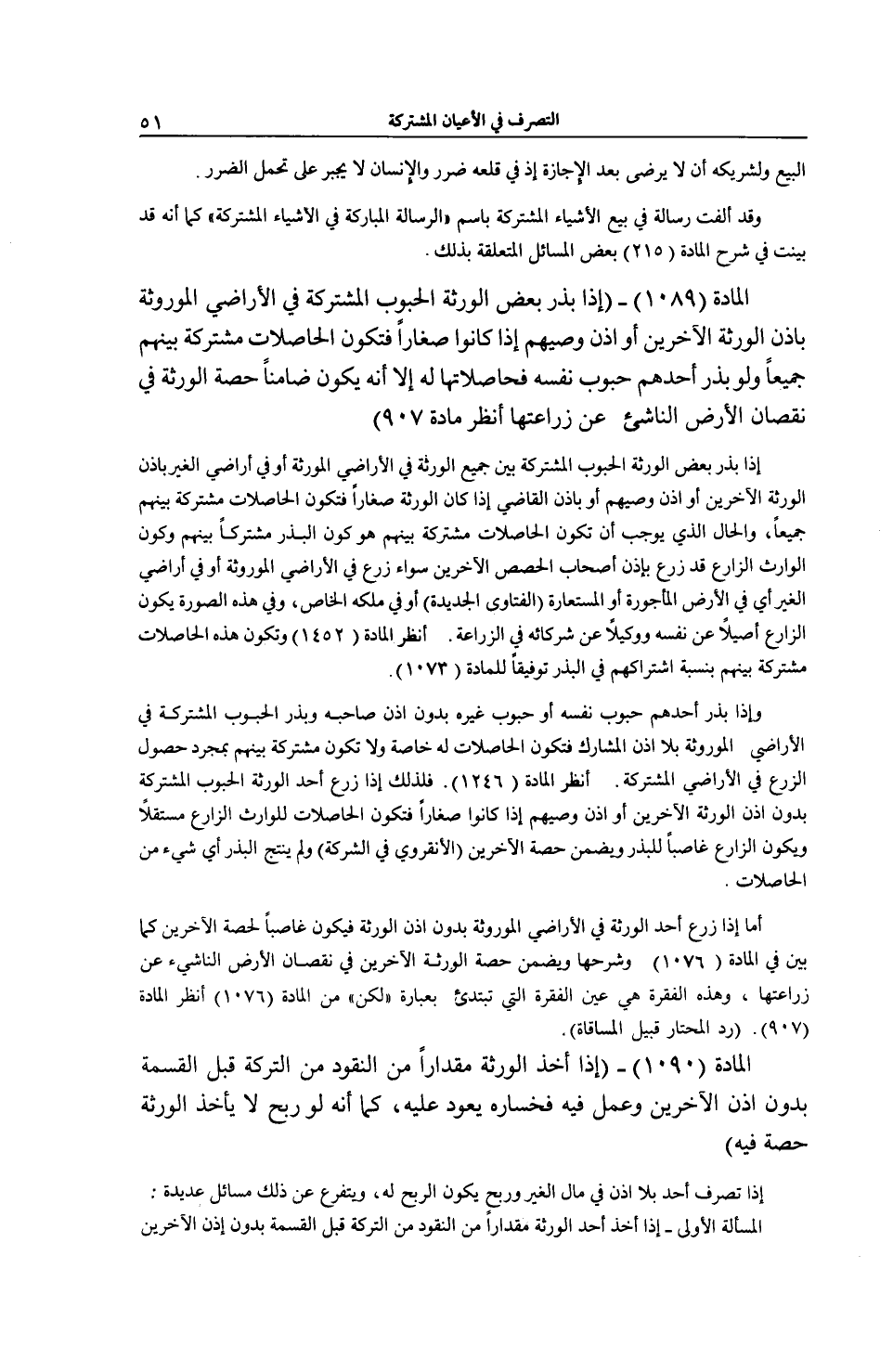 الْمَادَّةِ (1089) - (إذَا بَذَرَ بَعْضُ الْوَرَثَةِ الْحُبُوبَ الْمُشْتَرَكَةَ فِي الْأَرَاضِي الْمَوْرُوثَةِ بِإِذْنِ الْوَرَثَةِ الْآخَرِينَ أَوْ إذْنِ وَصِيِّهِمْ إذَا كَانُوا صِغَارًا فَتَكُونُ الْحَاصِلَاتُ مُشْتَرَكَةً بَيْنَهُمْ جَمِيعًا وَلَوْ بَذَرَ أَحَدُهُمْ حُبُوبَ نَفْسِهِ فَحَاصِلَاتُهَا لَهُ إلَّا أَنَّهُ يَكُونُ ضَامِنًا حِصَّةَ الْوَرَثَةِ فِي نُقْصَانِ الْأَرْضِ النَّاشِئِ عَنْ زِرَاعَتِهَا اُنْظُرْ مَادَّةَ 7 0 9) إذَا بَذَرَ بَعْضُ الْوَرَثَةِ الْحُبُوبَ الْمُشْتَرَكَةَ بَيْنَ جَمِيعِ الْوَرَثَةِ فِي الْأَرَاضِي الْمُورِثَةِ أَوْ فِي أَرَاضِي الْغَيْرِ بِإِذْنِ الْوَرَثَةِ الْآخَرِينَ أَوْ إذْنِ وَصِيِّهِمْ أَوْ بِإِذْنِ الْقَاضِي إذَا كَانَ الْوَرَثَةُ صِغَارًا فَتَكُونُ الْحَاصِلَاتُ مُشْتَرَكَةً بَيْنَهُمْ جَمِيعًا، وَالْحَالُ الَّذِي يُوجِبُ أَنْ تَكُونَ الْحَاصِلَاتُ مُشْتَرَكَةً بَيْنَهُمْ هُوَ كَوْنُ الْبَذْرِ مُشْتَرَكًا بَيْنَهُمْ وَكَوْنُ الْوَارِثِ الزَّارِعِ قَدْ زَرَعَ بِإِذْنِ أَصْحَابِ الْحِصَصِ الْآخَرِينَ سَوَاءٌ زَرَعَ فِي الْأَرَاضِيِ الْمَوْرُوثَةِ أَوْ فِي أَرَاضِي الْغَيْرِ أَيْ فِي الْأَرْضِ الْمَأْجُورَةِ أَوْ الْمُسْتَعَارَةِ (الْفَتَاوَى الْجَدِيدَةِ) أَوْ فِي مِلْكِهِ الْخَاصِّ، وَفِي هَذِهِ الصُّورَةِ يَكُونُ الزَّارِعُ أَصِيلًا عَنْ نَفْسِهِ وَوَكِيلًا عَنْ شُرَكَائِهِ فِي الزِّرَاعَةِ. اُنْظُرْ الْمَادَّةَ (245 1) وَتَكُونُ هَذِهِ الْحَاصِلَاتُ مُشْتَرَكَةً بَيْنَهَا بِنِسْبَةِ اشْتِرَاكِهِمْ فِي الْبَذْرِ تَوْفِيقًا لِلْمَادَّةِ (73 0 1) وَإِذَا بَذَرَ أَحَدُهُمْ حُبُوبَ نَفْسِهِ أَوْ حُبُوبَ غَيْرِهِ بِدُونِ إذْنِ صَاحِبِهِ وَبَذَرَ الْحُبُوبَ الْمُشْتَرَكَةَ فِي الْأَرَاضِيِ الْمَوْرُوثَةِ بِلَا إذْنِ الْمُشَارِكِ فَتَكُونُ الْحَاصِلَاتُ لَهُ خَاصَّةً وَلَا تَكُونُ مُشْتَرَكَةً بَيْنَهُمْ بِمُجَرَّدِ حُصُولِ الزَّرْعِ فِي الْأَرَاضِيِ الْمُشْتَرَكَةِ. اُنْظُرْ الْمَادَّةَ (246 1) .