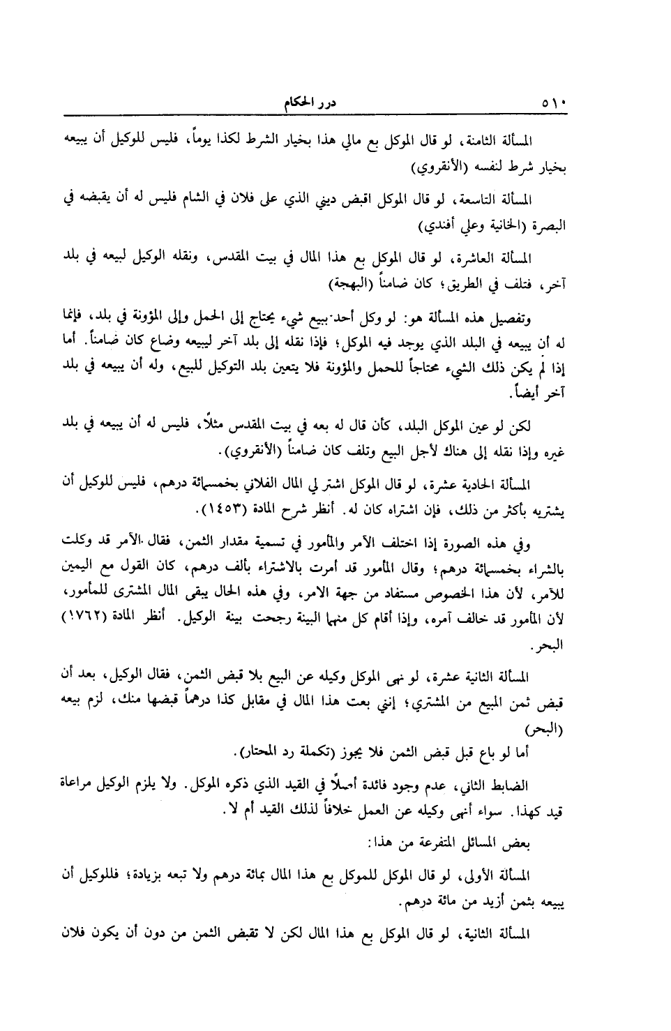 أَمَّا إذَا لَمْ يَكُنْ ذَلِكَ الشَّيْءُ مُحْتَاجًا لِلْحَمْلِ وَالْمُؤْنَةِ فَلَا يَتَعَيَّنُ بَلَدُ التَّوْكِيلِ لِلْبَيْعِ، وَلَهُ أَنْ يَبِيعَهُ فِي بَلَدٍ آخَرَ أَيْضًا. لَكِنْ لَوْ عَيَّنَ الْمُوَكِّلُ الْبَلَدَ، كَأَنْ قَالَ لَهُ: بِعْهُ فِي بَيْتِ الْمَقْدِسِ مَثَلًا، فَلَيْسَ لَهُ أَنْ يَبِيعَهُ فِي بَلَدٍ غَيْرَهُ وَإِذَا نَقَلَهُ إلَى هُنَاكَ لِأَجْلِ الْبَيْعِ وَتَلِفَ كَانَ ضَامِنًا (الْأَنْقِرْوِيُّ) . الْمَسْأَلَةُ الْحَادِيَةَ عَشْرَةَ، لَوْ قَالَ الْمُوَكِّلُ: اشْتَرِ لِي الْمَالَ الْفُلَانِيَّ بِخَمْسِمِائَةِ دِرْهَمٍ، فَلَيْسَ لِلْوَكِيلِ أَنْ يَشْتَرِيَهُ بِأَكْثَرَ مِنْ ذَلِكَ، فَإِنْ اشْتَرَاهُ كَانَ لَهُ. اُنْظُرْ شَرْحَ الْمَادَّةِ (453 1) . وَفِي هَذِهِ الصُّورَةِ إذَا اخْتَلَفَ الْآمِرُ وَالْمَأْمُورُ فِي تَسْمِيَةِ مِقْدَارِ الثَّمَنِ، فَقَالَ الْآمِرُ: قَدْ وَكَّلْتُ بِالشِّرَاءِ بِخَمْسِمِائَةِ دِرْهَمٍ وَقَالَ الْمَأْمُورُ: قَدْ أَمَرْتُ بِالِاشْتِرَاءِ بِأَلْفِ دِرْهَمٍ، كَانَ الْقَوْلُ مَعَ الْيَمِينِ لِلْآمِرِ؛ لِأَنَّ هَذَا الْخُصُوصَ مُسْتَفَادٌ مِنْ جِهَةِ الْأَمْرِ، وَفِي هَذِهِ الْحَالِ يَبْقَى الْمَالُ الْمُشْتَرَى لِلْمَأْمُورِ؛ لِأَنَّ الْمَأْمُورَ قَدْ خَالَفَ أَمْرَهُ، وَإِذَا أَقَامَ كُلٌّ مِنْهُمَا الْبَيِّنَةَ رُجِّحَتْ بَيِّنَةُ الْوَكِيلِ. اُنْظُرْ الْمَادَّةَ (1762) الْبَحْرُ. الْمَسْأَلَةُ الثَّانِيَةَ عَشْرَةَ، لَوْ نَهَى الْمُوَكِّلُ وَكِيلَهُ عَنْ الْبَيْعِ بِلَا قَبْضِ الثَّمَنِ، فَقَالَ الْوَكِيلُ، بَعْدَ أَنْ قَبَضَ ثَمَنَ الْمَبِيعِ مِنْ الْمُشْتَرِي: إنَّنِي بِعْت هَذَا الْمَالَ فِي مُقَابِلِ كَذَا دِرْهَمًا قَبَضَهَا مِنْك، لَزِمَ بَيْعُهُ (الْبَحْرُ) أَمَّا لَوْ بَاعَ قَبْلَ قَبْضِ الثَّمَنِ فَلَا يَجُوزُ (تَكْمِلَةُ رَدِّ الْمُحْتَارِ) . الضَّابِطُ الثَّانِي، عَدَمُ وُجُودِ فَائِدَةٍ أَصْلًا فِي الْقَيْدِ الَّذِي ذَكَرَهُ الْمُوَكِّلُ. وَلَا يَلْزَمُ الْوَكِيلَ مُرَاعَاةُ قَيْدٍ كَهَذَا. سَوَاءٌ أَنْهَى وَكِيلَهُ عَنْ الْعَمَلِ خِلَافًا لِذَلِكَ الْقَيْدِ أَمْ لَا. بَعْضُ الْمَسَائِلِ الْمُتَفَرِّعَةِ مِنْ هَذَا: الْمَسْأَلَةُ الْأُولَى، لَوْ قَالَ الْمُوَكِّلُ لِلْمُوَكَّلِ: بِعْ هَذَا الْمَالَ بِمِائَةِ دِرْهَمٍ وَلَا تَبِعْهُ بِزِيَادَةٍ فَلِلْوَكِيلِ أَنْ يَبِيعَهُ بِثَمَنٍ أَزْيَدَ مِنْ مِائَةِ دِرْهَمٍ.