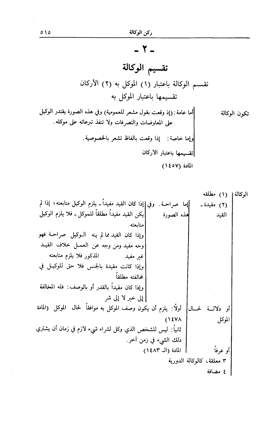 تَقْسِيمُ الْوَكَالَةِ تُقَسَّمُ الْوَكَالَةُ بِاعْتِبَارِ (1) الْمُوَكَّلُ بِهِ (2) الْأَرْكَانُ. تَقْسِيمُهَا بِاعْتِبَارِ الْمُوَكَّلِ بِهِ تَكُونُ الْوَكَالَةُ: إمَّا عَامَّةٌ: (إذَا وَقَعَتْ بِقَوْلٍ مُشْعِرٍ لِلْعُمُومِيَّةِ) وَفِي هَذِهِ الصُّورَةِ يَقْتَدِرُ الْوَكِيلُ عَلَى الْمُعَاوَضَاتِ وَالتَّصَرُّفَاتِ وَلَا تَنْفُذُ تَبَرُّعَاتُهُ عَلَى مُوَكِّلِهِ وَإِمَّا خَاصَّةٌ: إذَا وَقَعَتْ بِأَلْفَاظٍ تُشْعِرُ بِالْخُصُوصِيَّةِ تَقْسِيمُهَا بِاعْتِبَارِ الْأَرْكَانِ الْمَادَّةُ (1457) الْوَكَالَةُ (1) مُطْلَقَةٌ (2) مُقَيَّدَةٌ الْقَيْدُ إمَّا صَرَاحَةً وَفِي هَذِهِ الصُّورَةِ: إذَا كَانَ الْقَيْدُ مُفِيدًا يَلْزَمُ الْوَكِيلَ مُتَابَعَتُهُ إذَا لَمْ يَكُنْ الْقَيْدُ مُفِيدًا مُطْلَقًا لِلْمُوَكِّلِ فَلَا يَلْزَمُ الْوَكِيلَ مُتَابَعَتُهُ وَإِذَا كَانَ الْقَيْدُ مِمَّا لَمْ يُنْهَ الْوَكِيلُ صَرَاحَةً فَهُوَ وَجْهٌ مُفِيدٌ وَمِنْ وَجْهٍ عَنْ الْعَمَلِ خِلَافَ الْقَيْدِ غَيْرُ مُفِيدٍ. الْمَذْكُورُ فَلَا يَلْزَمُ مُتَابَعَتُهُ وَإِذَا كَانَتْ مُقَيَّدَةً بِالْجِنْسِ فَلَا حَقَّ لِلْوَكِيلِ فِي مُخَالَفَتِهِ مُطْلَقًا وَإِذَا كَانَ مُقَيَّدًا بِالْقَدْرِ أَوْ بِالْوَصْفِ: فَلَهُ الْمُخَالَفَةُ إلَى خَيْرٍ لَا إلَى شَرٍّ أَوْ دَلَالَةٌ لِحَالِ الْمُوَكِّلِ أَوَّلًا: يَلْزَمُ أَنْ يَكُونَ وَصْفُ الْمُوَكَّلِ بِهِ مُوَافِقًا لِحَالِ الْمُوَكِّلِ (الْمَادَّةُ 1478) ثَانِيًا: لَيْسَ لِلشَّخْصِ الَّذِي وُكِّلَ لِشِرَاءِ شَيْءٍ لَازِمٍ فِي زَمَانٍ أَنْ يَشْتَرِيَ ذَلِكَ الشَّيْءَ فِي زَمَنٍ آخَرَ الْمَادَّةُ (الـ 1483) أَوْ عُرْفًا 3 مُعَلَّقَةٌ، كَالْوَكَالَةِ الدَّوْرِيَّةِ 4 مُضَافَةٌ