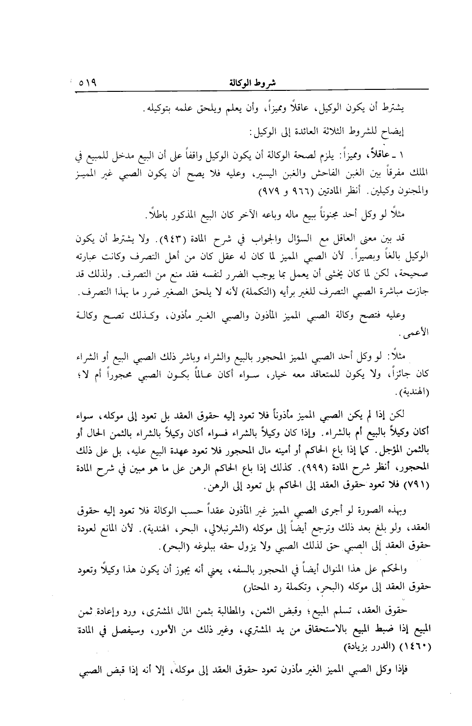 1 - عَاقِلًا، وَمُمَيِّزًا: يَلْزَمُ لِصِحَّةِ الْوَكَالَةِ أَنْ يَكُونَ الْوَكِيلُ وَاقِفًا عَلَى أَنَّ الْبَيْعَ مَدْخَلٌ لِلْمَبِيعِ فِي الْمِلْكِ مُفَرِّقًا بَيْنَ الْغَبْنِ الْفَاحِشِ وَالْغَبْنِ الْيَسِيرِ، وَعَلَيْهِ فَلَا يَصِحُّ أَنْ يَكُونَ الصَّبِيُّ غَيْرُ الْمُمَيِّزِ وَالْمَجْنُونِ وَكِيلَيْنِ. اُنْظُرْ الْمَادَّتَيْنِ (966 وَ 979) مَثَلًا لَوْ وَكَّلَ أَحَدٌ مَجْنُونًا بِبَيْعِ مَالِهِ وَبَاعَهُ الْآخَرُ كَانَ الْبَيْعُ الْمَذْكُورُ بَاطِلًا. قَدْ بُيِّنَ مَعْنَى الْعَاقِلِ مَعَ السُّؤَالِ وَالْجَوَابِ فِي شَرْحِ الْمَادَّةِ (943) . وَلَا يُشْتَرَطُ أَنْ يَكُونَ الْوَكِيلُ بَالِغًا وَبَصِيرًا؛ لِأَنَّ الصَّبِيَّ الْمُمَيِّزَ لَمَّا كَانَ لَهُ عَقْلٌ كَانَ مِنْ أَهْلِ التَّصَرُّفِ وَكَانَتْ عِبَارَتُهُ صَحِيحَةً، لَكِنْ لَمَّا كَانَ يُخْشَى أَنْ يَعْمَلَ بِمَا يُوجِبُ الضَّرَرَ لِنَفْسِهِ فَقَدْ مُنِعَ مِنْ التَّصَرُّفِ وَلِذَلِكَ قَدْ جَازَتْ مُبَاشَرَةُ الصَّبِيِّ التَّصَرُّفَ لِلْغَيْرِ بِرَأْيِهِ (التَّكْمِلَةُ) ؛ لِأَنَّهُ لَا يَلْحَقُ الصَّغِيرَ ضَرَرٌ مَا بِهَذَا التَّصَرُّفِ. وَعَلَيْهِ فَتَصِحُّ وَكَالَةُ الصَّبِيِّ الْمُمَيِّزِ الْمَأْذُونِ وَالصَّبِيِّ الْغَيْرِ مَأْذُونٍ، وَكَذَلِكَ تَصِحُّ وَكَالَةُ الْأَعْمَى مَثَلًا: لَوْ وَكَّلَ أَحَدٌ الصَّبِيَّ الْمُمَيِّزَ الْمَحْجُورَ بِالْبَيْعِ وَالشِّرَاءِ وَبَاشَرَ ذَلِكَ الصَّبِيُّ الْبَيْعَ أَوْ الشِّرَاءَ كَانَ جَائِزًا، وَلَا يَكُونُ لِلْمُتَعَاقِدِ مَعَهُ خِيَارٌ، سَوَاءٌ أَكَانَ عَالِمًا بِكَوْنِ الصَّبِيِّ مَحْجُورًا أَمْ لَا (الْهِنْدِيَّةُ) .