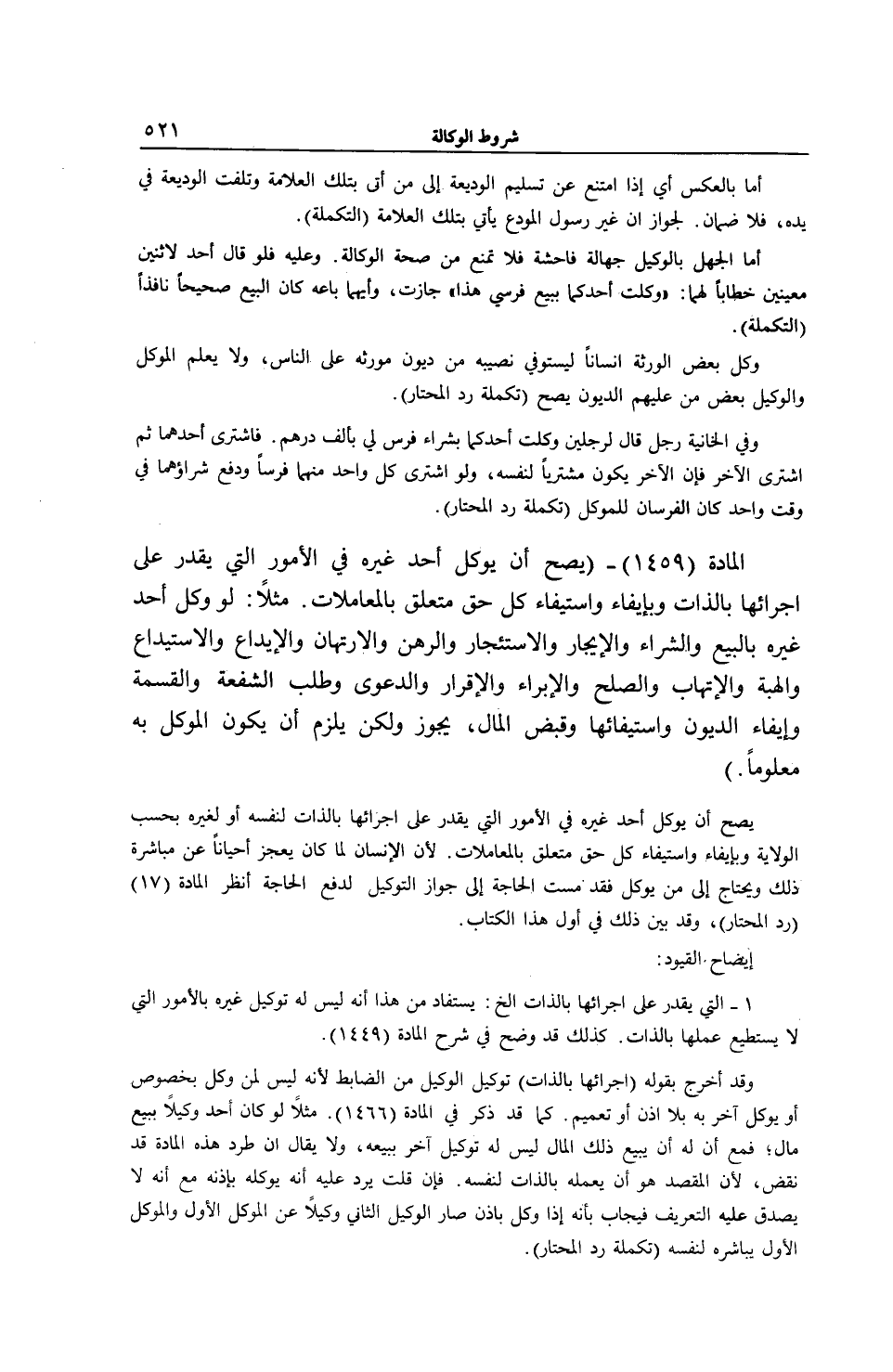 [ (الْمَادَّةُ 1459) يَصِحُّ أَنْ يُوَكِّلَ أَحَدٌ غَيْرَهُ فِي الْأُمُورِ الَّتِي يَقْدِرُ عَلَى إجْرَائِهَا بِالذَّاتِ]