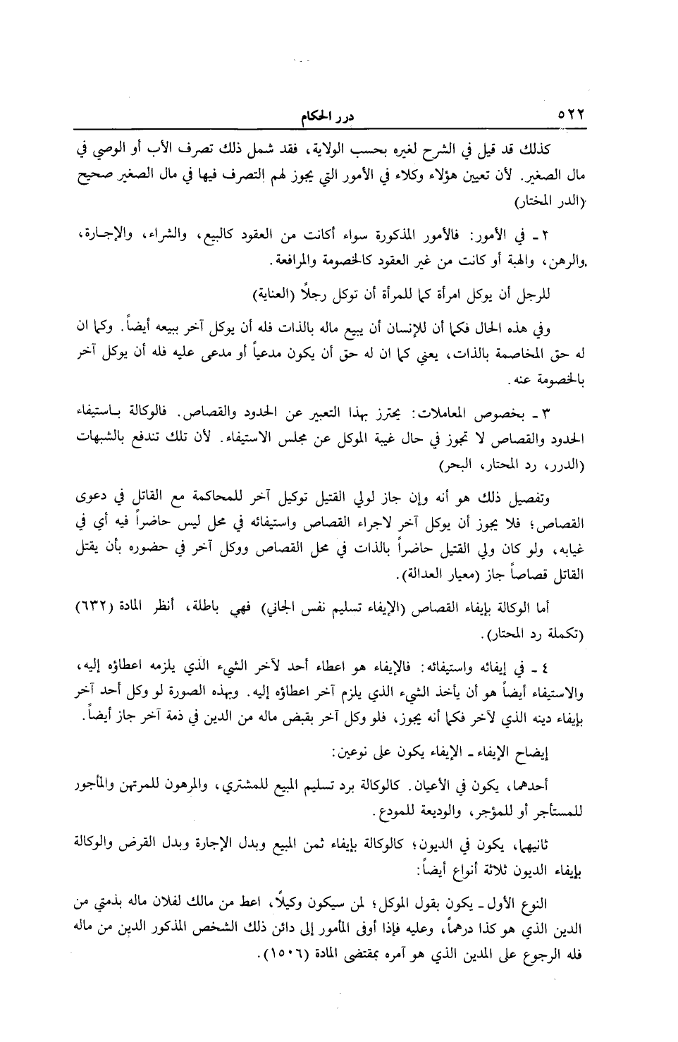 2 - فِي الْأُمُورِ: فَالْأُمُورُ الْمَذْكُورَةُ سَوَاءٌ أَكَانَتْ مِنْ الْعُقُودِ كَالْبَيْعِ، وَالشِّرَاءِ، وَالْإِجَارَةِ، وَالرَّهْنِ، وَالْهِبَةِ أَوْ كَانَتْ مِنْ غَيْرِ الْعُقُودِ كَالْخُصُومَةِ وَالْمُرَافَعَةِ. لِلرَّجُلِ أَنْ يُوَكِّلَ امْرَأَةً كَمَا لِلْمَرْأَةِ أَنْ تُوَكِّلَ رَجُلًا (الْعِنَايَةُ) وَفِي هَذِهِ الْحَالِ فَكَمَا أَنَّ لِلْإِنْسَانِ أَنْ يَبِيعَ مَالَهُ بِالذَّاتِ فَلَهُ أَنْ يُوَكِّلَ آخَرَ بِبَيْعِهِ أَيْضًا. وَكَمَا أَنَّ لَهُ حَقَّ الْمُخَاصَمَةِ بِالذَّاتِ، يَعْنِي كَمَا أَنَّ لَهُ حَقَّ أَنْ يَكُونَ مُدَّعِيًا أَوْ مُدَّعًى عَلَيْهِ فَلَهُ أَنْ يُوَكِّلَ آخَرَ بِالْخُصُومَةِ عَنْهُ. 3 - بِخُصُوصِ الْمُعَامَلَاتِ: يُحْتَرَزُ بِهَذَا التَّعْبِيرِ عَنْ الْحُدُودِ وَالْقِصَاصِ فَالْوَكَالَةُ بِاسْتِيفَاءِ الْحُدُودِ وَالْقِصَاصِ لَا تَجُوزُ فِي حَالِ غَيْبَةِ الْمُوَكِّلِ عَنْ مَجْلِسِ الِاسْتِيفَاءِ؛ لِأَنَّ تِلْكَ تَنْدَفِعُ بِالشُّبُهَاتِ (الدُّرَرُ، رَدُّ الْمُحْتَارِ، الْبَحْرُ) وَتَفْصِيلُ ذَلِكَ هُوَ أَنَّهُ وَإِنْ جَازَ لِوَلِيِّ الْقَتِيلِ تَوْكِيلُ آخَرَ لِلْمُحَاكَمَةِ مَعَ الْقَاتِلِ فِي دَعْوَى الْقِصَاصِ فَلَا يَجُوزُ أَنْ يُوَكِّلَ آخَرَ لِإِجْرَاءِ الْقِصَاصِ وَاسْتِيفَائِهِ فِي مَحَلٍّ لَيْسَ حَاضِرًا فِيهِ أَيْ فِي غِيَابِهِ وَلَوْ كَانَ وَلِيُّ الْقَتِيلِ حَاضِرًا بِالذَّاتِ فِي مَحَلِّ الْقِصَاصِ وَوَكَّلَ آخَرَ فِي حُضُورِهِ بِأَنْ يَقْتُلَ الْقَاتِلَ قِصَاصًا جَازَ (مِعْيَارُ الْعَدَالَةِ) أَمَّا الْوَكَالَةُ بِإِيفَاءِ الْقِصَاصِ (الْإِيفَاءُ تَسْلِيمُ نَفْسِ الْجَانِي) فَهِيَ بَاطِلَةٌ، اُنْظُرْ الْمَادَّةِ (632) (تَكْمِلَةُ رَدِّ الْمُحْتَارِ) 4 - فِي إيفَائِهِ وَاسْتِيفَائِهِ: فَالْإِيفَاءُ هُوَ إعْطَاءُ أَحَدٍ لِآخَرَ الشَّيْءَ الَّذِي يَلْزَمُهُ إعْطَاؤُهُ إلَيْهِ، وَالِاسْتِيفَاءُ أَيْضًا هُوَ أَنْ يَأْخُذَ الشَّيْءَ الَّذِي يَلْزَمُ آخَرَ إعْطَاؤُهُ إلَيْهِ. وَبِهَذِهِ الصُّورَةِ لَوْ وَكَّلَ أَحَدٌ آخَرَ بِإِيفَاءِ دَيْنِهِ الَّذِي لِآخَرَ فَكَمَا أَنَّهُ يَجُوزُ، فَلَوْ وَكَّلَ آخَرَ بِقَبْضِ مَالِهِ مِنْ الدَّيْنِ فِي ذِمَّةِ آخَرَ جَازَ أَيْضًا. إيضَاحُ الْإِيفَاءِ - الْإِيفَاءُ يَكُونُ عَلَى نَوْعَيْنِ: أَحَدُهُمَا، يَكُونُ فِي الْأَعْيَانِ. كَالْوَكَالَةِ بِرَدِّ تَسْلِيمِ الْمَبِيعِ لِلْمُشْتَرِي، وَالْمَرْهُونِ لِلْمُرْتَهِنِ وَالْمَأْجُورِ لِلْمُسْتَأْجِرِ أَوْ لِلْمُؤَجِّرِ، الْوَدِيعَةِ لِلْمُودِعِ. ثَانِيهِمَا، يَكُونُ فِي الدُّيُونِ كَالْوَكَالَةِ بِإِيفَاءِ ثَمَنِ الْمَبِيعِ وَبَدَلِ الْإِجَارَةِ وَبَدَلِ الْقَرْضِ.