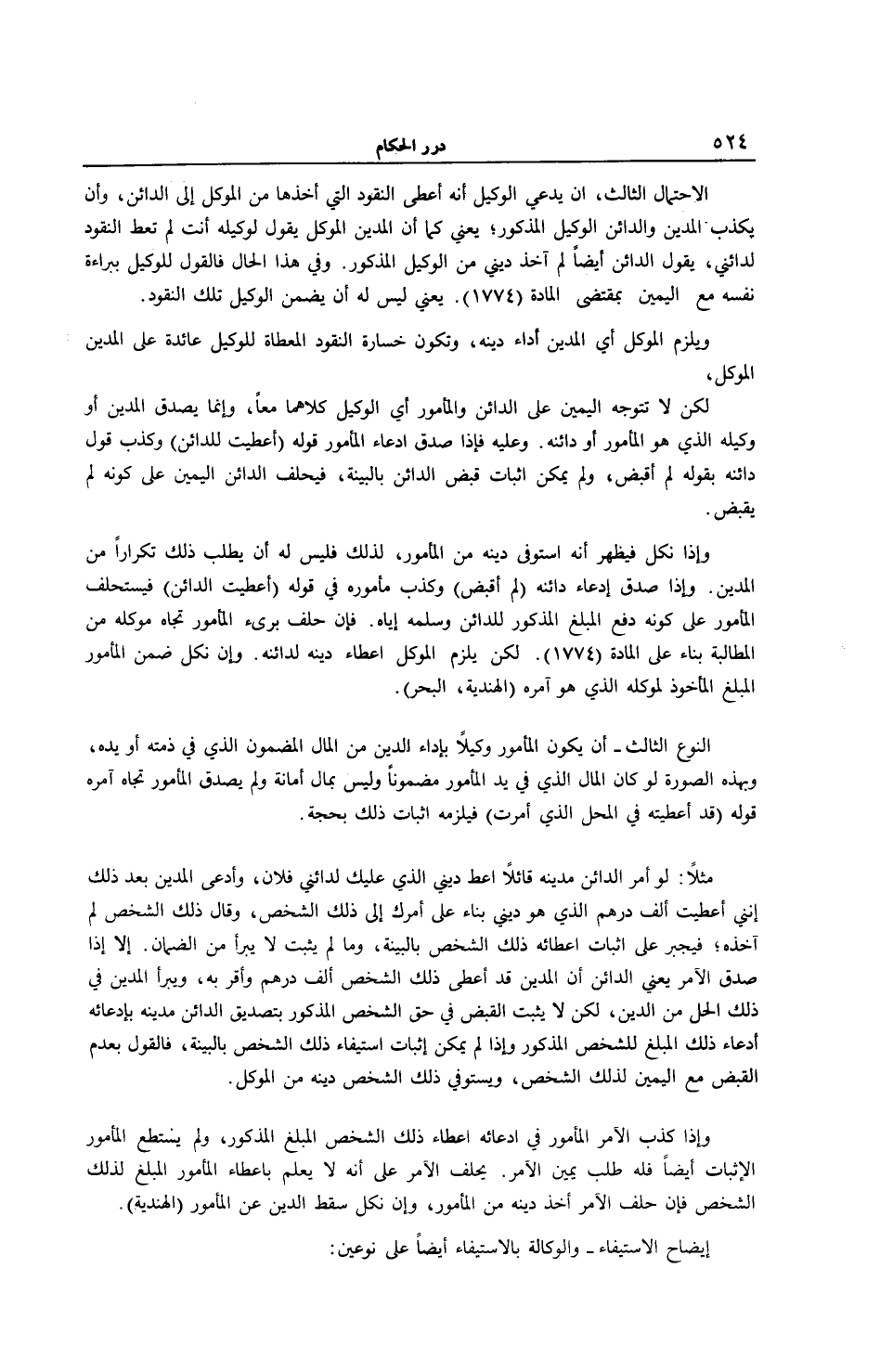 الِاحْتِمَالُ الثَّالِثُ، أَنْ يَدَّعِيَ الْوَكِيلُ أَنَّهُ أَعْطَى النُّقُودَ الَّتِي أَخَذَهَا مِنْ الْمُوَكِّلِ إلَى الدَّائِنِ، وَأَنْ يُكَذِّبَ الْمَدِينُ وَالدَّائِنُ الْوَكِيلَ الْمَذْكُورَ يَعْنِي كَمَا أَنَّ الْمَدِينَ الْمُوَكِّلَ يَقُولُ لِوَكِيلِهِ أَنْتَ لَمْ تُعْطِ النُّقُودَ لِدَائِنِي، يَقُولُ الدَّائِنُ أَيْضًا لَمْ آخُذْ دَيْنِي مِنْ الْوَكِيلِ الْمَذْكُورِ. وَفِي هَذَا الْحَالِ فَالْقَوْلُ لِلْوَكِيلِ بِبَرَاءَةِ نَفْسِهِ مَعَ الْيَمِينِ بِمُقْتَضَى الْمَادَّةِ (1774) يَعْنِي لَيْسَ لَهُ أَنْ يُضَمِّنَ الْوَكِيلَ تِلْكَ النُّقُودَ. وَيَلْزَمُ الْمُوَكِّلَ أَيْ الْمَدِينَ أَدَاءُ دَيْنِهِ، وَتَكُونُ خَسَارَةُ النُّقُودِ الْمُعْطَاةِ لِلْوَكِيلِ عَائِدَةً عَلَى الْمَدِينِ الْمُوَكِّلِ، لَكِنْ لَا تَتَوَجَّهُ الْيَمِينُ عَلَى الدَّائِنِ وَالْمَأْمُورِ أَيْ الْوَكِيلِ كِلَاهُمَا مَعًا، وَإِنَّمَا يُصَدِّقُ الْمَدِينُ أَوْ وَكِيلُهُ الَّذِي هُوَ الْمَأْمُورُ أَوْ دَائِنُهُ. وَعَلَيْهِ فَإِذَا صَدَّقَ ادِّعَاءَ الْمَأْمُورِ قَوْلَهُ (أَعْطَيْتُ لِلدَّائِنِ) وَكَذَّبَ قَوْلَ دَائِنِهِ بِقَوْلِهِ لَمْ أَقْبِضْ، وَلَمْ يُمْكِنْ إثْبَاتُ قَبْضِ الدَّائِنِ بِالْبَيِّنَةِ، فَيَحْلِفُ الدَّائِنُ الْيَمِينَ عَلَى كَوْنِهِ لَمْ يَقْبِضْ وَإِذَا نَكَلَ فَيَظْهَرُ أَنَّهُ اسْتَوْفَى دَيْنَهُ مِنْ الْمَأْمُورِ، لِذَلِكَ فَلَيْسَ لَهُ أَنْ يَطْلُبَ ذَلِكَ تَكْرَارًا مِنْ الْمَدِينِ.