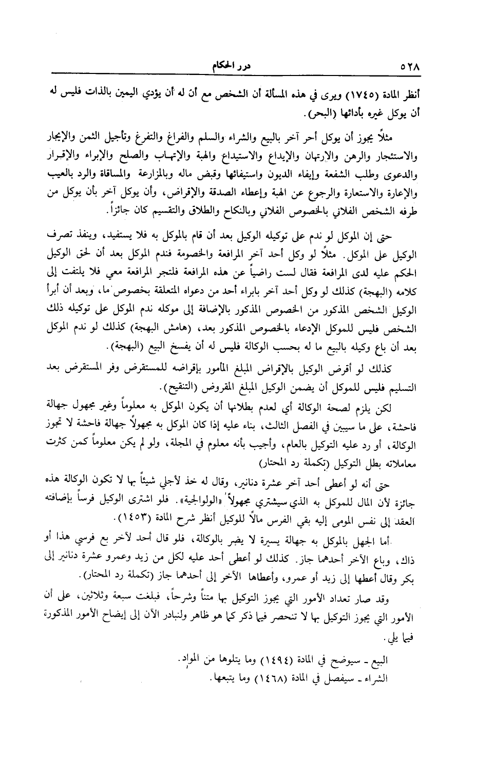 (تَكْمِلَةُ رَدِّ الْمُحْتَارِ) وَقَدْ صَارَ تَعْدَادُ الْأُمُورِ الَّتِي يَجُوزُ التَّوْكِيلُ بِهَا مَتْنًا وَشَرْحًا، فَبَلَغَتْ سَبْعَةً وَثَلَاثِينَ، عَلَى أَنَّ الْأُمُورَ الَّتِي يَجُوزُ التَّوْكِيلُ بِهَا لَا تَنْحَصِرُ فِيمَا ذُكِرَ كَمَا هُوَ ظَاهِرٌ وَلْنُبَادِرْ الْآنَ إلَى إيضَاحِ الْأُمُورِ الْمَذْكُورَةِ فِيمَا يَلِي. الْبَيْعُ - سَيُوَضَّحُ فِي الْمَادَّةِ (1494) وَمَا يَتْلُوهَا مِنْ الْمَوَادِّ. الشِّرَاءُ - سَيُفَصَّلُ فِي الْمَادَّةِ (1468) وَمَا يَتْبَعُهَا.