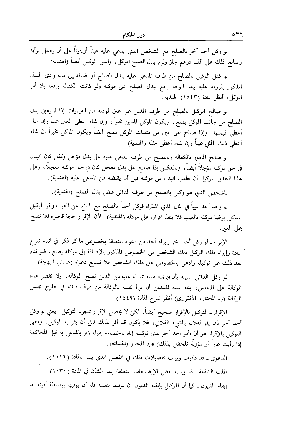 لَوْ وَكَّلَ أَحَدٌ آخَرَ بِالصُّلْحِ مَعَ الشَّخْصِ الَّذِي يَدَّعِي عَلَيْهِ عَيْنًا أَوْ دَيْنًا عَلَى أَنْ يَعْمَلَ بِرَأْيِهِ وَصَالَحَ ذَلِكَ عَلَى أَلْفِ دِرْهَمٍ جَازَ وَلَزِمَ بَدَلُ الصُّلْحِ الْمُوَكِّلَ، وَلَيْسَ الْوَكِيلَ أَيْضًا (الْهِنْدِيَّةُ) لَوْ كَفَلَ الْوَكِيلُ بِالصُّلْحِ مِنْ طَرَفِ الْمُدَّعَى عَلَيْهِ بِبَدَلِ الصُّلْحِ أَوْ أَضَافَهُ إلَى مَالِهِ وَأَدَّى الْبَدَلَ الْمَذْكُورَ بِلُزُومِهِ عَلَيْهِ بِهَذَا الْوَجْهِ رَجَعَ بِبَدَلِ الصُّلْحِ عَلَى مُوَكِّلِهِ وَلَوْ كَانَتْ الْكَفَالَةُ وَاقِعَةً بِلَا أَمْرِ الْمُوَكِّلِ، اُنْظُرْ الْمَادَّةَ (1543) الْهِنْدِيَّةُ. لَوْ صَالَحَ الْوَكِيلُ بِالصُّلْحِ مِنْ طَرَفِ الْمَدِينِ عَلَى عَيْنٍ لِمُوَكِّلِهِ مِنْ الْقِيَمِيَّاتِ إذَا لَمْ يُعَيَّنْ بَدَلُ الصُّلْحِ مِنْ جَانِبِ الْمُوَكِّلِ يَصِحُّ، وَيَكُونُ الْمُوَكِّلُ الْمَدِينُ مُخَيَّرًا، وَإِنْ شَاءَ أَعْطَى الْعَيْنَ عَيْنًا وَإِنْ شَاءَ أَعْطَى قِيمَتَهَا. وَإِذَا صَالَحَ عَلَى عَيْنٍ مِنْ مِثْلِيَّاتِ الْمُوَكِّلِ يَصِحُّ أَيْضًا وَيَكُونُ الْمُوَكِّلُ مُخَيَّرًا إنْ شَاءَ أَعْطَى ذَلِكَ الْمِثْلِيَّ عَيْنًا وَإِنْ شَاءَ أَعْطَى مِثْلَهُ (الْهِنْدِيَّةُ) . لَوْ صَالَحَ الْمَأْمُورُ بِالْكَفَالَةِ وَبِالصُّلْحِ مِنْ طَرَفِ الْمُدَّعَى عَلَيْهِ عَلَى بَدَلٍ مُؤَجَّلٍ وَكَفَلَ كَانَ الْبَدَلُ فِي حَقِّ مُوَكِّلِهِ مُؤَجَّلًا أَيْضًا وَبِالْعَكْسِ إذَا صَالَحَ عَلَى بَدَلٍ مُعَجَّلٍ كَانَ فِي حَقِّ مُوَكِّلِهِ مُعَجَّلًا، وَعَلَى هَذَا التَّقْدِيرِ لِلْوَكِيلِ أَنْ يَطْلُبَ الْبَدَلَ مِنْ مُوَكِّلِهِ قَبْلَ أَنْ يَقْبِضَهُ مِنْ الْمُدَّعَى عَلَيْهِ (الْهِنْدِيَّةُ) . لِلشَّخْصِ الَّذِي هُوَ وَكِيلٌ بِالصُّلْحِ مِنْ طَرَفِ الدَّائِنِ قَبْضُ بَدَلِ الصُّلْحِ (الْهِنْدِيَّةُ) . لَوْ وَجَدَ أَحَدٌ عَيْبًا فِي الْمَالِ الَّذِي اشْتَرَاهُ فَوَكَّلَ أَحَدًا بِالصُّلْحِ مَعَ الْبَائِعِ عَنْ الْعَيْبِ وَأَقَرَّ الْوَكِيلُ الْمَذْكُورُ بِرِضَا مُوَكِّلِهِ بِالْعَيْبِ فَلَا يَنْفُذُ إقْرَارُهُ عَلَى مُوَكِّلِهِ (الْهِنْدِيَّةُ) ؛ لِأَنَّ الْإِقْرَارَ حُجَّةٌ قَاصِرَةٌ فَلَا تَصِحُّ عَلَى الْغَيْرِ.