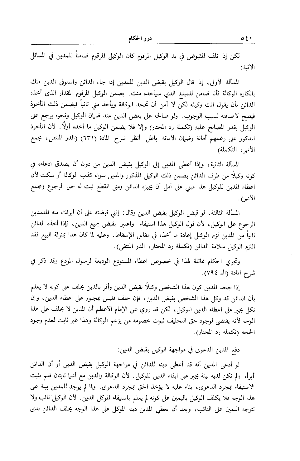 لَكِنْ. إذَا تَلِفَ الْمَقْبُوضُ فِي يَدِ الْوَكِيلِ الْمَرْقُومِ كَانَ الْوَكِيلُ الْمَرْقُومُ ضَامِنًا لِلْمَدِينِ فِي الْمَسَائِلِ الْآتِيَةِ: الْمَسْأَلَةُ الْأُولَى، إذَا قَالَ الْوَكِيلُ بِقَبْضِ الدَّيْنِ لِلْمَدِينِ: إذَا جَاءَ الدَّائِنُ وَاسْتَوْفَى الدَّيْنَ مِنْكَ بِإِنْكَارِهِ الْوَكَالَةَ فَأَنَا ضَامِنٌ لِلْمَبْلَغِ الَّذِي سَيَأْخُذُهُ مِنْكَ. يَضْمَنُ الْوَكِيلُ الْمَرْقُومُ الْمِقْدَارَ الَّذِي أَخَذَهُ الدَّائِنُ بِأَنْ يَقُولَ أَنْتَ وَكِيلُهُ لَكِنْ لَا آمَنُ أَنْ تَجْحَدَ الْوَكَالَةَ وَيَأْخُذَ مِنِّي ثَانِيًا فَيَضْمَنُ ذَلِكَ الْمَأْخُوذَ فَيَصِحُّ لِإِضَافَتِهِ لِسَبَبِ الْوُجُوبِ.