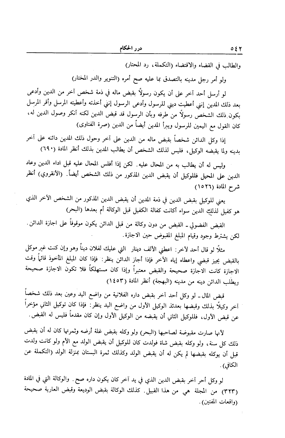 وَالطَّالِبِ فِي الْقَضَاءِ وَالِاقْتِضَاءِ (التَّكْمِلَةُ، رَدُّ الْمُحْتَارِ) وَلَوْ أَمَرَ رَجُلٌ مَدِينَهُ بِالتَّصَدُّقِ بِمَا عَلَيْهِ صَحَّ أَمْرُهُ (التَّنْوِيرُ وَالدُّرُّ الْمُخْتَارُ) لَوْ أَرْسَلَ أَحَدٌ آخَرَ عَلَى أَنْ يَكُونَ رَسُولًا بِقَبْضِ مَالِهِ فِي ذِمَّةِ شَخْصٍ آخَرَ مِنْ الدَّيْنِ وَادَّعَى بَعْدَ ذَلِكَ الْمَدِينُ إنَّنِي أَعْطَيْتُ دَيْنِي لِلرَّسُولِ وَادَّعَى الرَّسُولُ إنَّنِي أَخَذْته وَأَعْطَيْتُهُ الْمُرْسِلَ وَأَقَرَّ الْمُرْسِلُ بِكَوْنِ ذَلِكَ الشَّخْصِ رَسُولًا مِنْ طَرَفِهِ وَبِأَنَّ الرَّسُولَ قَدْ قَبَضَ الدَّيْنَ لَكِنَّهُ أَنْكَرَ وُصُولَ الدَّيْنِ لَهُ، كَانَ الْقَوْلُ مَعَ الْيَمِينِ لِلرَّسُولِ وَيَبْرَأُ الْمَدِينُ أَيْضًا مِنْ الدَّيْنِ (صُرَّةُ الْفَتَاوَى) إذَا وَكَّلَ الدَّائِنُ شَخْصًا بِقَبْضِ مَالٍ مِنْ الدَّيْنِ عَلَى آخَرَ وَحَوَّلَ ذَلِكَ الْمَدِينُ دَائِنَهُ عَلَى آخَرَ بِدَيْنِهِ وَلَمَّا يَقْبِضْهُ الْوَكِيلُ، فَلَيْسَ لِذَلِكَ الشَّخْصِ أَنْ يُطَالِبَ الْمَدِينَ بِذَلِكَ اُنْظُرْ الْمَادَّةَ (690)