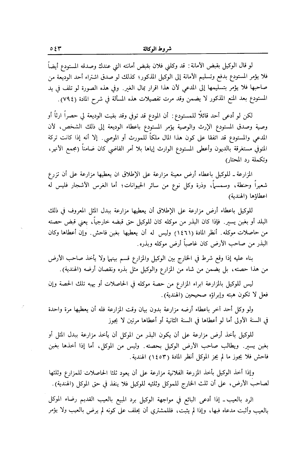 وَلَوْ وَكَّلَ أَحَدٌ آخَرَ بِإِعْطَاءِ أَرْضِهِ مُزَارَعَةً بِدُونِ بَيَانِ وَقْتِ الْمُزَارَعَةِ فَلَهُ أَنْ يُعْطِيَهَا مَرَّةً وَاحِدَةً فِي السَّنَةِ الْأُولَى أَمَّا لَوْ أَعْطَاهَا فِي السَّنَةِ الثَّانِيَةِ أَوْ أَعْطَاهَا مَرَّتَيْنِ لَا يَجُوزُ لِلْوَكِيلِ بِأَخْذِ أَرْضٍ مُزَارَعَةً عَلَى أَنْ يَكُونَ الْبَذْرُ مِنْ الْمُوَكِّلِ أَنْ يَأْخُذَ مُزَارَعَةً بِبَدَلِ الْمِثْلِ أَوْ بِغَبْنٍ يَسِيرٍ. وَيُطَالِبُ صَاحِبُ الْأَرْضِ الْوَكِيلَ بِحِصَّتِهِ. وَلَيْسَ مِنْ الْمُوَكِّلِ، أَمَّا إذَا أَخَذَهَا بِغَبْنٍ فَاحِشٍ فَلَا يَجُوزُ مَا لَمْ يُجِزْ الْمُوَكِّلُ اُنْظُرْ الْمَادَّةَ (1453) الْهِنْدِيَّةُ. وَإِذَا أَخَذَ الْوَكِيلُ بِأَخْذِ الْمَزْرَعَةِ الْفُلَانِيَّةِ مُزَارَعَةً عَلَى أَنْ يَعُودَ ثُلُثَا الْحَاصِلَاتِ لِلْمُزَارِعِ وَثُلُثُهَا لِصَاحِبِ الْأَرْضِ، عَلَى أَنَّ ثُلُثَ الْخَارِجِ لِلْمُوَكِّلِ وَثُلُثَيْهِ لِلْوَكِيلِ فَلَا يَنْفُذُ فِي حَقِّ الْمُوَكِّلِ (الْهِنْدِيَّةُ) . الرَّدُّ بِالْعَيْبِ - إذَا ادَّعَى الْبَائِعُ فِي مُوَاجَهَةِ الْوَكِيلِ بِرَدِّ الْمَبِيعِ بِالْعَيْبِ الْقَدِيمِ رِضَاءَ الْمُوَكِّلِ بِالْعَيْبِ وَأَثْبَتَ مُدَّعَاهُ فَبِهَا، وَإِذَا لَمْ يُثْبِتْ، فَلِلْمُشْتَرِي أَنْ يَحْلِفَ عَلَى كَوْنِهِ لَمْ يَرْضَ بِالْعَيْبِ وَلَا يُؤْمَرُ
