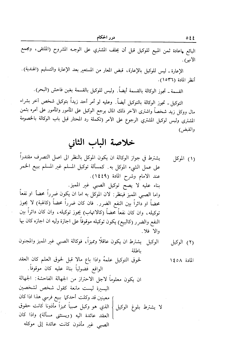 (2) الْوَكِيلُ: الْوَكِيلُ يُشْتَرَطُ أَنْ يَكُونَ عَاقِلًا وَمُمَيِّزًا، فَوَكَالَةُ الصَّبِيِّ غَيْرِ الْمُمَيِّزِ وَالْمَجْنُونِ بَاطِلَةٌ. الْمَادَّةُ 1458 لُحُوقُ التَّوْكِيلِ عِلْمَهُ وَإِذَا بَاعَ مَالًا قَبْلَ لُحُوقِ الْعِلْمِ كَانَ الْعَقْدُ الْوَاقِعُ فُضُولِيًّا بِنَاءً عَلَيْهِ كَانَ مَوْقُوفًا. أَنْ يَكُونَ مَعْلُومًا لِأَجْلِ الِاحْتِرَازِ مِنْ الْجَهَالَةِ الْفَاحِشَةِ: الْجَهَالَةُ الْيَسِيرَةُ لَيْسَتْ مَانِعَةً كَقَوْلِ شَخْصٍ لِشَخْصَيْنِ مُعَيَّنَيْنِ قَدْ وَكَّلْتُ أَحَدَكُمَا بِبَيْعِ فَرَسِي هَذَا إذَا كَانَ الَّذِي هُوَ وَكِيلٌ صَبِيًّا مُمَيِّزًا مَأْذُونًا كَانَتْ حُقُوقُ الْعَقْدِ عَائِدَةً إلَيْهِ (وَيُسْتَثْنَى مَسْأَلَةٌ) وَإِذَا كَانَ الصَّبِيُّ غَيْرَ مَأْذُونٍ كَانَتْ عَائِدَةً إلَى مُوَكِّلِهِ