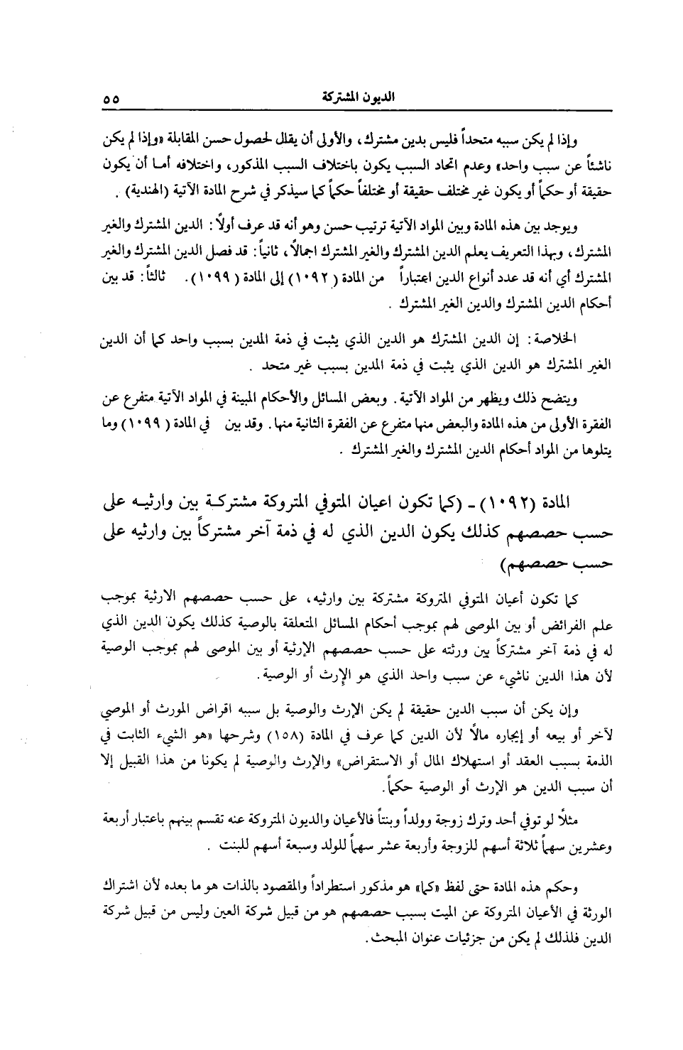 الْخُلَاصَةُ: أَنَّ الدَّيْنَ الْمُشْتَرَكَ هُوَ الدَّيْنُ الَّذِي يَثْبُتُ فِي ذِمَّةِ الْمَدِينِ بِسَبَبٍ وَاحِدٍ كَمَا أَنَّ الدَّيْنَ الْغَيْرَ الْمُشْتَرَكَ هُوَ الدَّيْنُ الَّذِي يَثْبُتُ فِي ذِمَّةِ الْمَدِينِ بِسَبَبٍ غَيْرِ مُتَّحِدٍ وَيَتَّضِحُ ذَلِكَ وَيَظْهَرُ مِنْ الْمَوَادِّ الْآتِيَةِ. وَبَعْضُ الْمَسَائِلِ وَالْأَحْكَامِ الْمُبَيَّنَةِ فِي الْمَوَادِّ الْآتِيَةِ مُتَفَرِّعٌ عَنْ الْفِقْرَةِ الْأُولَى مِنْ هَذِهِ الْمَادَّةِ وَالْبَعْضُ مِنْهَا مُتَفَرِّعٌ عَنْ الْفِقْرَةِ الثَّانِيَةِ مِنْهَا. وَقَدْ بَيَّنَ فِي الْمَادَّةِ (99 0 1) وَمَا يَتْلُوهَا مِنْ الْمَوَادِّ أَحْكَامَ الدَّيْنِ الْمُشْتَرَكِ وَالْغَيْرِ الْمُشْتَرَكِ. .