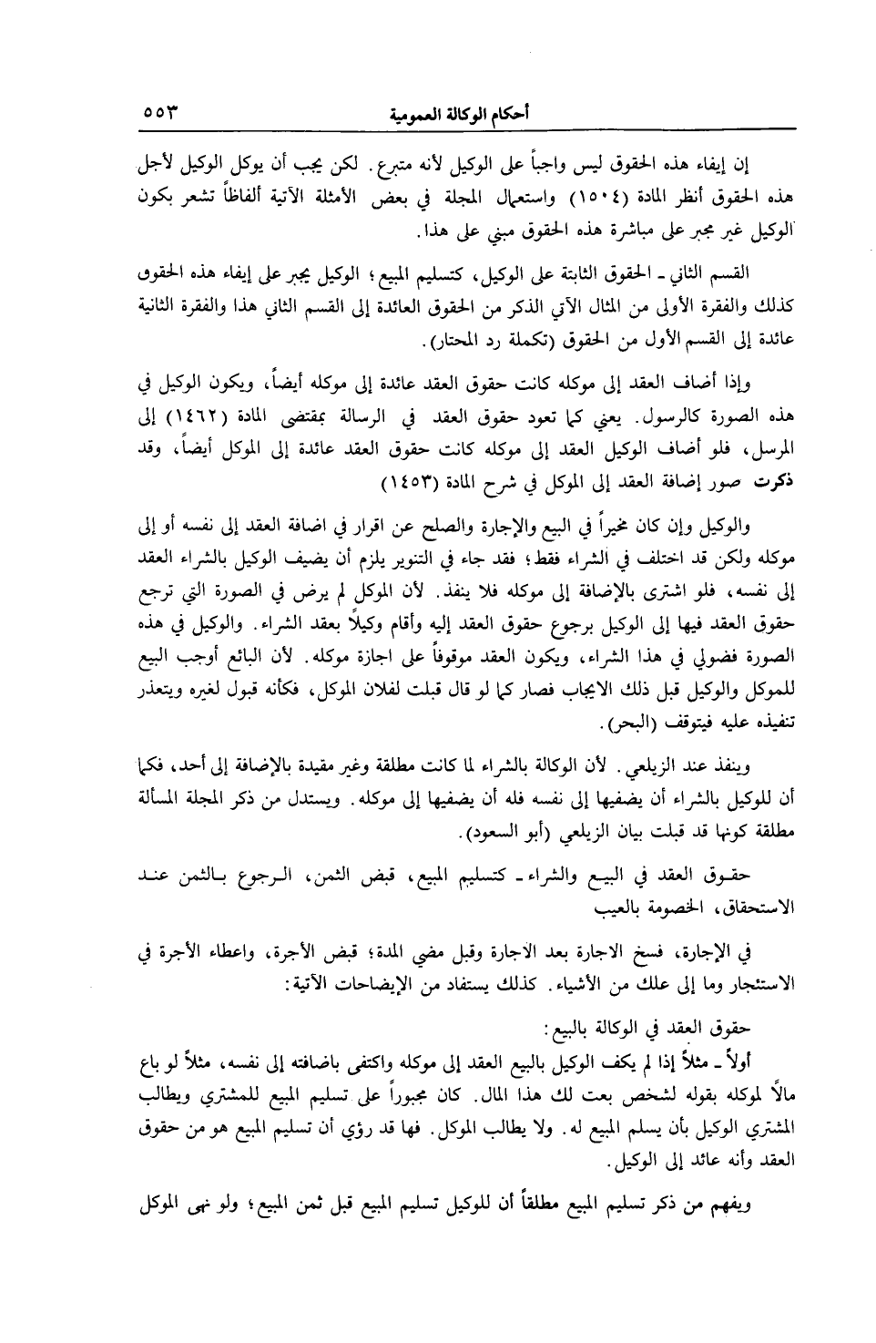 الْقِسْمُ الثَّانِي - الْحُقُوقُ الثَّابِتَةُ عَلَى الْوَكِيلِ، كَتَسْلِيمِ الْمَبِيعِ الْوَكِيلُ يُجْبَرُ عَلَى إيفَاءِ هَذِهِ الْحُقُوقِ كَذَلِكَ وَالْفِقْرَةُ الْأُولَى مِنْ الْمِثَالِ الْآتِي الذِّكْرِ مِنْ الْحُقُوقِ الْعَائِدَةِ إلَى الْقِسْمِ الثَّانِي هَذَا وَالْفِقْرَةُ الثَّانِيَةُ عَائِدَةٌ إلَى الْقِسْمِ الْأَوَّلِ مِنْ الْحُقُوقِ (تَكْمِلَةُ رَدِّ الْمُحْتَارِ) . وَإِذَا أَضَافَ الْعَقْدَ إلَى مُوَكِّلِهِ كَانَتْ حُقُوقُ الْعَقْدِ عَائِدَةً إلَى مُوَكِّلِهِ أَيْضًا، وَيَكُونُ الْوَكِيلُ فِي هَذِهِ الصُّورَةِ كَالرَّسُولِ يَعْنِي كَمَا تَعُودُ حُقُوقُ الْعَقْدِ فِي الرِّسَالَةِ بِمُقْتَضَى الْمَادَّةِ (1462) إلَى الْمُرْسِلِ، فَلَوْ أَضَافَ الْوَكِيلُ الْعَقْدَ إلَى مُوَكِّلِهِ كَانَتْ حُقُوقُ الْعَقْدِ عَائِدَةً إلَى الْمُوَكِّلِ أَيْضًا، وَقَدْ ذُكِرَتْ صُوَرُ إضَافَةِ الْعَقْدِ إلَى الْمُوَكِّلِ فِي شَرْحِ الْمَادَّةِ (1453) وَالْوَكِيلُ وَإِنْ كَانَ مُخَيَّرًا فِي الْبَيْعِ وَالْإِجَارَةِ وَالصُّلْحِ عَنْ إقْرَارٍ فِي إضَافَةِ الْعَقْدِ إلَى نَفْسِهِ أَوْ إلَى مُوَكِّلِهِ وَلَكِنْ قَدْ اُخْتُلِفَ فِي الشِّرَاءِ فَقَطْ فَقَدْ جَاءَ فِي التَّنْوِيرِ يَلْزَمُ أَنْ يُضِيفَ الْوَكِيلُ بِالشِّرَاءِ الْعَقْدَ إلَى نَفْسِهِ، فَلَوْ اشْتَرَى بِالْإِضَافَةِ إلَى مُوَكِّلِهِ فَلَا يَنْفُذُ؛ لِأَنَّ الْمُوَكِّلَ لَمْ يَرْضَ فِي الصُّورَةِ الَّتِي تَرْجِعُ حُقُوقُ الْعَقْدِ فِيهَا إلَى الْوَكِيلِ بِرُجُوعِ حُقُوقِ الْعَقْدِ إلَيْهِ وَأَقَامَ وَكِيلًا بِعَقْدِ الشِّرَاءِ.