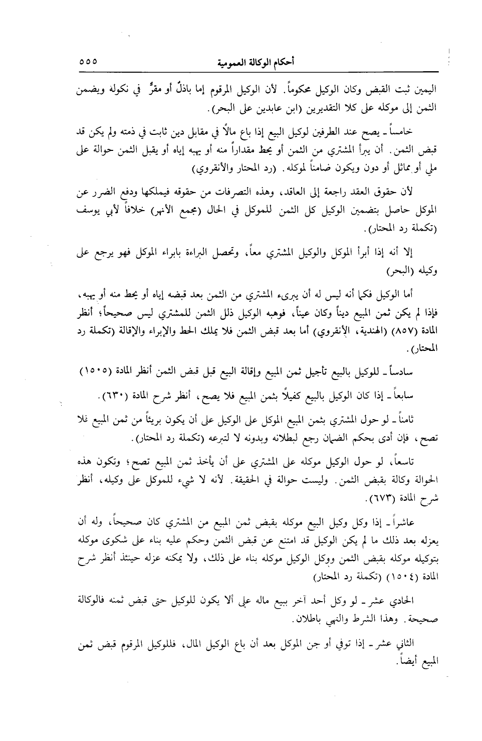 خَامِسًا - يَصِحُّ عِنْدَ الطَّرَفَيْنِ لِوَكِيلِ الْبَيْعِ إذَا بَاعَ مَالًا فِي مُقَابِلِ دَيْنٍ ثَابِتٍ فِي ذِمَّتِهِ وَلَمْ يَكُنْ قَدْ قَبَضَ الثَّمَنَ أَنْ يُبَرِّأَ الْمُشْتَرِيَ مِنْ الثَّمَنِ أَوْ يَحُطَّ مِقْدَارًا مِنْهُ أَوْ يَهَبَهُ إيَّاهُ أَوْ يَقْبَلَ الثَّمَنَ حَوَالَةً عَلَى مَلِيٍّ أَوْ مُمَاثِلٍ أَوْ دُونٍ وَيَكُونُ ضَامِنًا لِمُوَكِّلِهِ. (رَدُّ الْمُحْتَارِ وَالْأَنْقِرْوِيُّ) ؛ لِأَنَّ حُقُوقَ الْعَقْدِ رَاجِعَةٌ إلَى الْعَاقِدِ، وَهَذِهِ التَّصَرُّفَاتُ مِنْ حُقُوقِهِ فَيَمْلِكُهَا وَدَفْعُ الضَّرَرِ عَنْ الْمُوَكِّلِ حَاصِلٌ بِتَضْمِينِ الْوَكِيلِ كُلَّ الثَّمَنِ لِلْمُوَكِّلِ فِي الْحَالِ (مَجْمَعُ الْأَنْهُرِ) خِلَافًا لِأَبِي يُوسُفَ (تَكْمِلَةُ رَدِّ الْمُحْتَارِ) . إلَّا أَنَّهُ إذَا أَبْرَأَ الْمُوَكِّلُ وَالْوَكِيلُ الْمُشْتَرِيَ مَعًا، وَتَحْصُلُ الْبَرَاءَةُ بِإِبْرَاءِ الْمُوَكِّلِ فَهُوَ يَرْجِعُ عَلَى وَكِيلِهِ (الْبَحْرُ) أَمَّا الْوَكِيلُ فَكَمَا أَنَّهُ لَيْسَ لَهُ أَنْ يُبَرِّئَ الْمُشْتَرِيَ مِنْ الثَّمَنِ بَعْدَ قَبْضِهِ إيَّاهُ أَوْ يَحُطَّ مِنْهُ أَوْ يَهَبَهُ فَإِذَا لَمْ يَكُنْ ثَمَنُ الْمَبِيعِ دَيْنًا وَكَانَ عَيْنًا، فَوَهَبَهُ الْوَكِيلُ ذَلِكَ الثَّمَنَ لِلْمُشْتَرِي لَيْسَ صَحِيحًا اُنْظُرْ الْمَادَّةَ (857) (الْهِنْدِيَّةُ، الْأَنْقِرْوِيُّ) أَمَّا بَعْدَ قَبْضِ الثَّمَنِ فَلَا يَمْلِكُ الْحَطَّ وَالْإِبْرَاءَ وَالْإِقَالَةَ (تَكْمِلَةُ رَدِّ الْمُحْتَارِ) . سَادِسًا - لِلْوَكِيلِ بِالْبَيْعِ تَأْجِيلُ ثَمَنِ الْمَبِيعِ وَإِقَالَةُ الْبَيْعِ قَبْلَ قَبْضِ الثَّمَنِ اُنْظُرْ الْمَادَّةَ (1505) سَابِعًا - إذَا كَانَ الْوَكِيلُ بِالْبَيْعِ كَفِيلًا بِثَمَنِ الْمَبِيعِ فَلَا يَصِحُّ، اُنْظُرْ شَرْحَ الْمَادَّةِ (630) ثَامِنًا - لَوْ حَوَّلَ الْمُشْتَرِي بِثَمَنِ الْمَبِيعِ الْمُوَكِّلَ عَلَى الْوَكِيلِ عَلَى أَنْ يَكُونَ بَرِيئًا مِنْ ثَمَنِ الْمَبِيعِ فَلَا تَصِحُّ، فَإِنْ أَدَّى بِحُكْمِ الضَّمَانِ رَجَعَ لِبُطْلَانِهِ وَبِدُونِهِ لَا لِتَبَرُّعِهِ (تَكْمِلَةُ رَدِّ الْمُحْتَارِ) . تَاسِعًا، لَوْ حَوَّلَ الْوَكِيلُ مُوَكِّلَهُ عَلَى الْمُشْتَرِي عَلَى أَنْ يَأْخُذَ ثَمَنَ الْمَبِيعِ تَصِحُّ وَتَكُونُ هَذِهِ الْحَوَالَةُ وَكَالَةً بِقَبْضِ الثَّمَنِ وَلَيْسَتْ حَوَالَةً فِي الْحَقِيقَةِ؛ لِأَنَّهُ لَا شَيْءَ لِلْمُوَكِّلِ عَلَى وَكِيلِهِ، اُنْظُرْ شَرْحَ الْمَادَّةِ (673) . عَاشِرًا - إذَا وَكَّلَ وَكِيلُ الْبَيْعِ مُوَكِّلَهُ بِقَبْضِ ثَمَنِ الْمَبِيعِ مِنْ الْمُشْتَرِي كَانَ صَحِيحًا، وَلَهُ أَنْ يَعْزِلَهُ بَعْدَ ذَلِكَ مَا لَمْ يَكُنْ الْوَكِيلُ قَدْ امْتَنَعَ عَنْ قَبْضِ الثَّمَنِ وَحُكِمَ عَلَيْهِ بِنَاءً عَلَى شَكْوَى مُوَكِّلِهِ بِتَوْكِيلِهِ مُوَكِّلَهُ بِقَبْضِ الثَّمَنِ وَوَكَّلَ الْوَكِيلُ مُوَكِّلَهُ بِنَاءً عَلَى ذَلِكَ، وَلَا يُمْكِنُهُ عَزْلُهُ حِينَئِذٍ اُنْظُرْ شَرْحَ الْمَادَّةِ (1504) (تَكْمِلَةُ رَدِّ الْمُحْتَارِ) الْحَادِيَ عَشَرَ - لَوْ وَكَّلَ أَحَدٌ آخَرَ بِبَيْعِ مَالِهِ عَلَى أَلَا يَكُونَ لِلْوَكِيلِ حَتَّى قَبْضِ ثَمَنِهِ فَالْوَكَالَةُ صَحِيحَةٌ. وَهَذَا الشَّرْطُ وَالنَّهْيُ بَاطِلَانِ. الثَّانِيَ عَشَرَ - إذَا تُوُفِّيَ أَوْ جُنَّ الْمُوَكِّلُ بَعْدَ أَنْ بَاعَ الْوَكِيلُ الْمَالَ، فَلِلْوَكِيلِ الْمَرْقُومِ قَبْضُ ثَمَنِ الْمَبِيعِ أَيْضًا.