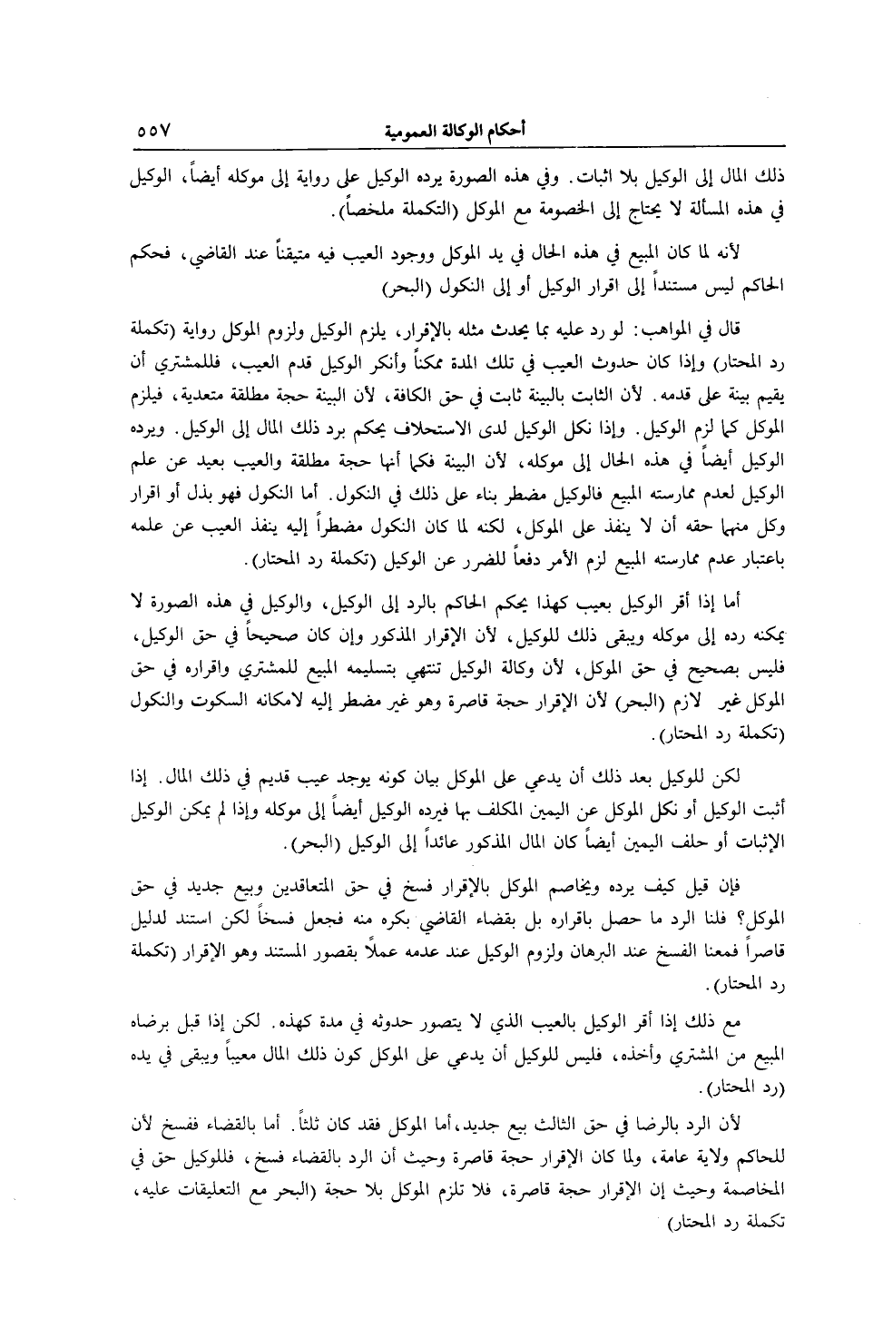 ذَلِكَ الْمَالِ إلَى الْوَكِيلِ بِلَا إثْبَاتٍ. وَفِي هَذِهِ الصُّورَةِ يَرُدُّهُ الْوَكِيلُ عَلَى رِوَايَةٍ إلَى مُوَكِّلِهِ أَيْضًا، الْوَكِيلُ فِي هَذِهِ الْمَسْأَلَةِ لَا يَحْتَاجُ إلَى الْخُصُومَةِ مَعَ الْمُوَكِّلِ (التَّكْمِلَةُ مُلَخَّصًا) ؛ لِأَنَّهُ لَمَّا كَانَ الْمَبِيعُ فِي هَذِهِ الْحَالِ فِي يَدِ الْمُوَكِّلِ وَوُجُودُ الْعَيْبِ فِيهِ مُتَيَقَّنًا عِنْدَ الْقَاضِي، فَحُكْمُ الْحَاكِمِ لَيْسَ مُسْتَنِدًا إلَى إقْرَارِ الْوَكِيلِ أَوْ إلَى النُّكُولِ (الْبَحْرُ) قَالَ فِي الْمَوَاهِبِ: لَوْ رُدَّ عَلَيْهِ بِمَا يَحْدُثُ مِثْلُهُ بِالْإِقْرَارِ، يَلْزَمُ الْوَكِيلَ وَلُزُومُ الْمُوَكِّلِ رِوَايَةً (تَكْمِلَةُ رَدِّ الْمُحْتَارِ) وَإِذَا كَانَ حُدُوثُ الْعَيْبِ فِي تِلْكَ الْمُدَّةِ مُمْكِنًا وَأَنْكَرَ الْوَكِيلُ قِدَمَ الْعَيْبِ، فَلِلْمُشْتَرِي أَنْ يُقِيمَ بَيِّنَةً عَلَى قِدَمِهِ؛ لِأَنَّ الثَّابِتَ بِالْبَيِّنَةِ ثَابِتٌ فِي حَقِّ الْكَافَّةِ؛ لِأَنَّ الْبَيِّنَةَ حُجَّةٌ مُطْلَقَةٌ مُتَعَدِّيَةٌ، فَيَلْزَمُ الْمُوَكِّلَ كَمَا لَزِمَ الْوَكِيلَ.