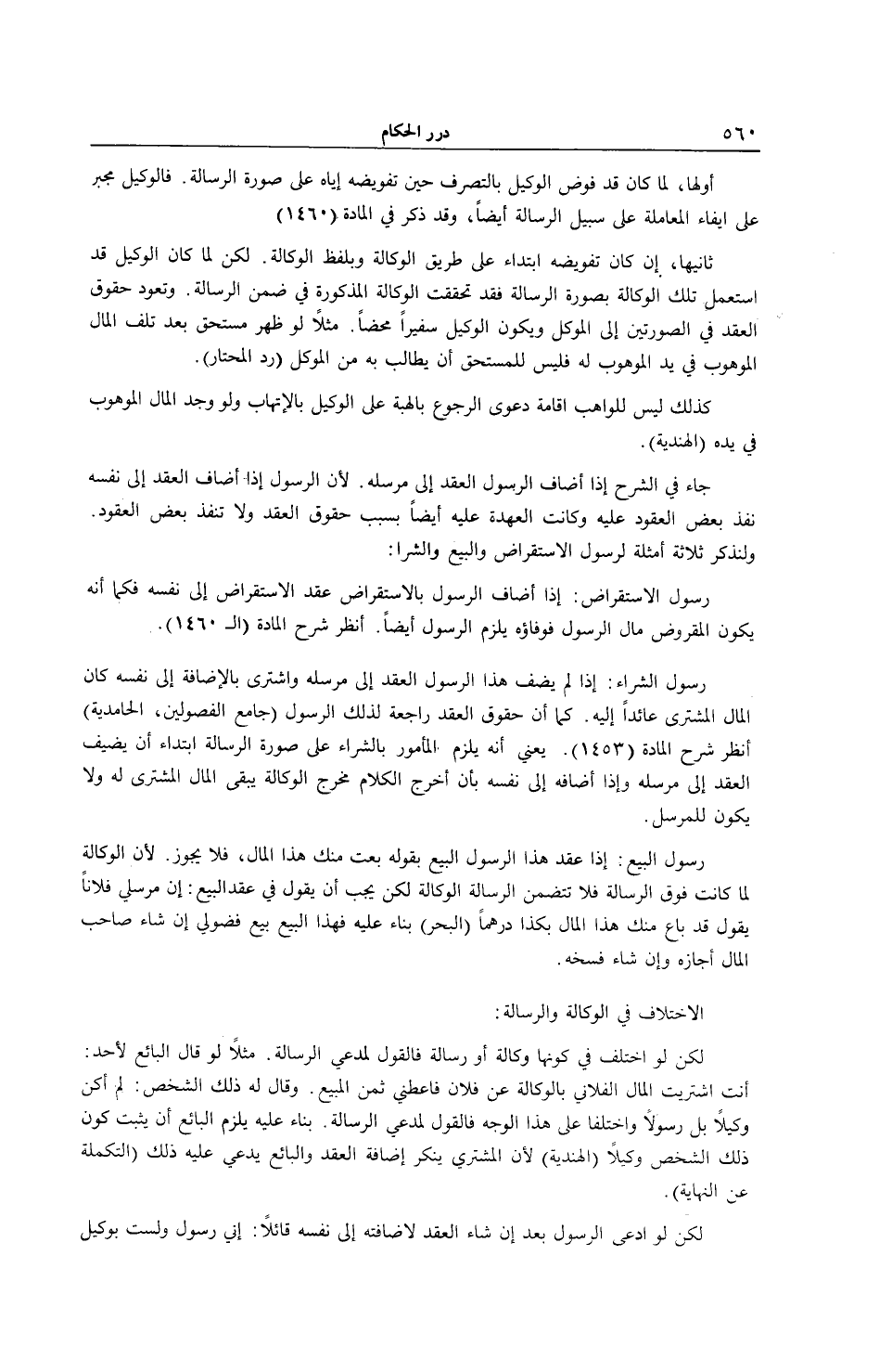 أَوَّلُهَا، لَمَّا كَانَ قَدْ فَوَّضَ الْوَكِيلَ بِالتَّصَرُّفِ حِينَ تَفْوِيضِهِ إيَّاهُ عَلَى صُورَةِ الرِّسَالَةِ. فَالْوَكِيلُ مُجْبَرٌ عَلَى إيفَاءِ الْمُعَامَلَةِ عَلَى سَبِيلِ الرِّسَالَةِ أَيْضًا، وَقَدْ ذُكِرَ فِي الْمَادَّةِ. (1460) ثَانِيهَا، إنْ كَانَ تَفْوِيضُهُ ابْتِدَاءً عَلَى طَرِيقِ الْوَكَالَةِ وَبِلَفْظِ الْوَكَالَةِ.