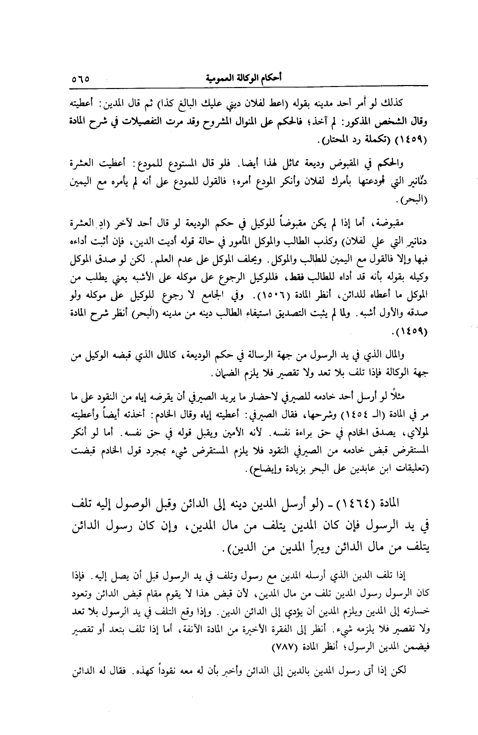 [ (الْمَادَّةُ 1464) أَرْسَلَ الْمَدِينُ دَيْنَهُ وَقَبْلَ الْوُصُولِ تَلِفَ فِي يَدِ الرَّسُولِ]