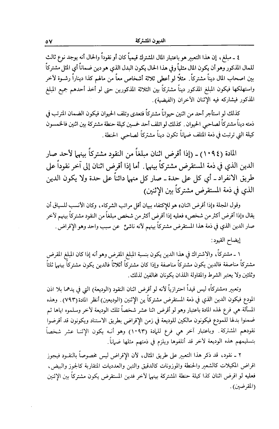1 - مُشْتَرَكًا. وَالِاشْتِرَاكُ فِي هَذَا الدَّيْنِ يَكُونُ بِنِسْبَةِ الْمَبْلَغِ الْمُقْرَضِ وَهُوَ أَنَّهُ إذَا كَانَ الْمَبْلَغُ الْمُقْرَضُ مُشْتَرَكًا مُنَاصَفَةً فَالدَّيْنُ يَكُونُ مُشْتَرَكًا مُنَاصَفَةً وَإِذَا كَانَ مُشْتَرَكًا أَثْلَاثًا فَالدَّيْنُ يَكُونُ مُشْتَرَكًا بَيْنَهُمَا ثُلُثًا وَثُلُثَيْنِ وَلَا يُعْتَبَرُ الشَّرْطُ وَالْمُقَاوَلَةُ اللَّذَانِ يَكُونَانِ مُخَالِفِينَ لِذَلِكَ. وَتَعْبِيرُ (مُشْتَرَكًا) لَيْسَ قَيْدًا احْتِرَازِيًّا لِأَنَّهُ لَوْ أَقْرَضَ اثْنَانِ النُّقُودَ (الْوَدِيعَةَ) الَّتِي فِي يَدِهِمَا بِلَا إذْنِ الْمُودِعِ فَيَكُونُ الدَّيْنُ الَّذِي فِي ذِمَّةِ الْمُسْتَقْرِضِ مُشْتَرَكًا بَيْنَ الِاثْنَيْنِ (الْوَدِيعَيْنِ) اُنْظُرْ الْمَادَّةَ (793) . وَهَذِهِ الْمَسْأَلَةُ هِيَ فَرْعٌ لِهَذِهِ الْمَادَّةِ بِاعْتِبَارٍ وَهُوَ لَوْ أَقْرَضَ اثْنَا عَشَرَ شَخْصًا تِلْكَ الْوَدِيعَةَ لِآخَرَ وَسَلَّمُوهُ إيَّاهَا ثُمَّ ضَمِنُوا بَدَلهَا لِلْمُودَعِ فَيَكُونُونَ مَالِكِينَ لِلْوَدِيعَةِ فِي زَمَنِ الْإِقْرَاضِ بِطَرِيقِ الِاسْتِنَادِ وَيَكُونُونَ قَدْ أَقْرَضُوا نُقُودَهُمْ الْمُشْتَرَكَةَ. وَبِاعْتِبَارٍ آخَرَ هِيَ فَرْعٌ لِلْمَادَّةِ (93 1) وَهُوَ أَنَّهُ يَكُونُ الِاثْنَا عَشَرَ شَخْصًا بِتَسْلِيمِهِمْ هَذِهِ الْوَدِيعَةِ لِآخَرَ قَدْ أَتْلَفُوهَا وَيَلْزَمُ فِي ذِمَّتِهِمْ مِثْلُهَا ضَمَانًا.