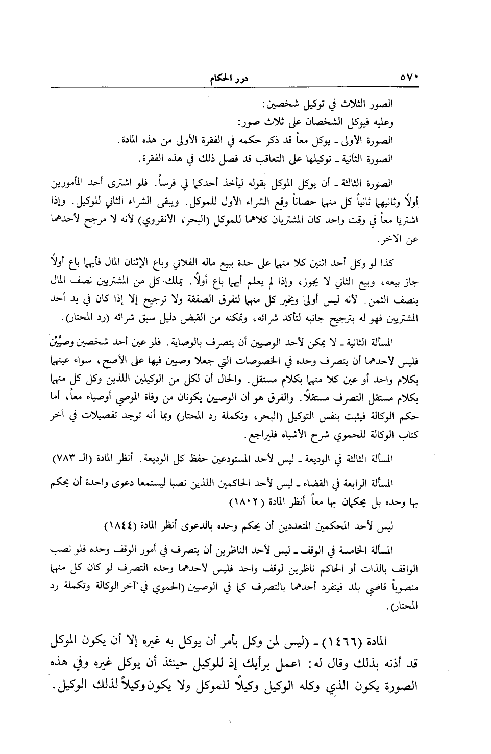 الصُّوَرُ الثَّلَاثُ فِي تَوْكِيلِ شَخْصَيْنِ: وَعَلَيْهِ فَيُوَكَّلُ الشَّخْصَانِ عَلَى ثَلَاثِ صُوَرٍ: الصُّورَةُ الْأُولَى: يُوَكِّلُ مَعًا قَدْ ذُكِرَ حُكْمُهُ فِي الْفِقْرَةِ الْأُولَى مِنْ هَذِهِ الْمَادَّةِ.