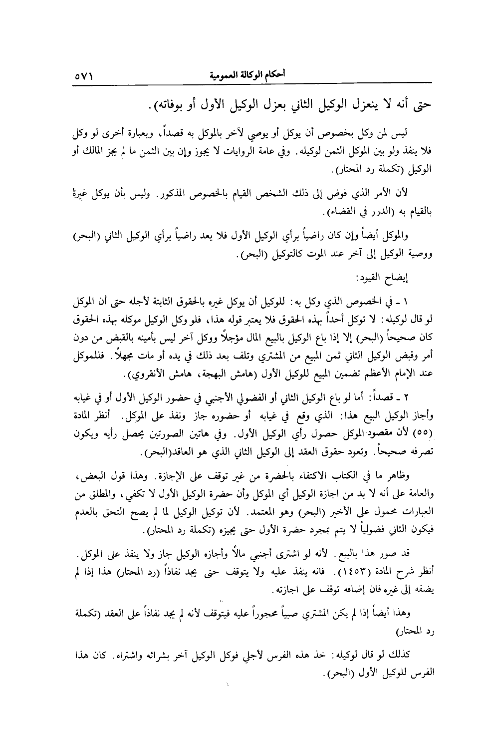 حَتَّى أَنَّهُ لَا يَنْعَزِلُ الْوَكِيلُ الثَّانِي بِعَزْلِ الْوَكِيلِ الْأَوَّلِ أَوْ بِوَفَاتِهِ) . لَيْسَ لِمَنْ وُكِّلَ بِخُصُوصٍ أَنْ يُوَكِّلَ أَوْ يُوصِيَ لِآخَرِ بِالْمُوَكَّلِ بِهِ قَصْدًا، وَبِعِبَارَةٍ أُخْرَى لَوْ وَكَّلَ فَلَا يَنْفُذُ وَلَوْ بَيَّنَ الْمُوكِلُ الثَّمَنَ لِوَكِيلِهِ. وَفِي عَامَّةِ الرِّوَايَاتِ لَا يَجُوزُ وَإِنْ بَيَّنَ الثَّمَنَ مَا لَمْ يُجِزْ الْمَالِكُ أَوْ الْوَكِيلُ (تَكْمِلَةُ رَدِّ الْمُحْتَارِ) ؛ لِأَنَّ الْأَمْرَ الَّذِي فُوِّضَ إلَى ذَلِكَ الشَّخْصِ الْقِيَامُ بِالْخُصُوصِ الْمَذْكُورِ. وَلَيْسَ بِأَنْ يُوَكِّلَ غَيْرَهُ بِالْقِيَامِ بِهِ (الدُّرَرُ فِي الْقَضَاءِ) . وَالْمُوَكِّلُ أَيْضًا وَإِنْ كَانَ رَاضِيًا بِرَأْيِ الْوَكِيلِ الْأَوَّلِ فَلَا يُعَدُّ رَاضِيًا بِرَأْيِ الْوَكِيلِ الثَّانِي (الْبَحْرُ) وَوَصِيَّةُ الْوَكِيلِ إلَى آخَرَ عِنْدَ الْمَوْتِ كَالتَّوْكِيلِ (الْبَحْرُ) . إيضَاحُ الْقُيُودِ: