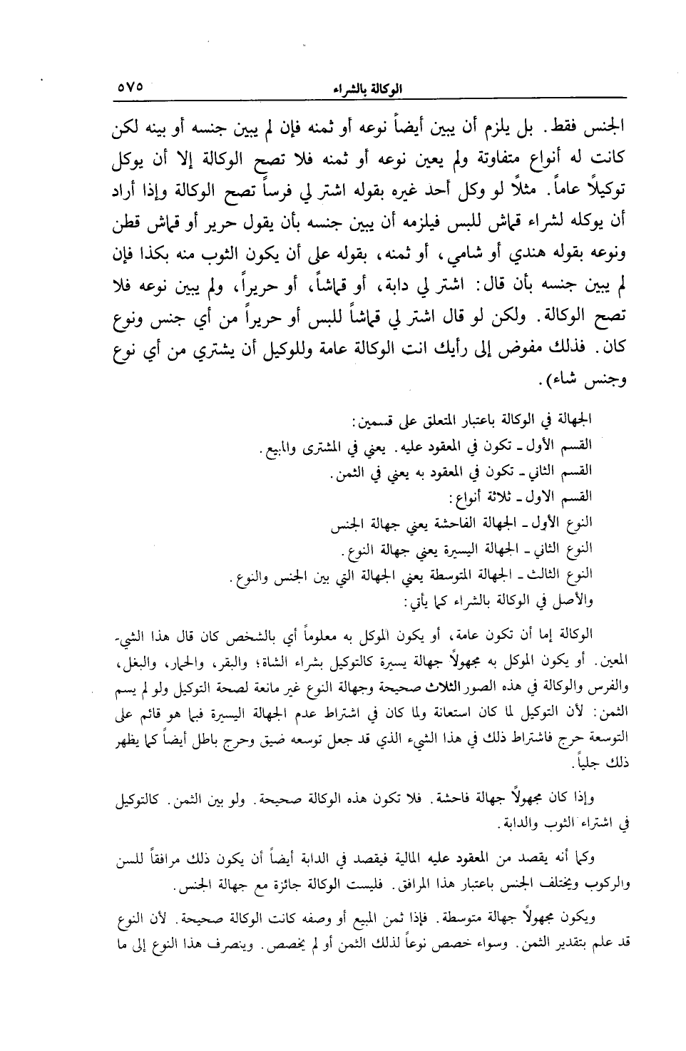 الْجِنْسِ فَقَطْ. بَلْ يَلْزَمُ أَنْ يُبَيِّنَ أَيْضًا نَوْعَهُ أَوْ ثَمَنَهُ فَإِنْ لَمْ يُبَيِّنْ جِنْسَهُ أَوْ بَيَّنَهُ لَكِنْ كَانَتْ لَهُ أَنْوَاعٌ مُتَفَاوِتَةٌ وَلَمْ يُعَيِّنْ نَوْعَهُ أَوْ ثَمَنَهُ فَلَا تَصِحُّ الْوَكَالَةُ إلَّا أَنْ يُوَكِّلَ تَوْكِيلًا عَامًّا. مَثَلًا لَوْ وَكَّلَ أَحَدٌ غَيْرَهُ بِقَوْلِهِ اشْتَرِ لِي فَرَسًا تَصِحُّ الْوَكَالَةُ وَإِذَا أَرَادَ أَنْ يُوَكِّلَهُ لِشِرَاءِ قُمَاشٍ لِلُّبْسِ فَيَلْزَمُهُ أَنْ يُبَيِّنَ جِنْسَهُ بِأَنْ يَقُولَ: حَرِيرٌ أَوْ قُمَاشُ قُطْنٍ وَنَوْعَهُ بِقَوْلِهِ: هِنْدِيٌّ أَوْ شَامِيٌّ، أَوْ ثَمَنَهُ، بِقَوْلِهِ عَلَى أَنْ يَكُونَ الثَّوْبُ مِنْهُ بِكَذَا فَإِنْ لَمْ يُبَيِّنْ جِنْسَهُ بِأَنْ قَالَ: اشْتَرِ لِي دَابَّةً، أَوْ قُمَاشًا، أَوْ حَرِيرًا، وَلَمْ يُبَيِّنْ نَوْعَهُ فَلَا تَصِحُّ الْوَكَالَةُ. لَكِنْ لَوْ قَالَ: اشْتَرِ لِي قُمَاشًا لِلُّبْسِ أَوْ حَرِيرًا مِنْ أَيِّ جِنْسٍ وَنَوْعٍ كَانَ. فَذَلِكَ مُفَوَّضٌ إلَى رَأْيِك أَنْتَ الْوَكَالَةُ عَامَّةٌ وَلِلْوَكِيلِ أَنْ يَشْتَرِيَ مِنْ أَيِّ نَوْعٍ وَجِنْسٍ شَاءَ) .