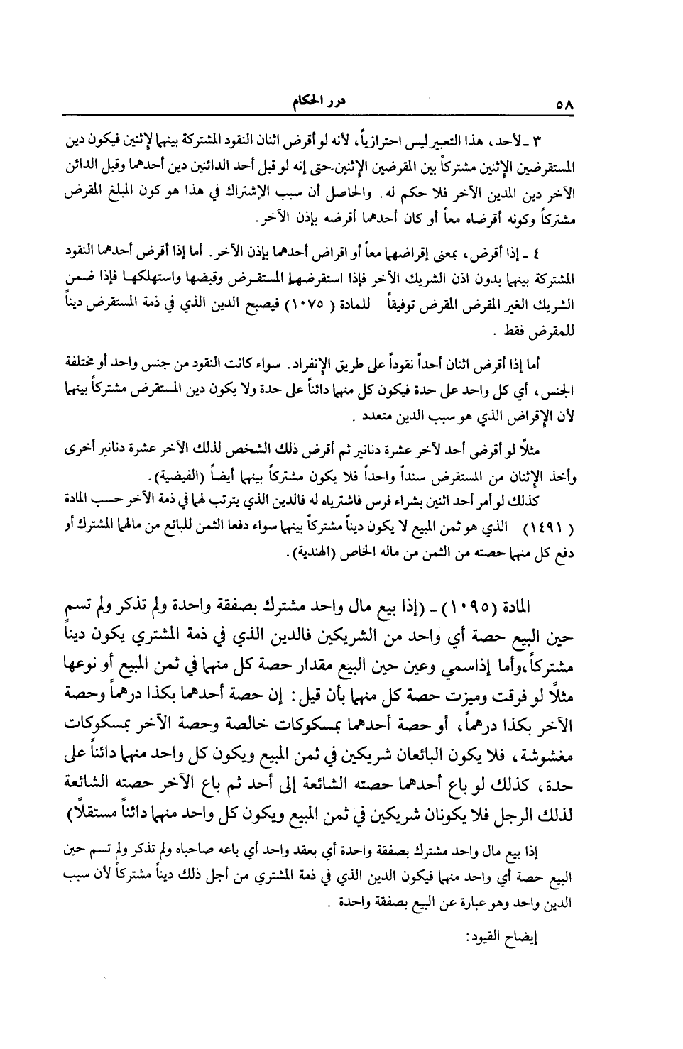 4 - إذَا أَقْرَضَ، بِمَعْنَى إقْرَاضِهِمَا مَعًا أَوْ إقْرَاضِ أَحَدِهِمَا بِإِذْنِ الْآخَرِ. أَمَّا إذَا أَقْرَضَ أَحَدُهُمَا النُّقُودَ الْمُشْتَرَكَةَ بَيْنَهُمَا بِدُونِ إذْنِ الشَّرِيكِ الْآخَرِ فَإِذَا اسْتَقْرَضَهُمَا الْمُسْتَقْرِضُ وَقَبَضَهَا وَاسْتَهْلَكَهَا فَإِذَا ضَمِنَ الشَّرِيكُ الْغَيْرُ الْمُقْرِضِ الْمُقْرَضَ تَوْفِيقًا لِلْمَادَّةِ (75 1) فَيُصْبِحُ الدَّيْنُ الَّذِي فِي ذِمَّةِ الْمُسْتَقْرِضِ دَيْنًا لِلْمُقْرِضِ فَقَطْ. أَمَّا إذَا أَقْرَضَ اثْنَانِ أَحَدًا نُقُودًا عَلَى طَرِيقِ الِانْفِرَادِ. سَوَاءٌ كَانَتْ النُّقُودُ مِنْ جِنْسٍ وَاحِدٍ أَوْ مُخْتَلِفَةَ الْجِنْسِ، أَيْ كُلُّ وَاحِدٍ عَلَى حِدَةٍ فَيَكُونُ كُلٌّ مِنْهُمَا دَائِنًا عَلَى حِدَةٍ وَلَا يَكُونُ دَيْنُ الْمُسْتَقْرِضِ مُشْتَرَكًا بَيْنَهُمَا لِأَنَّ الْإِقْرَاضَ الَّذِي هُوَ سَبَبُ الدَّيْنِ مُتَعَدِّدٌ، مَثَلًا لَوْ أَقْرَضَ أَحَدٌ لِآخَرَ عَشَرَةَ دَنَانِيرَ ثُمَّ أَقْرَضَ ذَلِكَ الشَّخْصُ لِذَلِكَ الْآخَرِ عَشَرَةَ دَنَانِيرَ أُخْرَى وَأَخَذَ الِاثْنَانِ مِنْ الْمُسْتَقْرِضِ سَنَدًا وَاحِدًا فَلَا يَكُونُ مُشْتَرَكًا بَيْنَهُمَا أَيْضًا (الْفَيْضِيَّةُ) . كَذَلِكَ لَوْ أَمَرَ أَحَدٌ اثْنَيْنِ بِشِرَاءِ فَرَسٍ فَاشْتَرَيَاهُ لَهُ فَالدَّيْنُ الَّذِي يَتَرَتَّبُ لَهُمَا فِي ذِمَّةِ الْآخَرِ حَسَبِ الْمَادَّةِ (1 49 1) الَّذِي هُوَ ثَمَنُ الْمَبِيعِ لَا يَكُونُ دَيْنًا مُشْتَرَكًا بَيْنَهُمَا سَوَاءٌ دَفَعَا الثَّمَنَ لِلْبَائِعِ مِنْ مَالِهِمَا الْمُشْتَرَكِ أَوْ دَفَعَ كُلٌّ مِنْهُمَا حِصَّتَهُ مِنْ الثَّمَنِ مِنْ مَالِهِ الْخَاصِّ (الْهِنْدِيَّةُ) . .