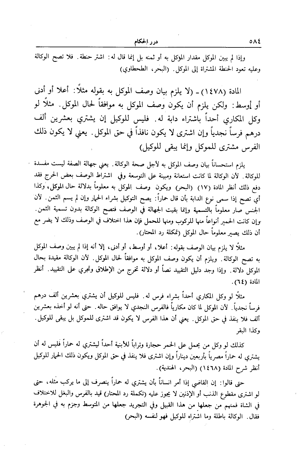 الْمَادَّةُ (1478) - (لَا يَلْزَمُ بَيَانُ وَصْفِ الْمُوَكَّلِ بِهِ بِقَوْلِهِ مَثَلًا: أَعْلَى أَوْ أَدْنَى أَوْ أَوْسَطُ: وَلَكِنْ يَلْزَمُ أَنْ يَكُونَ وَصْفُ الْمُوَكَّلِ بِهِ مُوَافِقًا لِحَالِ الْمُوَكِّلِ مَثَلًا لَوْ وَكَّلَ الْمُكَارِي أَحَدًا بِاشْتِرَاءِ دَابَّةٍ لَهُ. فَلَيْسَ لِلْوَكِيلِ أَنْ يَشْتَرِيَ بِعِشْرِينَ أَلْفَ دِرْهَمٍ فَرَسًا نَجْدِيًّا وَإِنْ اشْتَرَى لَا يَكُونُ نَافِذًا فِي حَقِّ الْمُوَكِّلِ. يَعْنِي لَا يَكُونُ ذَلِكَ الْفَرَسُ مُشْتَرًى لِلْمُوَكِّلِ وَإِنَّمَا يَبْقَى لِلْوَكِيلِ) يَلْزَمُ اسْتِحْسَانًا بَيَانُ وَصْفِ الْمُوَكَّلِ بِهِ لِأَجْلِ صِحَّةِ الْوَكَالَةِ يَعْنِي جَهَالَةُ الصِّفَةِ لَيْسَتْ مُفْسِدَةً لِلْوَكَالَةِ؛ لِأَنَّ الْوَكَالَةَ لَمَّا كَانَتْ اسْتِعَانَةً وَمُبَيَّنَةً عَلَى التَّوْسِعَةِ وَفِي اشْتِرَاطِ الْوَصْفِ بَعْضُ الْحَرَجِ فَقَدْ دَفَعَ ذَلِكَ اُنْظُرْ الْمَادَّةَ (17) (الْبَحْرُ) وَيَكُونُ وَصْفُ الْمُوَكَّلِ بِهِ مَعْلُومًا بِدَلَالَةِ حَالِ الْمُوَكِّلِ، وَكَذَا أَيْ تَصِحُّ إذَا سَمَّى نَوْعَ الدَّابَّةِ بِأَنْ قَالَ حِمَارًا: يَصِحُّ التَّوْكِيلُ بِشِرَاءِ الْحِمَارِ وَإِنْ لَمْ يُسَمِّ الثَّمَنَ؛ لِأَنَّ الْجِنْسَ صَارَ مَعْلُومًا بِالتَّسْمِيَةِ وَإِنَّمَا بَقِيَتْ الْجَهَالَةُ فِي الْوَصْفِ فَتَصِحُّ الْوَكَالَةُ بِدُونِ تَسْمِيَةِ الثَّمَنِ. وَإِنْ كَانَتْ الْحَمِيرُ أَنْوَاعًا مِنْهَا لِلرُّكُوبِ وَمِنْهَا لِلْحَمْلِ فَإِنَّ هَذَا اخْتِلَافٌ فِي الْوَصْفِ وَذَلِكَ لَا يَضُرُّ مَعَ أَنَّ ذَلِكَ يَصِيرُ مَعْلُومًا حَالَ الْمُوَكِّلِ (تَكْمِلَةُ رَدِّ الْمُحْتَارِ) . مَثَلًا لَا يَلْزَمُ بَيَانُ الْوَصْفِ بِقَوْلِهِ: أَعْلَى، أَوْ أَوْسَطُ، أَوْ أَدْنَى، إلَّا أَنَّهُ إذَا لَمْ يُبَيِّنْ وَصْفَ الْمُوَكَّلِ بِهِ تَصِحُّ الْوَكَالَةُ. وَيَلْزَمُ أَنْ يَكُونَ وَصْفُ الْمُوَكَّلِ بِهِ مُوَافِقًا لِحَالِ الْمُوَكِّل لِأَنَّ الْوَكَالَةَ مُقَيَّدَةٌ بِحَالِ الْمُوَكِّلِ دَلَالَةً. وَإِذَا وُجِدَ دَلِيلُ التَّقْيِيدِ نَصَّا أَوْ دَلَالَةً تَخْرُجُ مِنْ الْإِطْلَاقِ وَتَجْرِي عَلَى التَّقْيِيدِ. اُنْظُرْ الْمَادَّةَ (64) . مَثَلًا لَوْ وَكَّلَ الْمُكَارِي أَحَدًا بِشِرَاءِ فَرَسٍ لَهُ. فَلَيْسَ لِلْوَكِيلِ أَنْ يَشْتَرِيَ بِعِشْرِينَ أَلْفَ دِرْهَمٍ فَرَسًا نَجْدِيًّا؛ لِأَنَّ الْمُوَكِّلَ لَمَّا كَانَ مُكَارِيًا فَالْفَرَسُ النَّجْدِيُّ لَا يُوَافِقُ. حَتَّى أَنَّهُ لَوْ أَخَذَهُ بِعِشْرِينَ أَلْفًا فَلَا يَنْفُذُ فِي حَقِّ الْمُوَكِّلِ. يَعْنِي أَنَّ هَذَا الْفَرَسَ لَا يَكُونُ قَدْ اُشْتُرِيَ لِلْمُوَكِّلِ بَلْ يَبْقَى لِلْوَكِيلِ. وَكَذَا الْبَقَرُ كَذَلِكَ لَوْ وَكَّلَ مَنْ يَحْمِلُ عَلَى الْحُمُرِ حِجَارَةً وَتُرَابًا لِلْأَبْنِيَةِ أَحَدًا لِيَشْتَرِيَ لَهُ حِمَارًا فَلَيْسَ لَهُ أَنْ يَشْتَرِيَ لَهُ حِمَارًا مِصْرِيًّا بِأَرْبَعِينَ دِينَارًا وَإِنْ اشْتَرَى فَلَا يَنْفُذُ فِي حَقِّ الْمُوَكِّلِ وَيَكُونُ ذَلِكَ الْحِمَارُ لِلْوَكِيلِ اُنْظُرْ شَرْحَ الْمَادَّةِ (1468) (الْبَحْرُ، الْهِنْدِيَّةُ) .