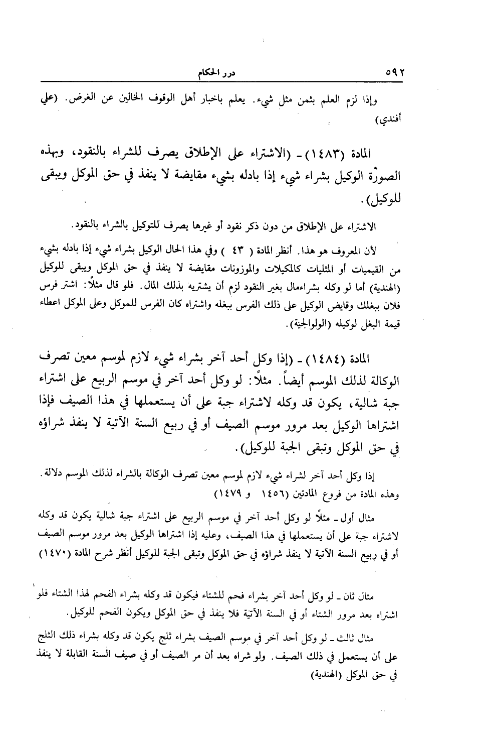 الْمَادَّةُ (1484) - (إذَا وَكَّلَ أَحَدٌ آخَرَ بِشِرَاءِ شَيْءٍ لَازِمٍ لِمَوْسِمٍ مُعَيَّنٍ تُصْرَفُ الْوَكَالَةُ لِذَلِكَ الْمَوْسِمِ أَيْضًا. مَثَلًا: لَوْ وَكَّلَ أَحَدٌ آخَرَ فِي مَوْسِمِ الرَّبِيعِ عَلَى اشْتِرَاءِ جُبَّةٍ شَالِيَّةٍ، يَكُونُ قَدْ وَكَّلَهُ لِاشْتِرَاءِ جُبَّةٍ عَلَى أَنْ يَسْتَعْمِلَهَا فِي هَذَا الصَّيْفِ، فَإِذَا اشْتَرَاهَا الْوَكِيلُ بَعْدَ مُرُورِ مَوْسِمِ الصَّيْفِ أَوْ فِي رَبِيعِ السَّنَةِ الْآتِيَةِ لَا يَنْفُذُ شِرَاؤُهُ فِي حَقِّ الْمُوَكِّلِ وَتَبْقَى الْجُبَّةُ لِلْوَكِيلِ) . إذَا وَكَّلَ أَحَدٌ آخَرَ لِشِرَاءِ شَيْءٍ لَازِمٍ لِمَوْسِمٍ مُعَيَّنٍ تُصْرَفُ الْوَكَالَةُ بِالشِّرَاءِ لِذَلِكَ الْمَوْسِمِ دَلَالَةً. وَهَذِهِ الْمَادَّةُ مِنْ فُرُوعِ الْمَادَّتَيْنِ (1456 و 1479) مِثَالٌ أَوَّلٌ - مَثَلًا لَوْ وَكَّلَ أَحَدٌ آخَرَ فِي مَوْسِمِ الرَّبِيعِ عَلَى اشْتِرَاءِ جُبَّةٍ شَالِيَّةٍ يَكُونُ قَدْ وَكَّلَهُ لِاشْتِرَاءِ جُبَّةٍ عَلَى أَنْ يَسْتَعْمِلَهَا فِي هَذَا الصَّيْفِ، وَعَلَيْهِ إذَا اشْتَرَاهَا الْوَكِيلُ بَعْدَ مُرُورِ مَوْسِمِ الصَّيْفِ أَوْ فِي رَبِيعِ السَّنَةِ الْآتِيَةِ لَا يَنْفُذُ شِرَاؤُهُ فِي حَقِّ الْمُوَكِّلِ وَتَبْقَى الْجُبَّةُ لِلْوَكِيلِ اُنْظُرْ شَرْحَ الْمَادَّةِ (1470) مِثَالٌ ثَانٍ - لَوْ وَكَّلَ أَحَدٌ آخَرَ بِشِرَاءِ فَحْمٍ لِلشِّتَاءِ فَيَكُونُ قَدْ وَكَّلَهُ بِشِرَاءِ الْفَحْمِ لِهَذَا الشِّتَاءِ فَلَوْ اشْتَرَاهُ بَعْدَ مُرُورِ الشِّتَاءِ أَوْ فِي السَّنَةِ الْآتِيَةِ فَلَا يَنْفُذُ فِي حَقِّ الْمُوَكِّلِ وَيَكُونُ الْفَحْمُ لِلْوَكِيلِ. مِثَالٌ ثَالِثٌ - لَوْ وَكَّلَ أَحَدٌ آخَرَ فِي مَوْسِمِ الصَّيْفِ بِشِرَاءِ ثَلْجٍ يَكُونُ قَدْ وَكَّلَهُ بِشِرَاءِ ذَلِكَ الثَّلْجِ عَلَى أَنْ يُسْتَعْمَلَ فِي ذَلِكَ الصَّيْفِ وَلَوْ شَرَاهُ بَعْدَ أَنْ مَرَّ الصَّيْفُ أَوْ فِي صَيْفِ السَّنَةِ الْقَابِلَةِ لَا يَنْفُذُ فِي حَقِّ الْمُوَكِّلِ (الْهِنْدِيَّةُ)