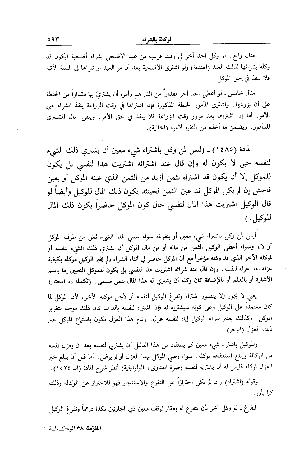 الْمَادَّةُ (1485) - (لَيْسَ لِمَنْ وُكِّلَ بِاشْتِرَاءِ شَيْءٍ مُعَيَّنٍ أَنْ يَشْتَرِيَ ذَلِكَ الشَّيْءَ لِنَفْسِهِ حَتَّى لَا يَكُونَ لَهُ وَإِنْ قَالَ: عِنْدَ اشْتِرَائِهِ اشْتَرَيْتُ هَذَا لِنَفْسِي بَلْ يَكُونُ لِلْمُوَكِّلِ إلَّا أَنْ يَكُونَ قَدْ اشْتَرَاهُ بِثَمَنٍ أَزْيَدَ مِنْ الثَّمَنِ الَّذِي عَيَّنَهُ الْمُوَكِّلُ أَوْ بِغَبْنٍ فَاحِشٍ إنْ لَمْ يَكُنْ الْمُوَكِّلُ قَدْ عَيَّنَ الثَّمَنَ فَحِينَئِذٍ يَكُونُ ذَلِكَ الْمَالُ لِلْوَكِيلِ وَأَيْضًا لَوْ قَالَ الْوَكِيلُ اشْتَرَيْت هَذَا الْمَالَ لِنَفْسِي حَالٍ كَوْنِ الْمُوَكِّلِ حَاضِرًا يَكُونُ ذَلِكَ الْمَالُ لِلْوَكِيلِ) لَيْسَ لِمَنْ وُكِّلَ بِاشْتِرَاءِ شَيْءٍ مُعَيَّنٍ، أَوْ بِتَفَرُّغِهِ سَوَاءٌ سُمِّيَ لِهَذَا الشَّيْءِ ثَمَنٌ مِنْ طَرَفِ الْمُوَكِّلِ أَوْ لَا، وَسَوَاءٌ أَعْطَى الْوَكِيلُ الثَّمَنَ مِنْ مَالِهِ أَوْ مِنْ مَالِ الْمُوَكِّلِ أَنْ يَشْتَرِيَ ذَلِكَ الشَّيْءَ لِنَفْسِهِ أَوْ لِمُوَكِّلِهِ الْآخَرَ الَّذِي قَدْ وَكَّلَهُ مُؤَخَّرًا مَعَ أَنَّ الْمُوَكِّلَ حَاضِرٌ فِي أَثْنَاءِ الشِّرَاءِ وَلَمْ يُخْبِرْ الْوَكِيلُ مُوَكِّلُهُ بِكَيْفِيَّةِ عَزْلِهِ بَعْدَ عَزْلِهِ لِنَفْسِهِ. وَإِنْ قَالَ: عِنْدَ شِرَائِهِ اشْتَرَيْت هَذَا لِنَفْسِي بَلْ يَكُونُ لِلْمُوَكِّلِ التَّعْيِينُ إمَّا بِاسْمِ الْإِشَارَةِ أَوْ بِالْعَلَمِ أَوْ بِالْإِضَافَةِ كَانَ وَكَّلَهُ أَنْ يَشْتَرِيَ لَهُ هَذَا الْمَالَ بِثَمَنٍ مُسَمًّى (تَكْمِلَةُ رَدِّ الْمُحْتَارِ) يَعْنِي لَا يَجُوزُ وَلَا يُتَصَوَّرُ اشْتِرَاءُ وَتَفَرُّغُ الْوَكِيلِ لِنَفْسِهِ أَوْ لِأَجْلِ مُوَكَّلِهِ الْآخَرِ؛ لِأَنَّ الْمُوَكِّلَ لَمَّا كَانَ مُعْتَمِدًا عَلَى الْوَكِيلِ وَعَلَى كَوْنِهِ سَيَشْتَرِيهِ لَهُ، فَإِذَا اشْتَرَاهُ لِنَفْسِهِ بِالذَّاتِ كَانَ ذَلِكَ مُوجِبًا لِتَغْرِيرِ الْمُوَكِّلِ.
