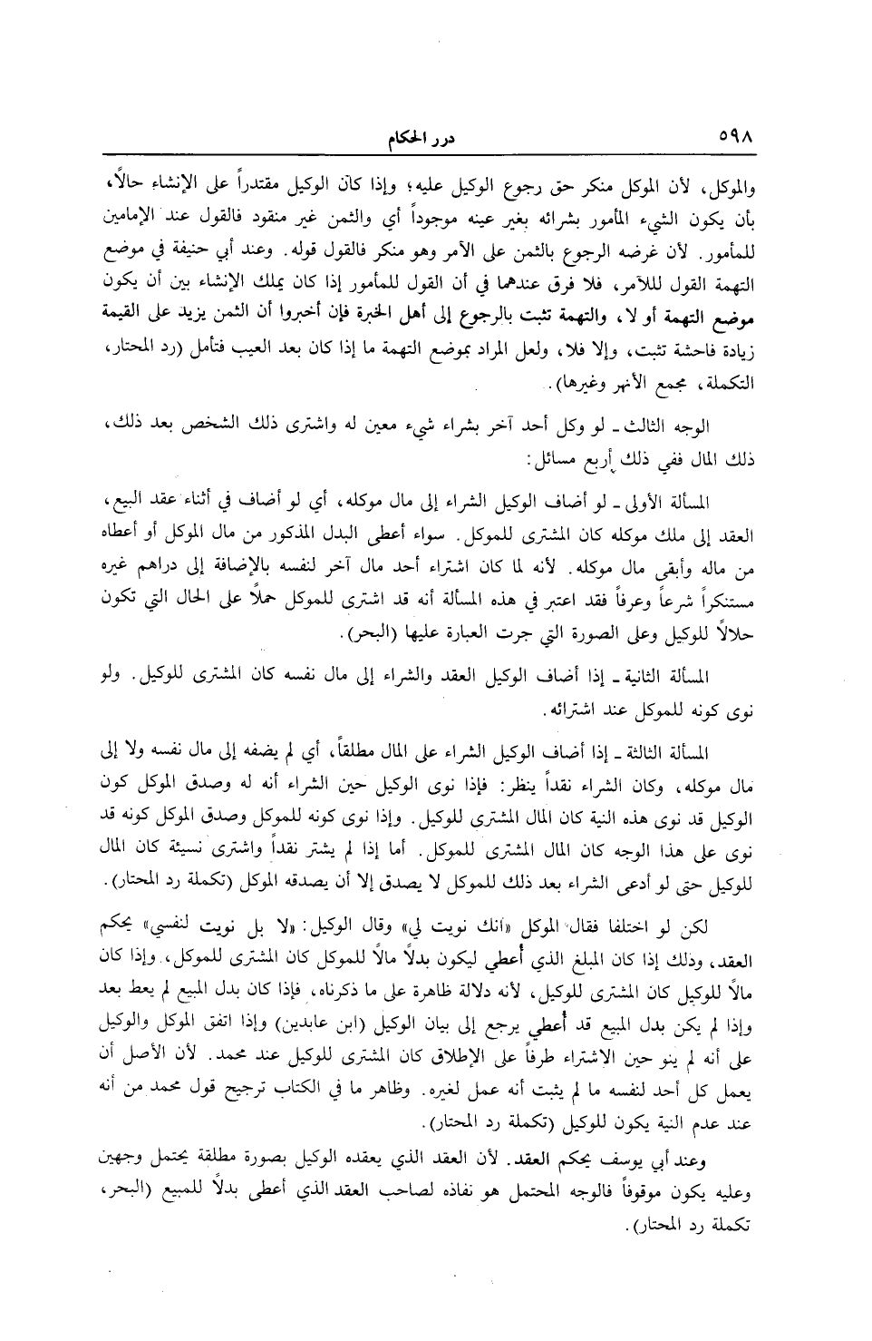 وَعِنْدَ أَبِي حَنِيفَةَ فِي مَوْضِعِ التُّهْمَةِ الْقَوْلُ لِلْآمِرِ، فَلَا فَرْقَ عِنْدَهُمَا فِي أَنَّ الْقَوْلَ لِلْمَأْمُورِ إذَا كَانَ يَمْلِكُ الْإِنْشَاءَ بَيْنَ أَنْ يَكُونَ مَوْضِعَ التُّهْمَةِ أَوْ لَا، وَالتُّهْمَةُ تَثْبُتُ بِالرُّجُوعِ إلَى أَهْلِ الْخِبْرَةِ فَإِنْ أَخْبَرُوا أَنَّ الثَّمَنَ يَزِيدُ عَلَى الْقِيمَةِ زِيَادَةً فَاحِشَةً تَثْبُتُ، وَإِلَّا فَلَا، وَلَعَلَّ الْمُرَادَ بِمَوْضِعِ التُّهْمَةِ مَا إذَا كَانَ بَعْدَ الْعَيْبِ فَتَأَمَّلْ (رَدُّ الْمُحْتَارِ، التَّكْمِلَةُ، مَجْمَعُ الْأَنْهُرِ وَغَيْرُهَا) . الْوَجْهُ الثَّالِثُ - لَوْ وَكَّلَ أَحَدٌ آخَرَ بِشِرَاءِ شَيْءٍ مُعَيَّنٍ لَهُ وَاشْتَرَى ذَلِكَ الشَّخْصُ بَعْدَ ذَلِكَ، ذَلِكَ الْمَالَ فَفِي ذَلِكَ أَرْبَعُ مَسَائِلَ: الْمَسْأَلَةُ الْأُولَى - لَوْ أَضَافَ الْوَكِيلُ الشِّرَاءَ إلَى مَالِ مُوَكِّلِهِ، أَيْ لَوْ أَضَافَ فِي أَثْنَاءِ عَقْدِ الْبَيْعِ، الْعَقْدَ إلَى مِلْكِ مُوَكِّلِهِ كَانَ الْمُشْتَرَى لِلْمُوَكِّلِ. سَوَاءٌ أَعْطَى الْبَدَلَ الْمَذْكُورَ مِنْ مَالِ الْمُوَكِّلِ أَوْ أَعْطَاهُ مِنْ مَالِهِ وَأَبْقَى مَالَ مُوَكِّلِهِ؛ لِأَنَّهُ لَمَّا كَانَ اشْتِرَاءُ أَحَدٍ مَالَ آخَرَ لِنَفْسِهِ بِالْإِضَافَةِ إلَى دَرَاهِمِ غَيْرِهِ مُسْتَنْكَرًا شَرْعًا وَعُرْفًا فَقَدْ اُعْتُبِرَ فِي هَذِهِ الْمَسْأَلَةِ أَنَّهُ قَدْ اشْتَرَى لِلْمُوَكِّلِ حَمْلًا عَلَى الْحَالِ الَّتِي تَكُونُ حَلَالًا لِلْوَكِيلِ وَعَلَى الصُّورَةِ الَّتِي جَرَتْ الْعِبَارَةُ عَلَيْهَا (الْبَحْرُ) . الْمَسْأَلَةُ الثَّانِيَةُ - إذَا أَضَافَ الْوَكِيلُ الْعَقْدَ وَالشِّرَاءَ إلَى مَالِ نَفْسِهِ كَانَ الْمُشْتَرَى لِلْوَكِيلِ. وَلَوْ نَوَى كَوْنَهُ لِلْمُوَكِّلِ عِنْدَ اشْتِرَائِهِ.
